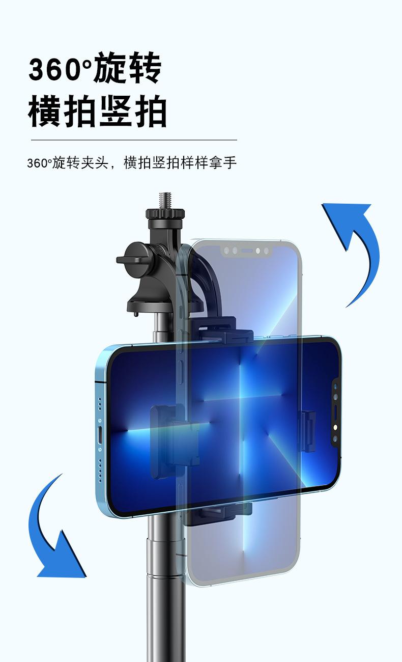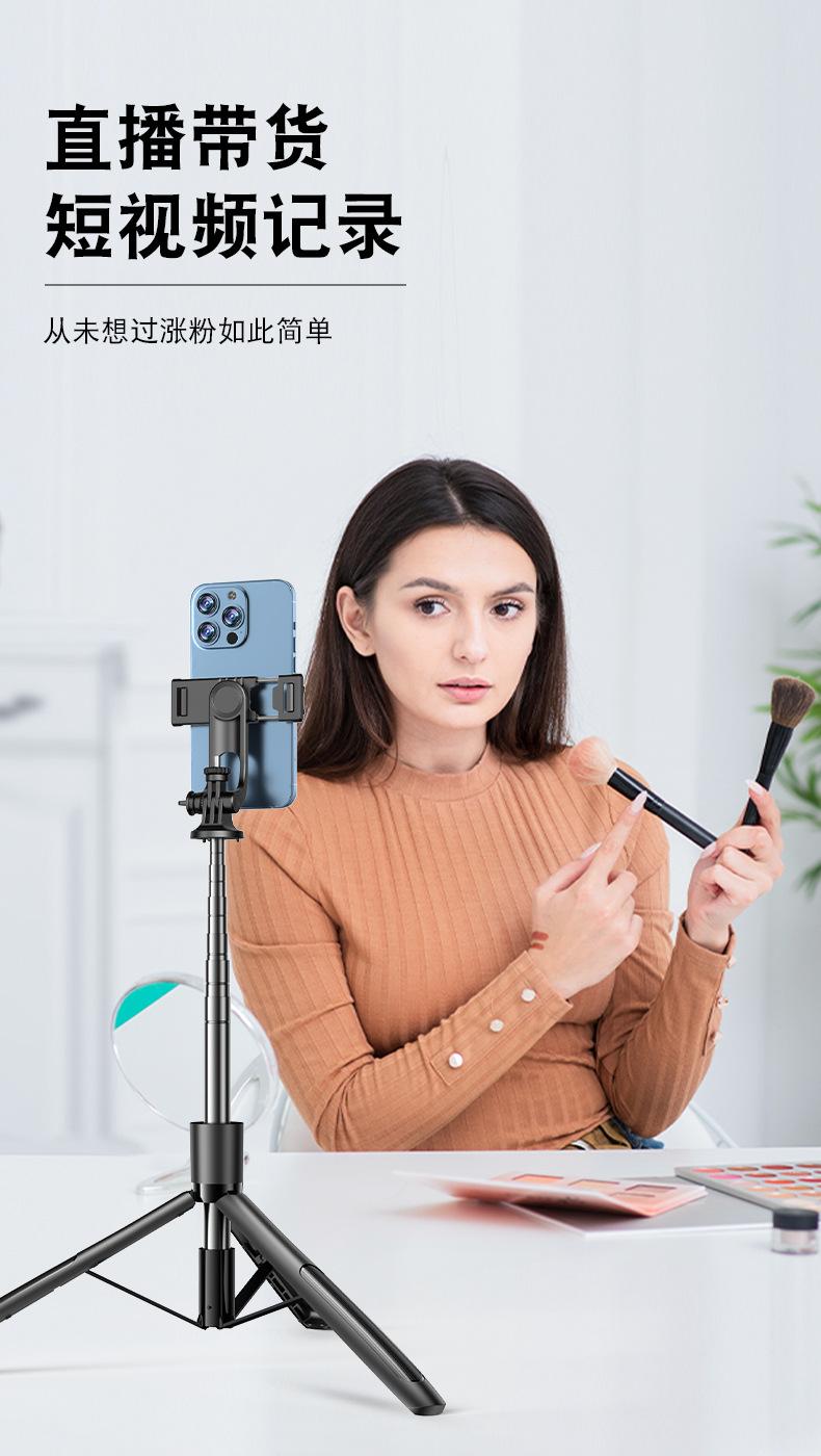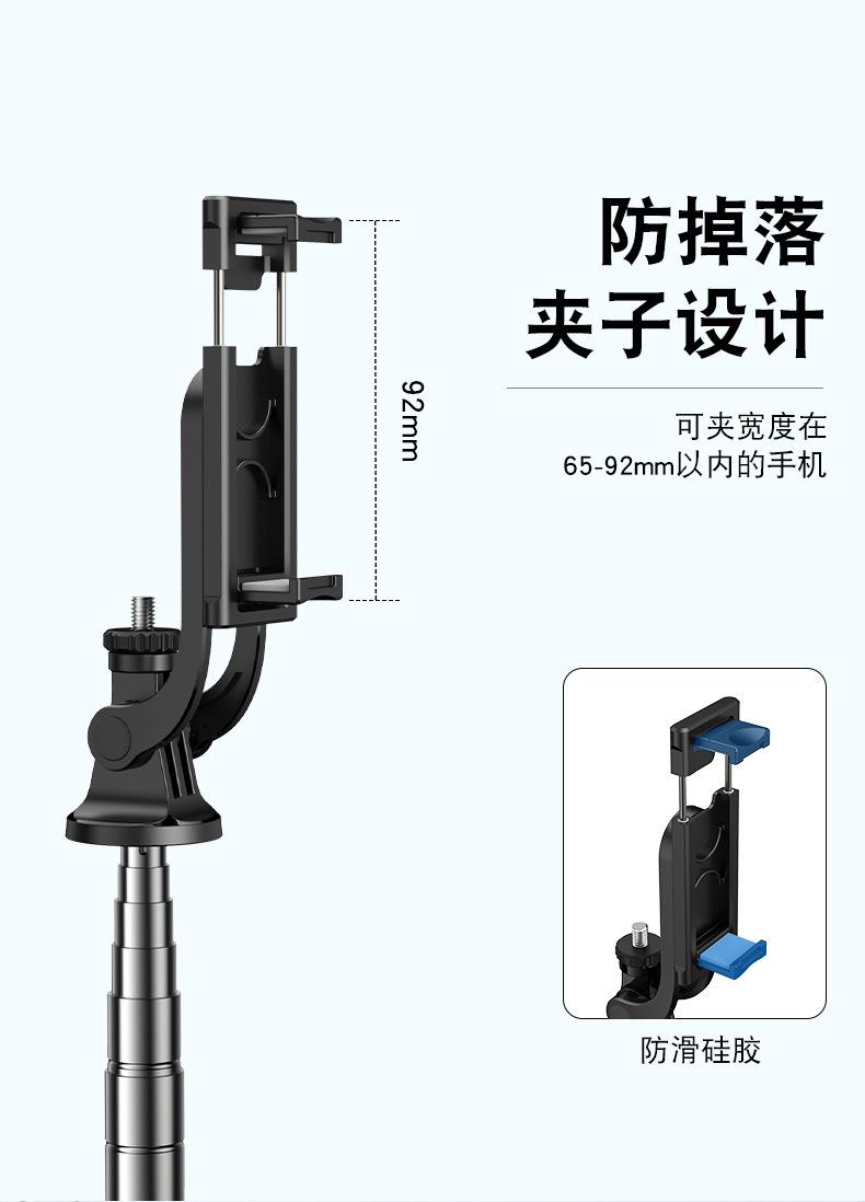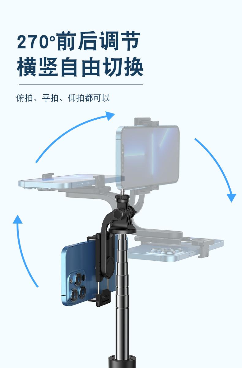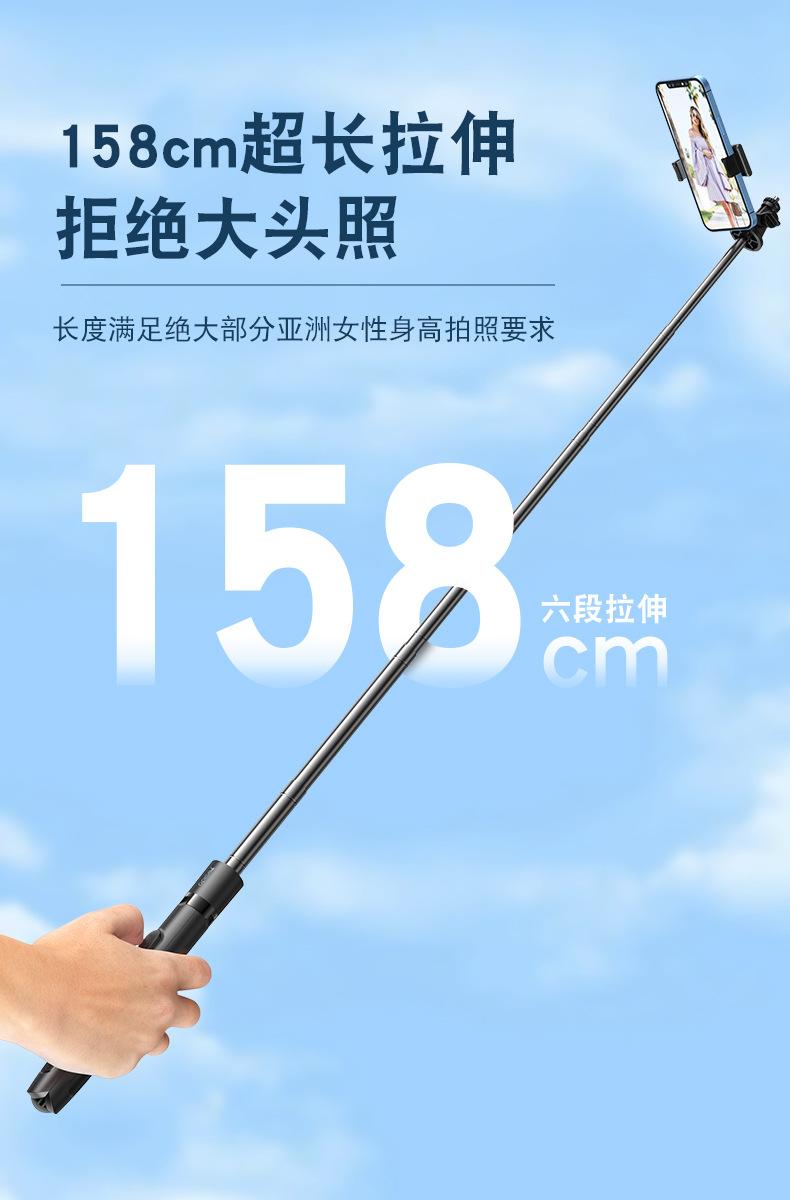 Soporte retráctil para selfies y transmisión en vivo, posicionamiento triangular, estable. La longitud máxima de extensión es de 158 cm. La parte superior tiene posiciones de tornillo reservadas para grabadoras de video, cámaras, luces de relleno y otros equipos. Especialmente adecuado para exteriores y transmisión en vivo.