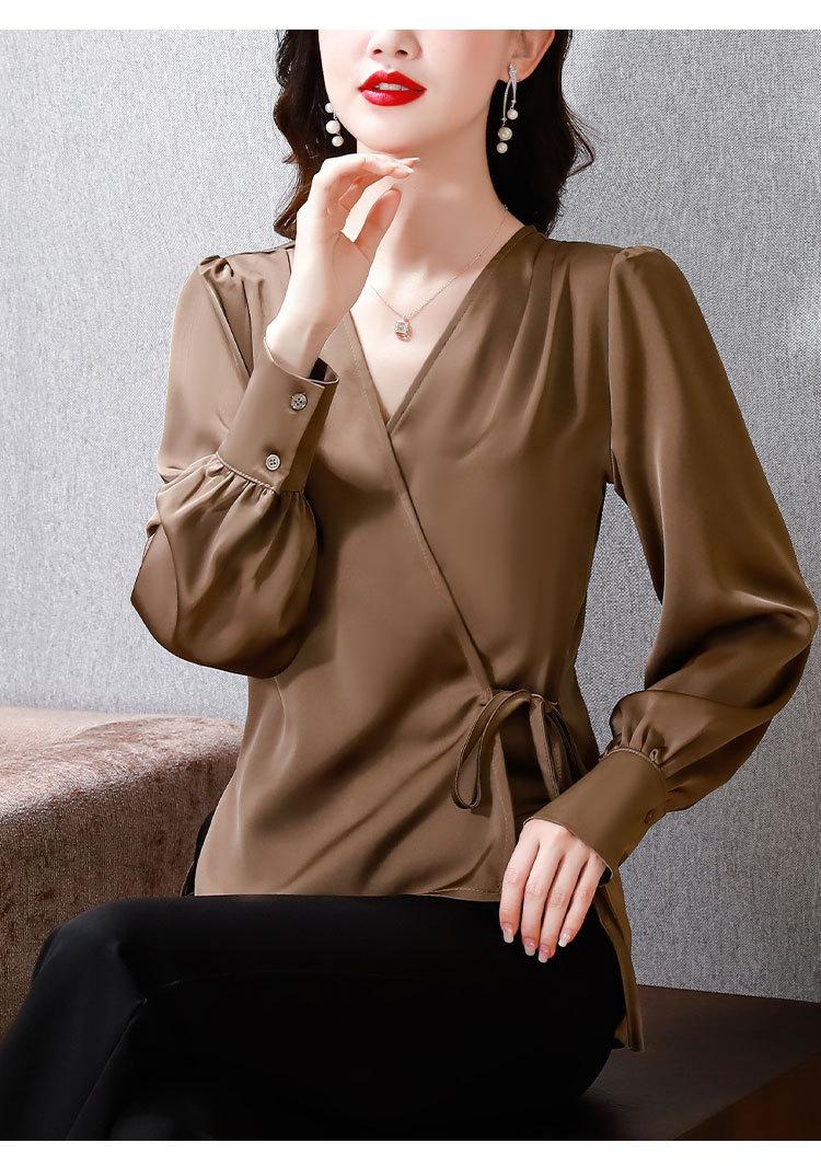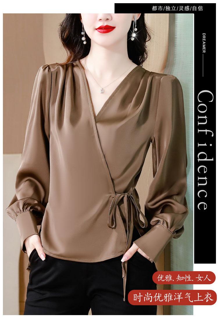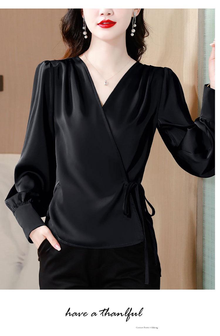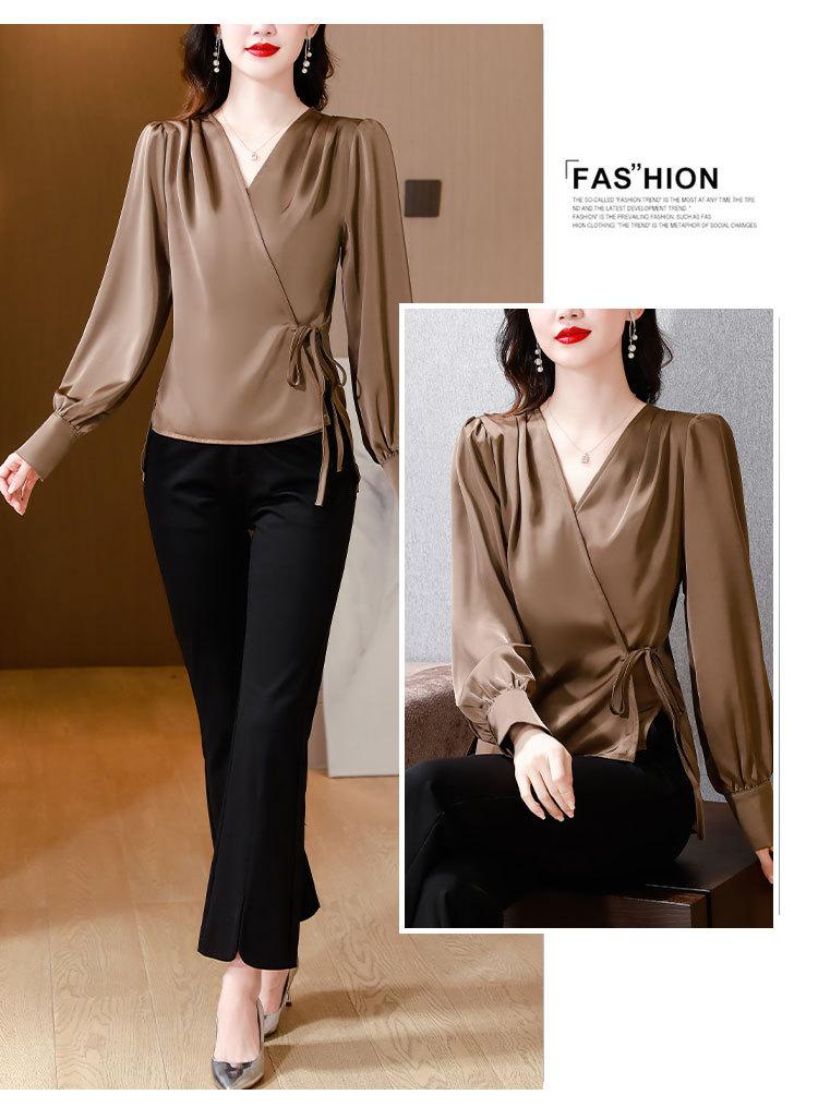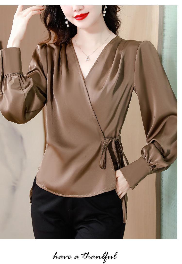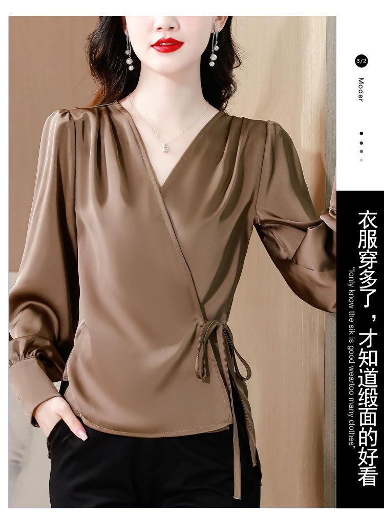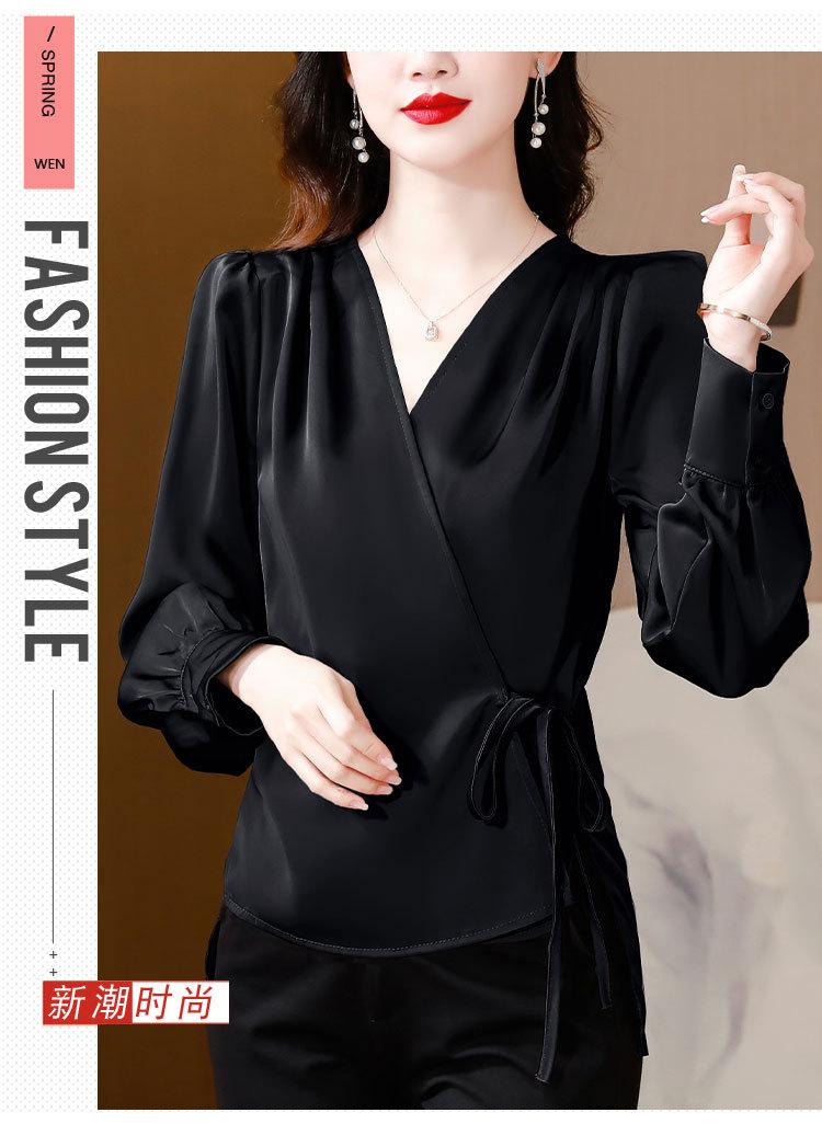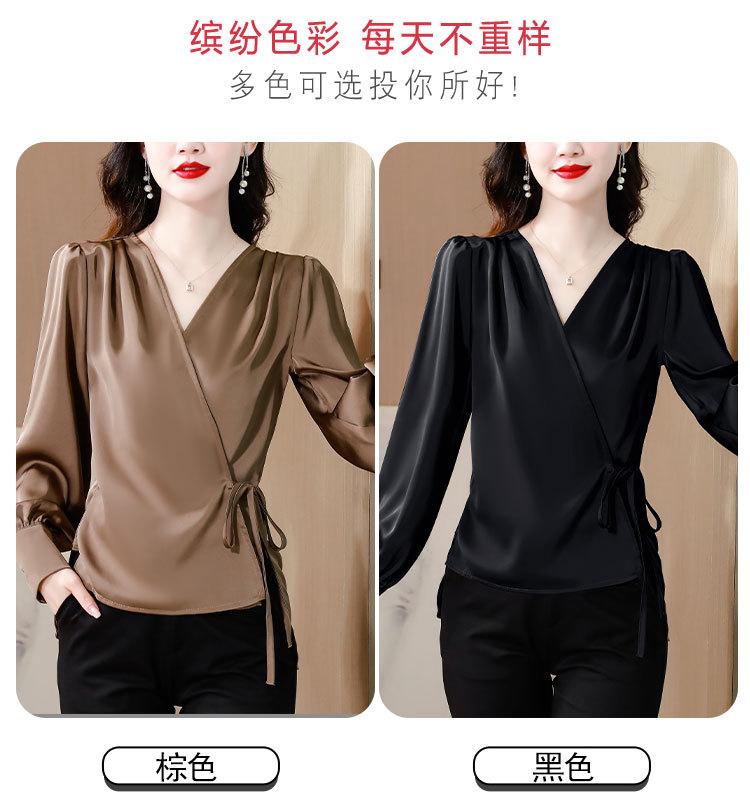 Compra Camisa versátil de manga larga con cuello en V y cordones estilo coreano para mujer 2024 primavera nueva moderna elegante estilo occidental camisa básica de satén al por mayor en Joom.pro