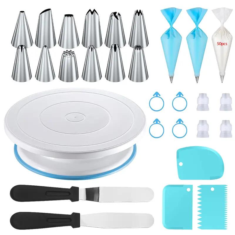 Plato giratorio para tartas de 78 piezas de Amazon, apto para hornear tartas, suministros para tartas, boquilla para crema.