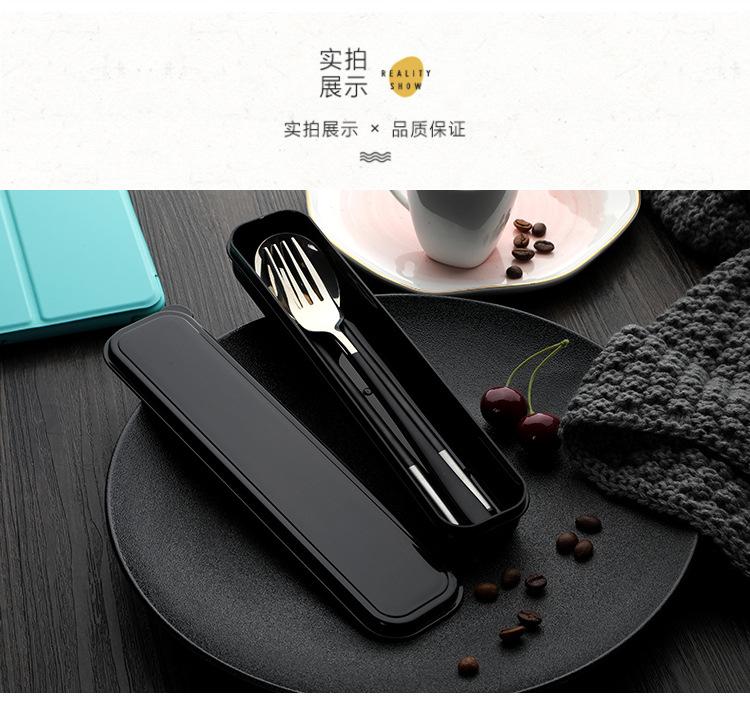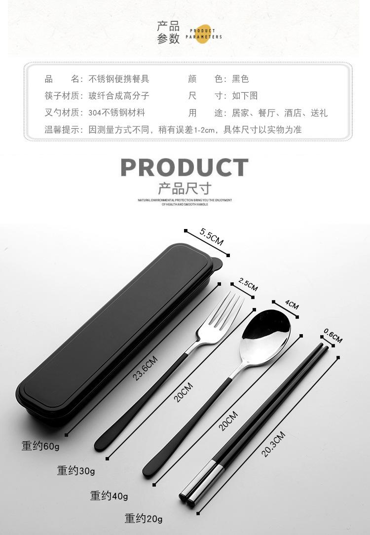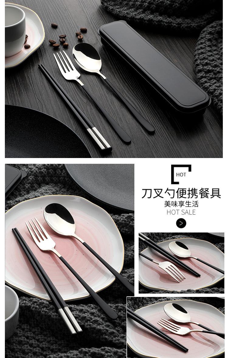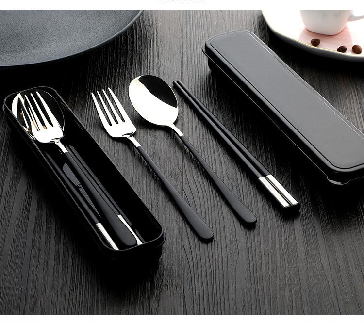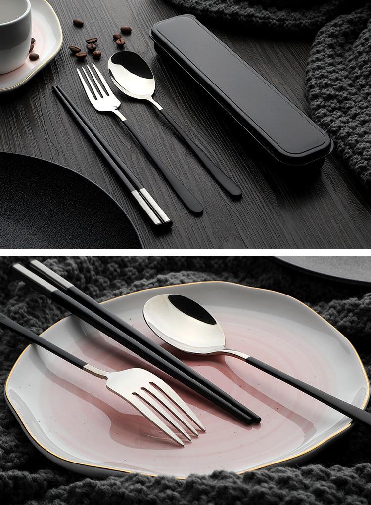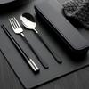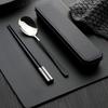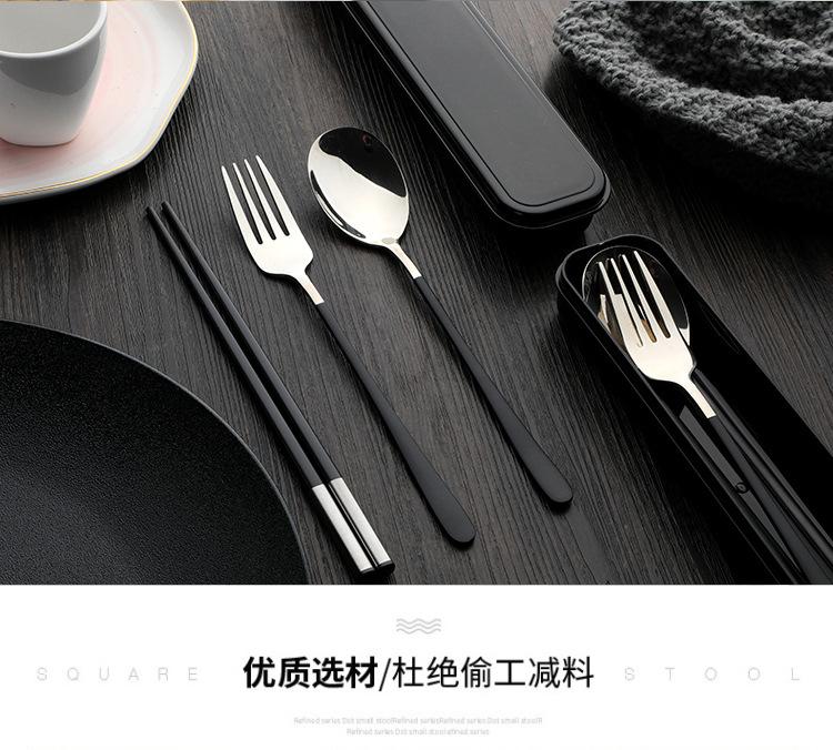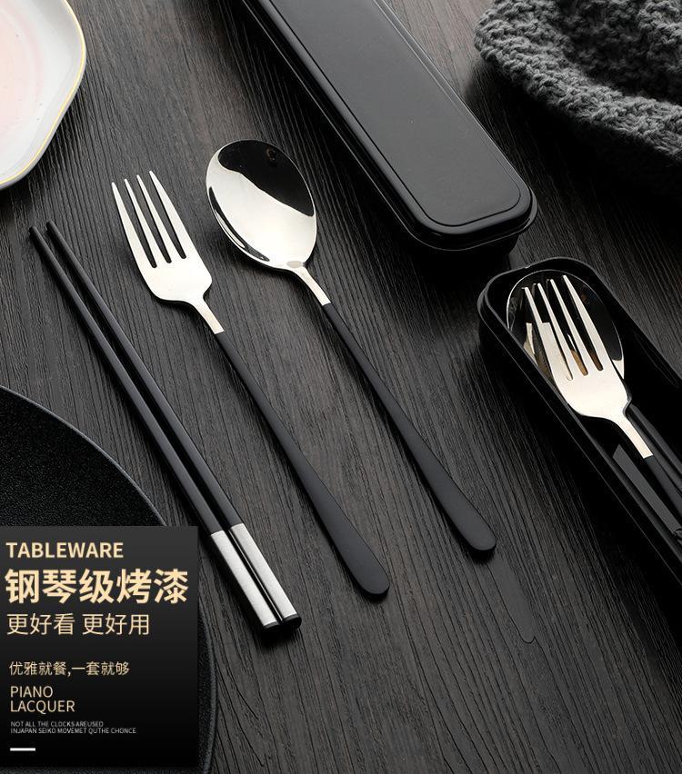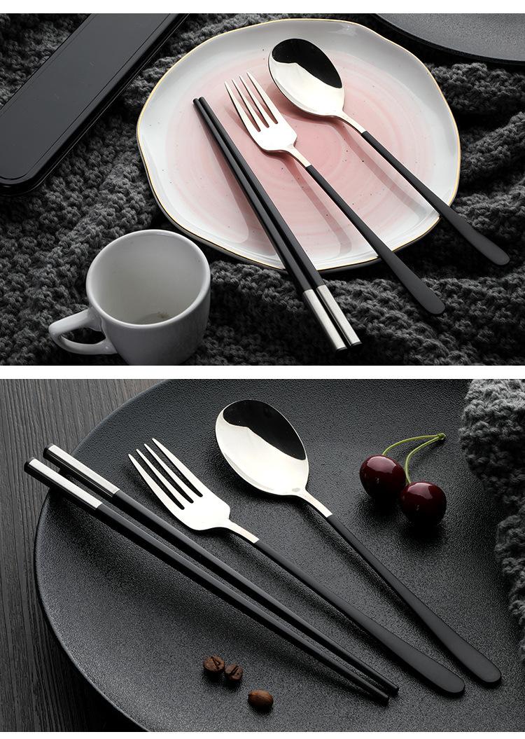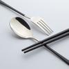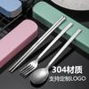 Suministro de juego de vajilla de viaje portátil para estudiantes, de tres piezas, de acero inoxidable 304, con cuchara, tenedor y palillos, disponible para exteriores.