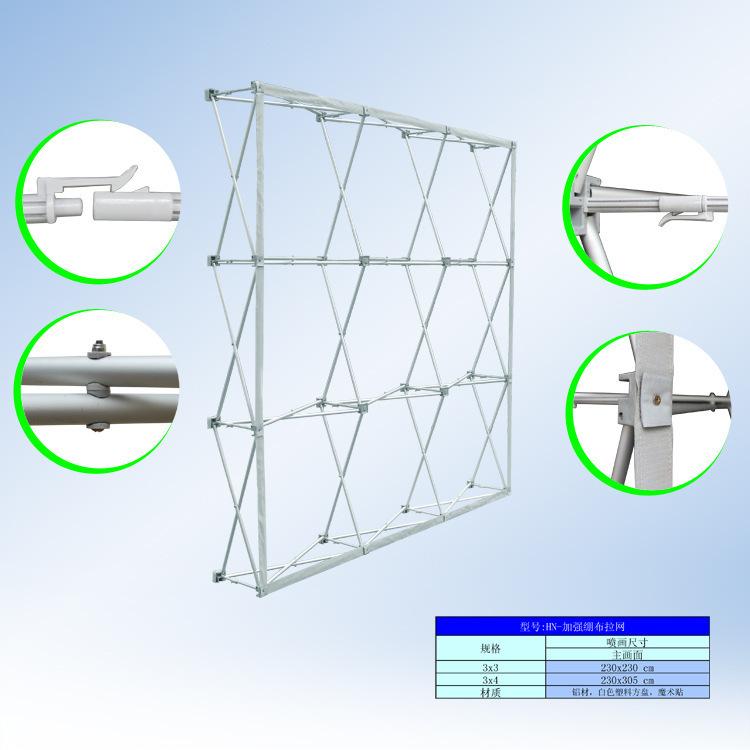 El material principal es un tubo de aleación de aluminio. La parte central está hecha de plástico de ingeniería y se conecta con piezas de plástico. La superficie se fija con velcro para tensar la tela. Este producto es más estable y más hermoso que las redes elásticas ordinarias. Este producto se puede expandir y contraer en un instante. Es simple y fácil colgar imágenes. Es adecuado para paredes de fondo en diversas ocasiones. Su mayor característica es su portabilidad. Flexible y versátil, se puede utilizar en diversas actividades promocionales.
