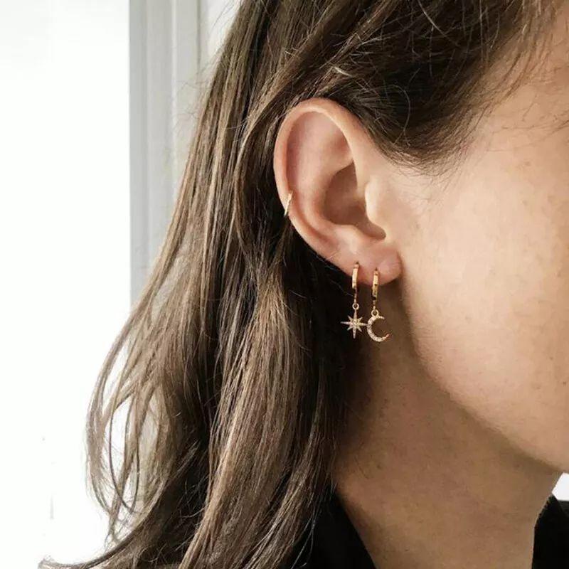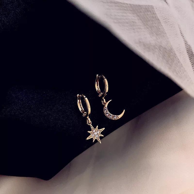 Nombre del producto: Aretes asimétricos de estrella y luna de diamante