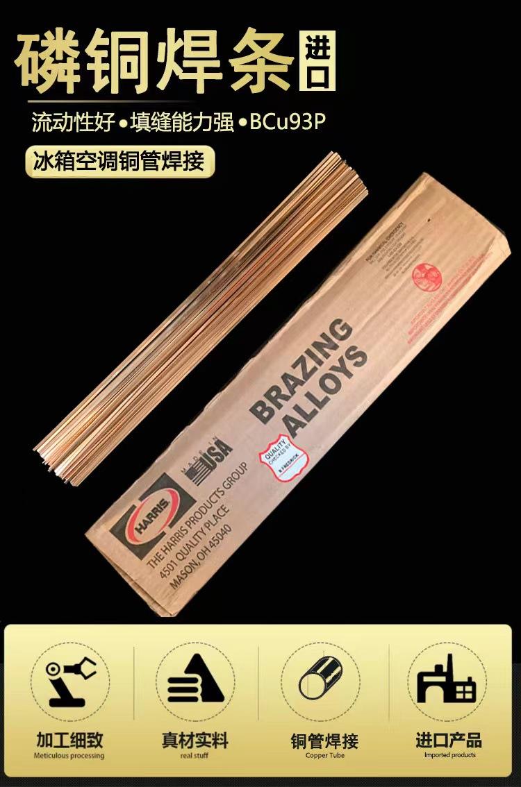 Varilla de soldadura de cobre fosforoso BCu93P (HL201/BCuP-2): Composición P: 6.80-7.50%, cobre: balance. Temperatura de fusión 710-793℃, la soldadura tiene buena fluidez y puede fluir hacia juntas con espacios muy pequeños, pero la soldadura es frágil y generalmente se utiliza en las industrias electromecánica e de instrumentación para soldar piezas de cobre y latón que no están sujetas a cargas de impacto.