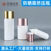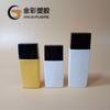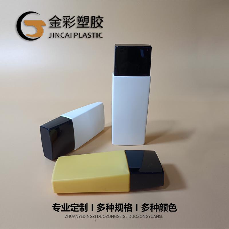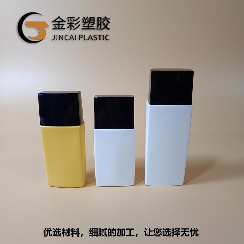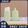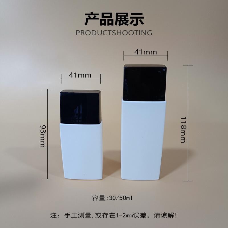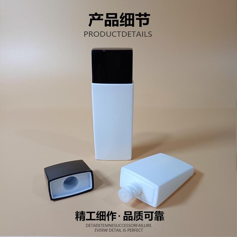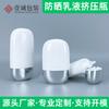 Botella de plástico para protección solar (30 ml y 50 ml), con aislamiento de imprimación, tipo pulsador, plana y apretable. Material de embalaje.