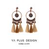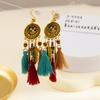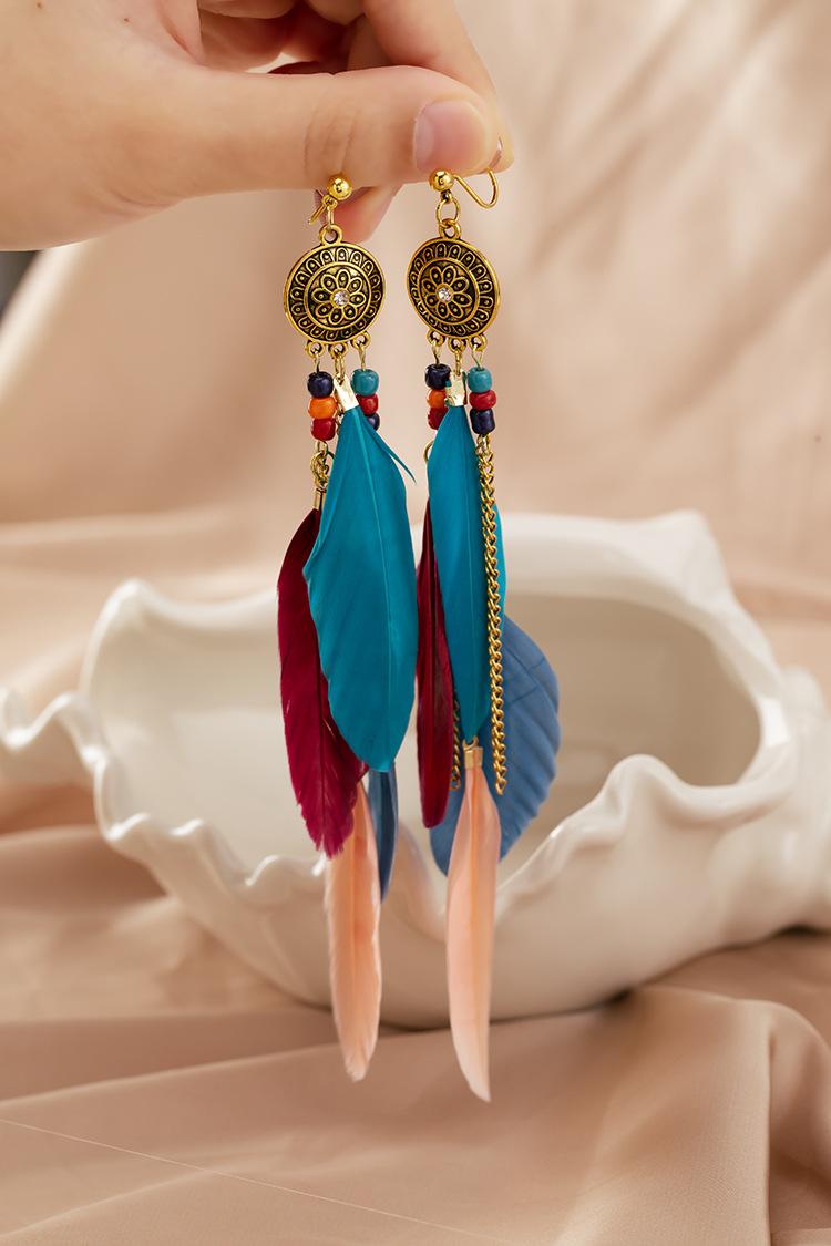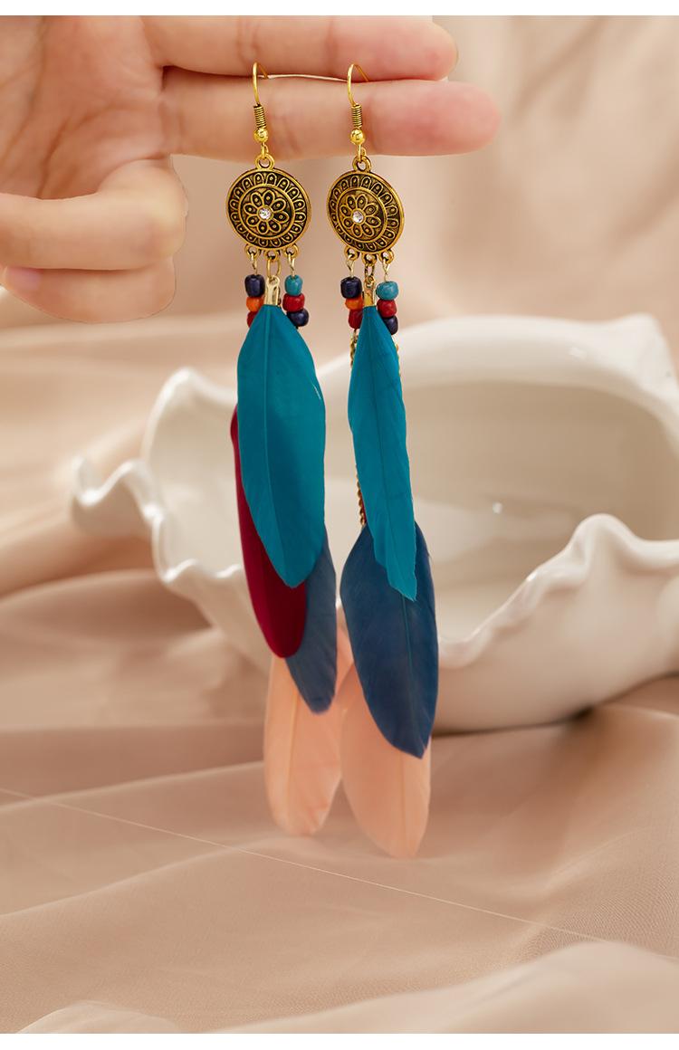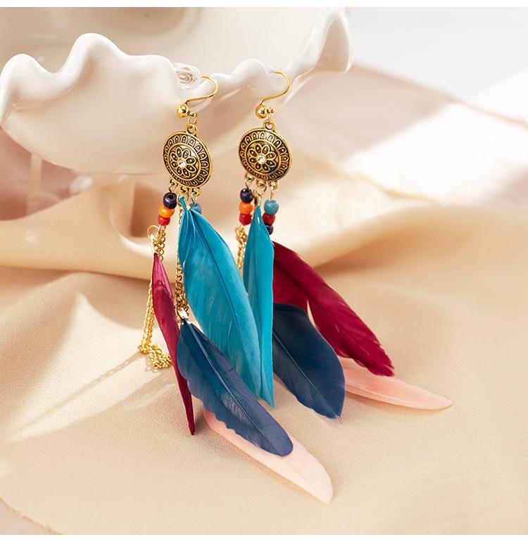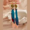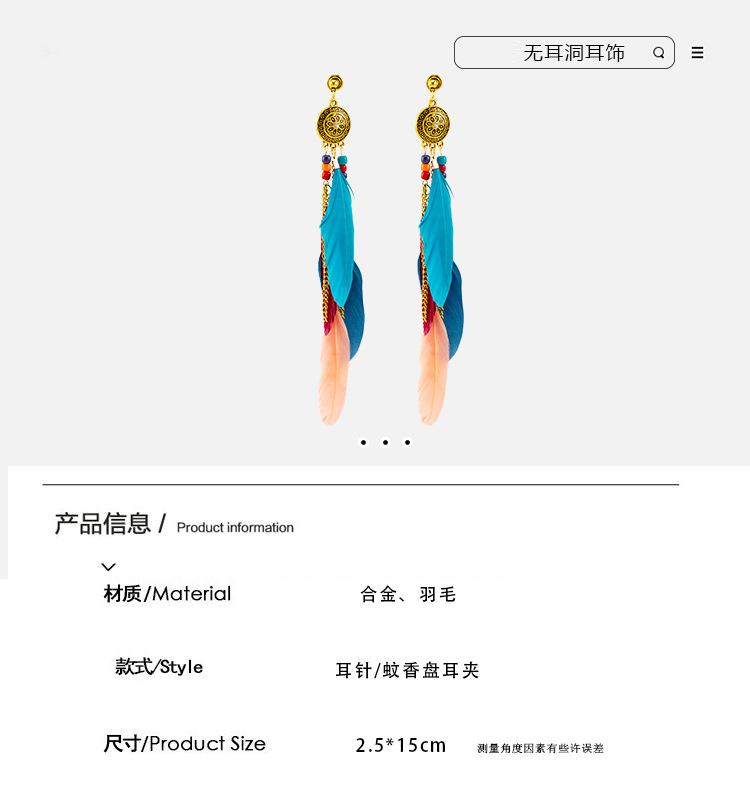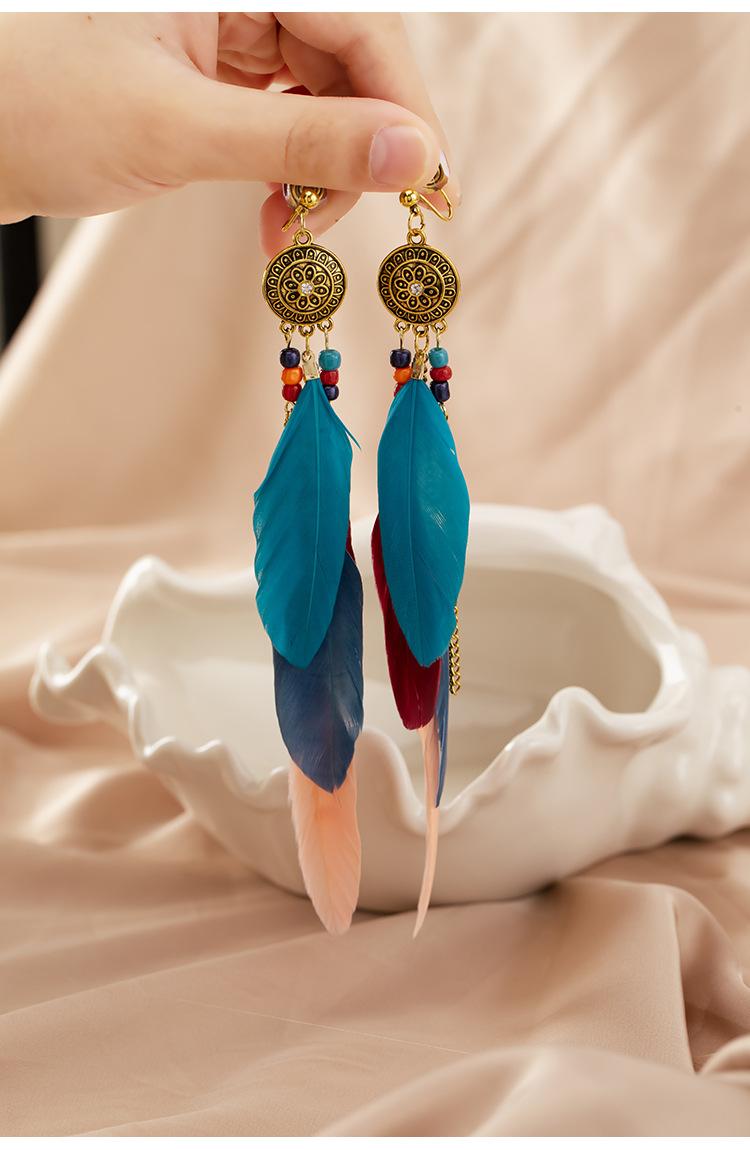 Aretes largos de plumas de estilo étnico retro coloridos elegantes personalidad aretes adelgazantes para el rostro clip para la oreja de bobina de mosquito para orejas no perforadas