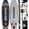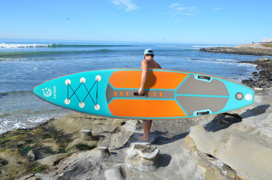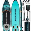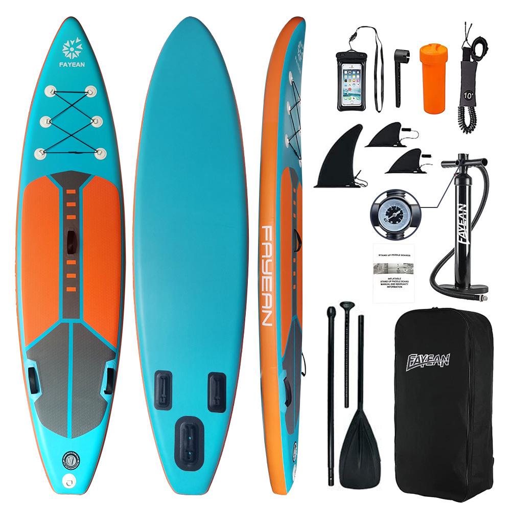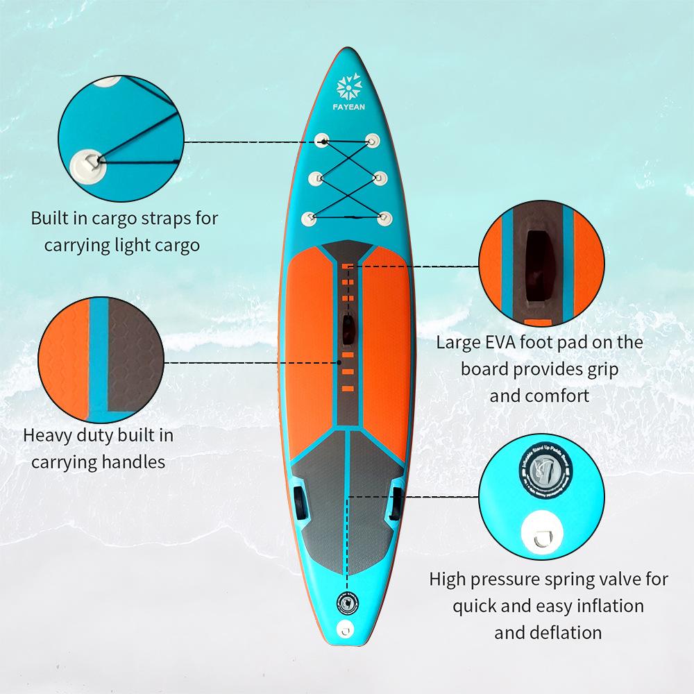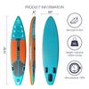 Accesorios: mochila + bomba de doble acción + remo de aluminio + aleta grande desmontable + 2 aletas pequeñas + tubo de reparación + leash de pie de 10" + bolsa impermeable para teléfono móvil + cartón