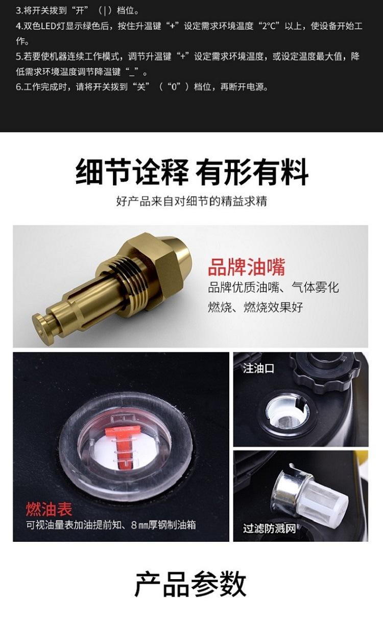 El nuevo calentador de combustible mejorado se calienta rápidamente, tiene mayor potencia térmica, tiene una pantalla LCD ajustable y controlable, es seguro y cómodo de usar, no tiene olor y se mantiene caliente, es adecuado para la hibernación de vegetales de invernadero, la hibernación de animales de granja, incubadoras, talleres de calefacción y edificios de fábricas, y es fácil y seguro de usar.