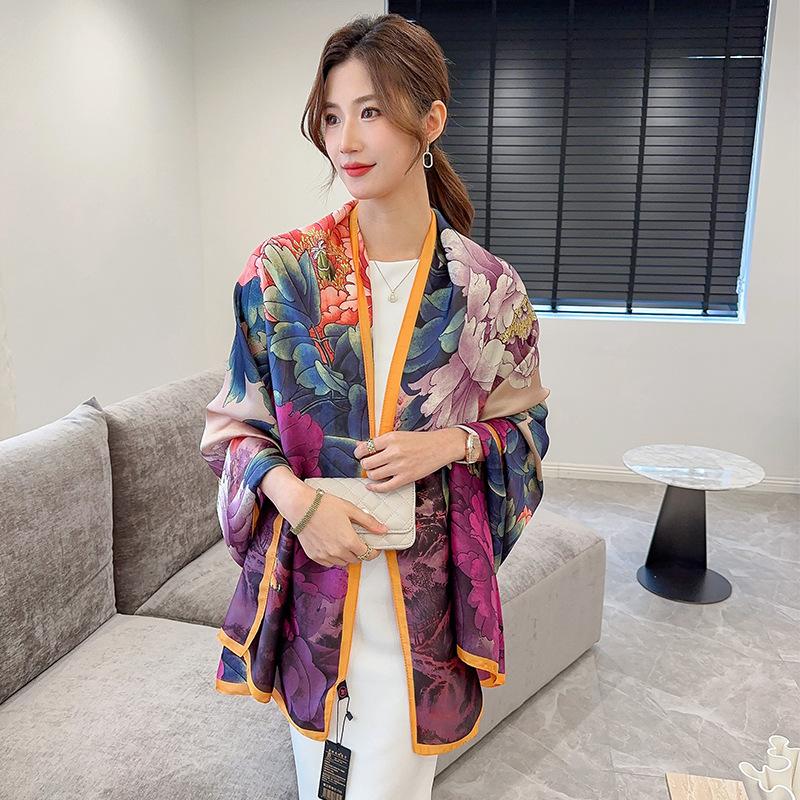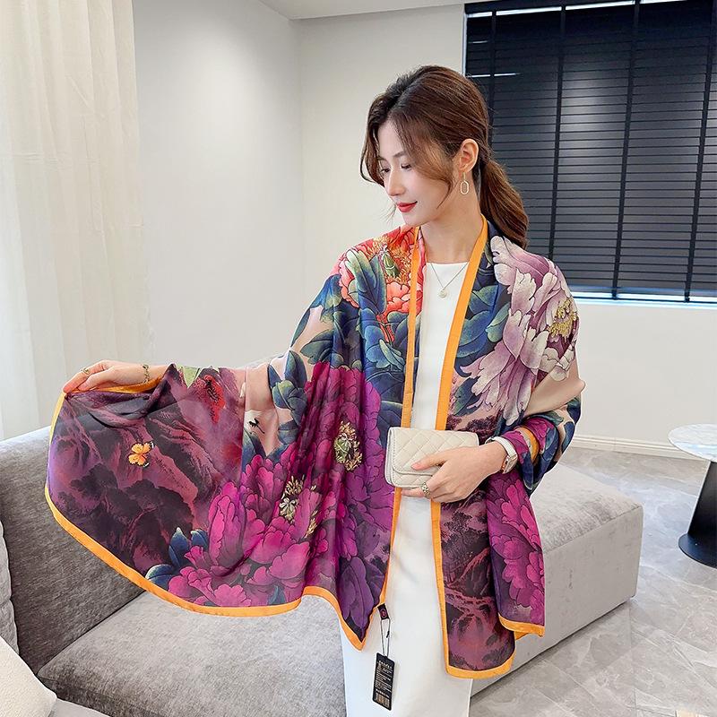 Chal de Protección Solar para Viajes de Primavera y Otoño Versátil Estampado Floral Satén de Seda Sintética Bufanda Larga Elegante Bufanda de Seda para Mujer Bufanda de Poliéster