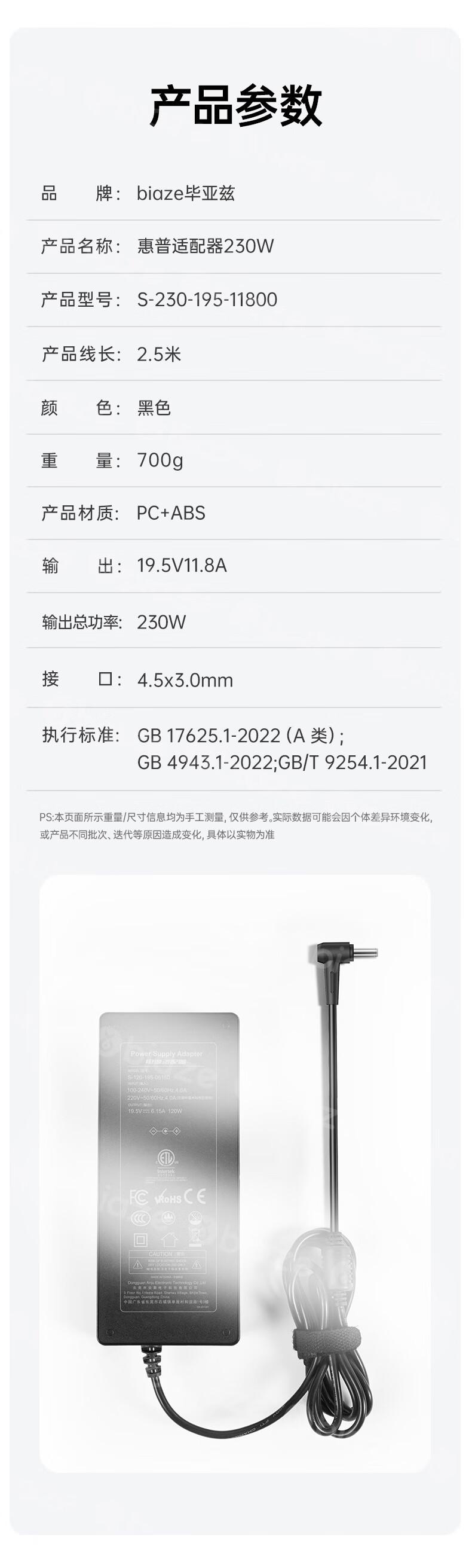 Cargador para Laptop Biaz 19.5V11.8A 230W Adaptador de Corriente para Computadora Cable 4.5*3.0