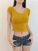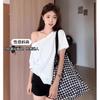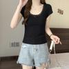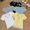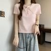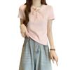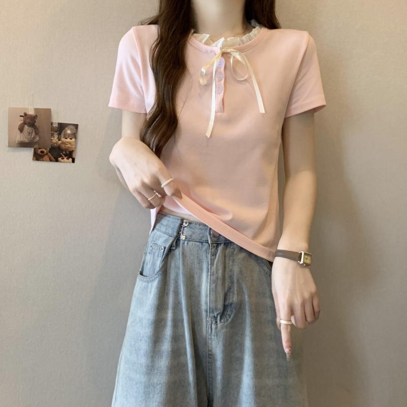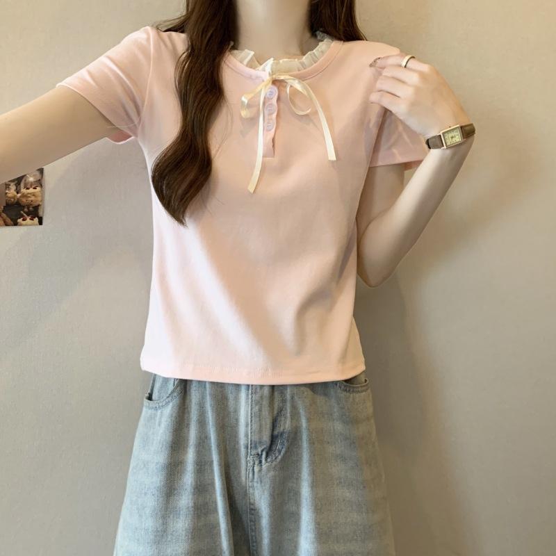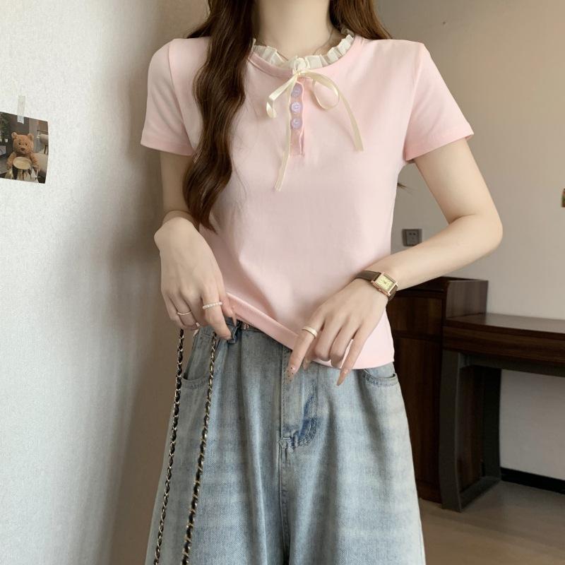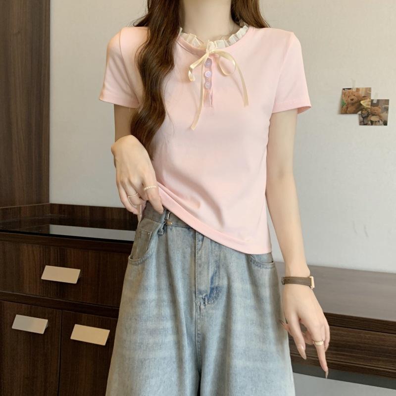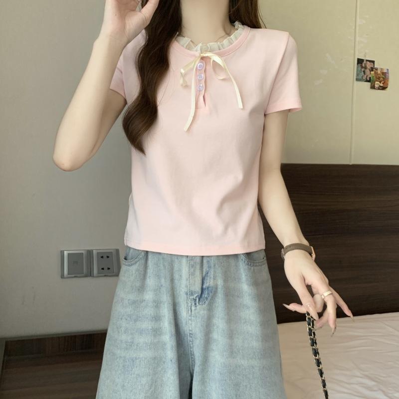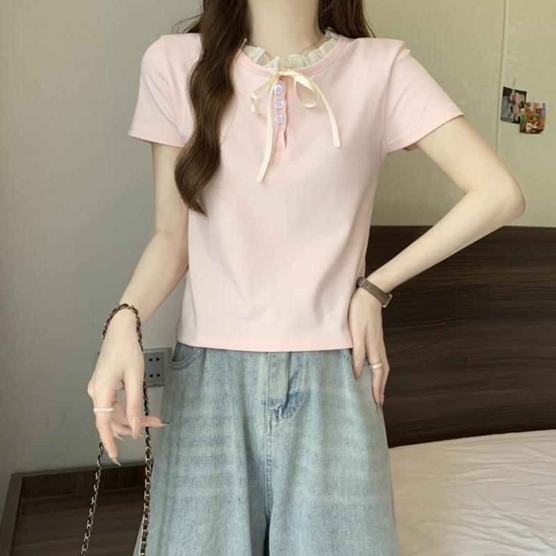 Camiseta de manga corta con lazo de encaje en los hombros de algodón 92 para mujer, corte entallado, parte superior falsa de dos piezas, top pequeño de verano