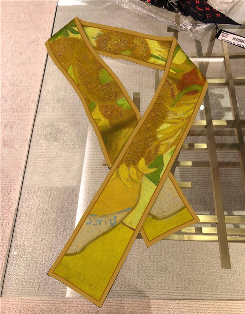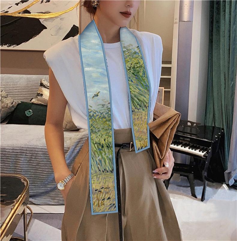 | Bufanda de seda decorativa con diseño de flores y pintura al óleo de Van Gogh para primavera y verano, ideal para viajes y protección solar. |
