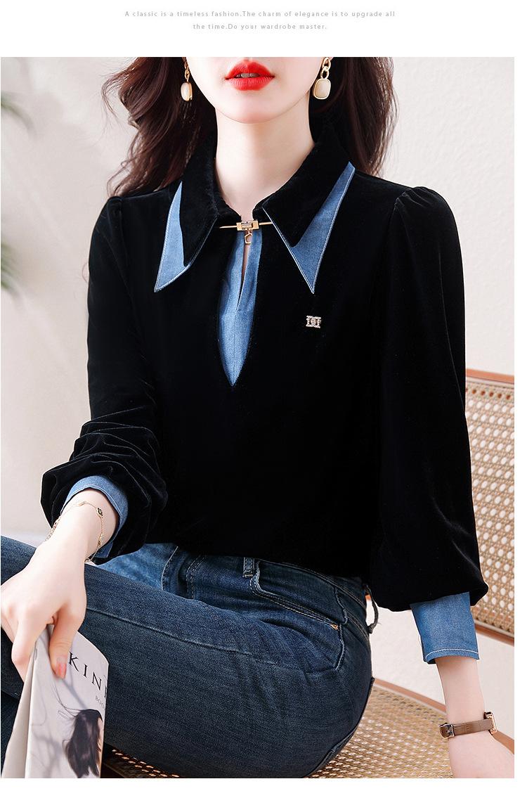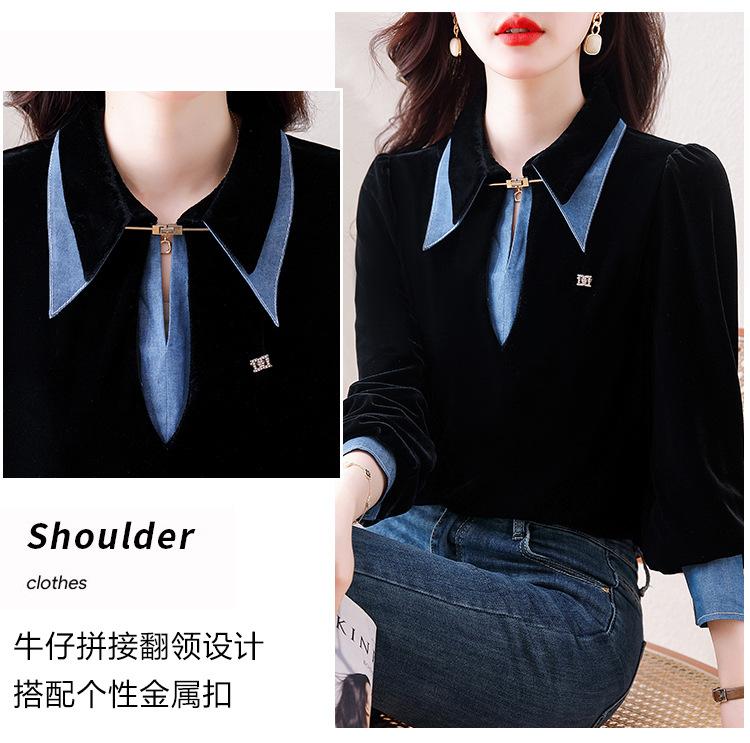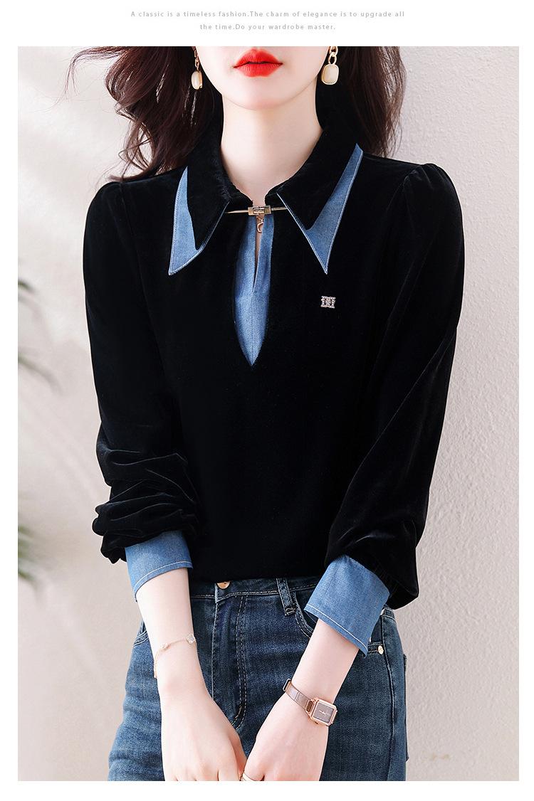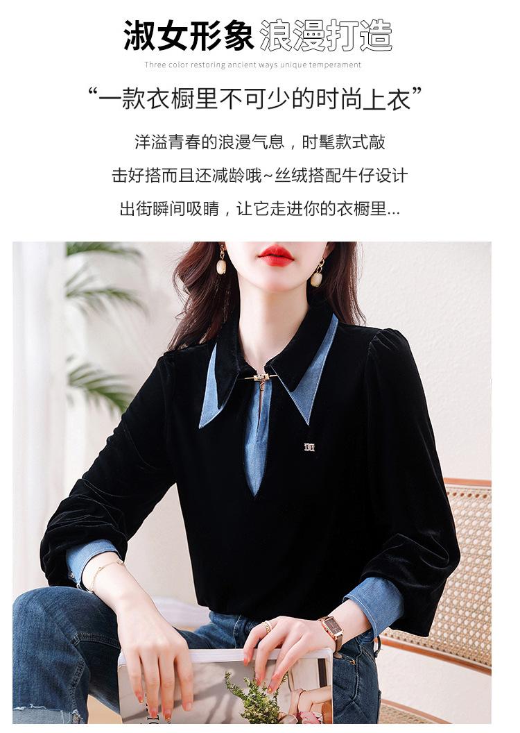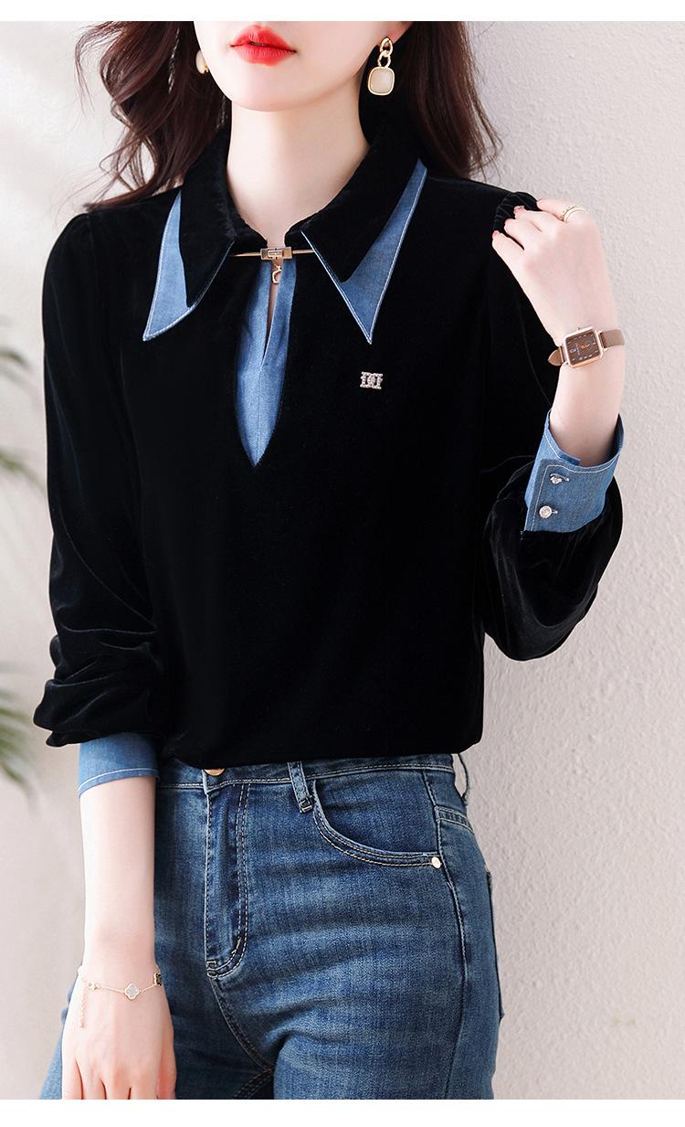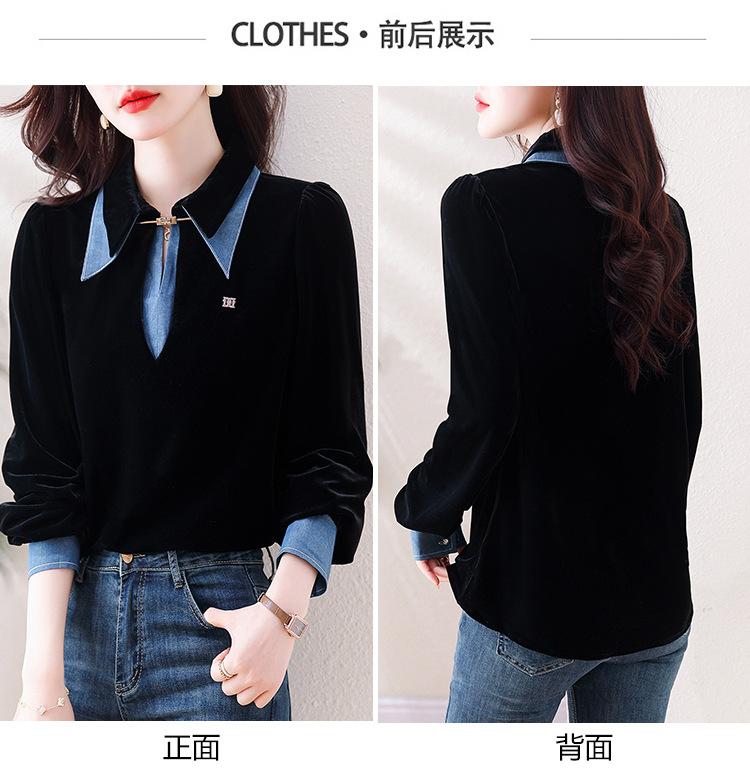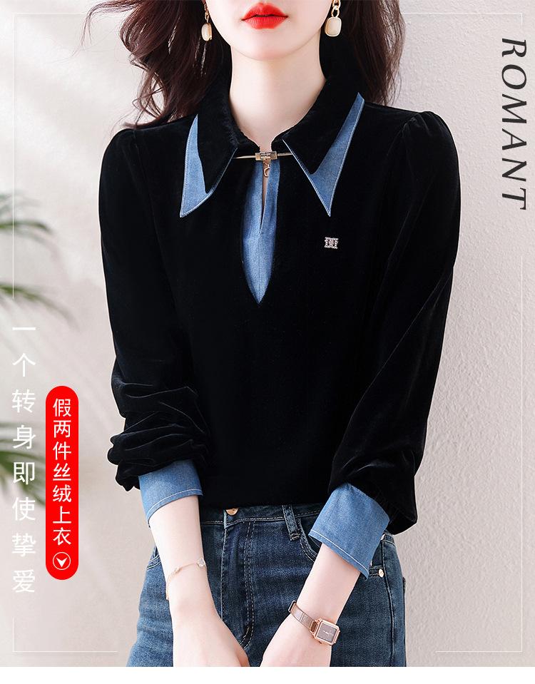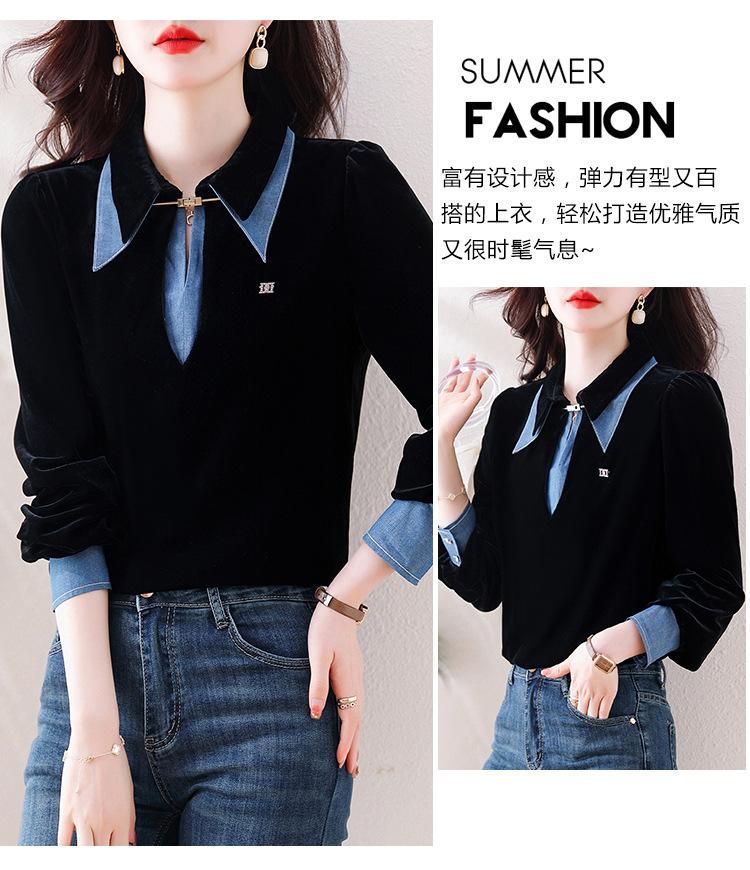 Compra Camisa de dos piezas falsas estilo coreano para mujer 2023 otoño nuevo diseño nicho Top de terciopelo con costuras de mezclilla al por mayor en Joom.pro