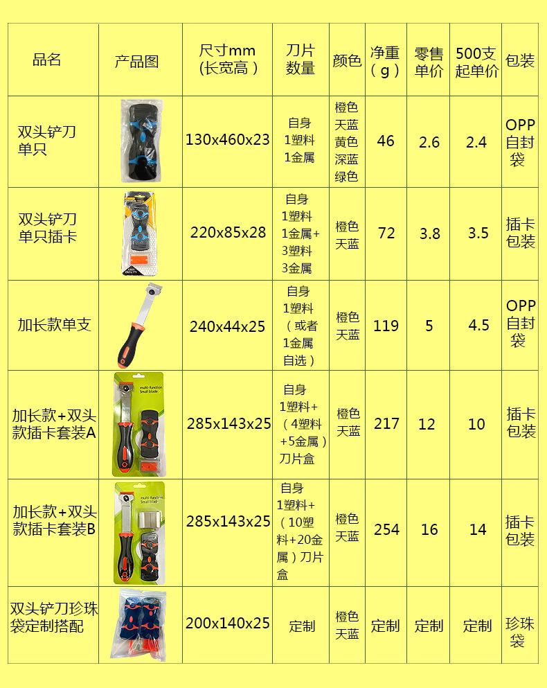 1 blue double head 1 orange double head 20 metal blades 20 plastic blades