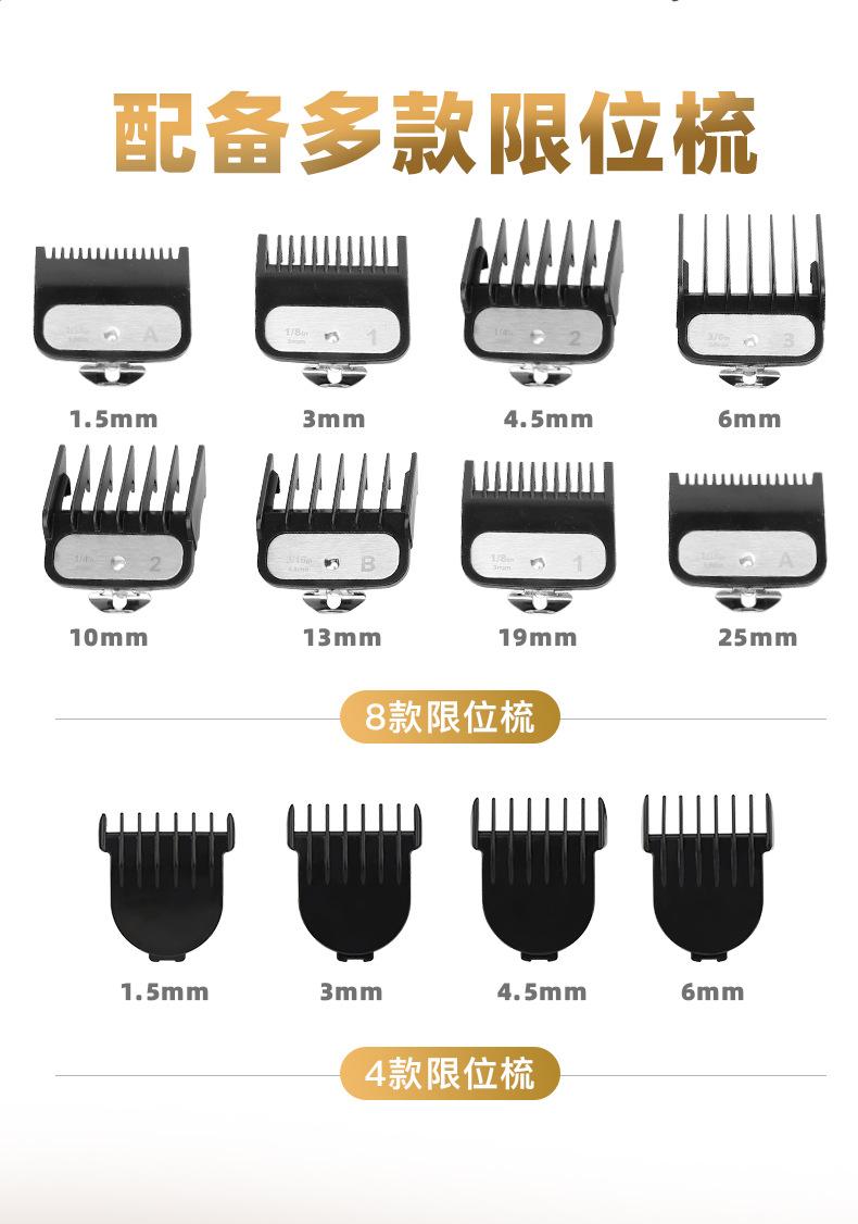 Características del producto: Cuerpo de metal, potencia fuerte, con juego de 8 piezas con peine limitador de longitud (adecuado para máquinas grandes) cuatro peines limitadores (1, 2, 3, 4 mm para máquinas pequeñas) cable de carga USB