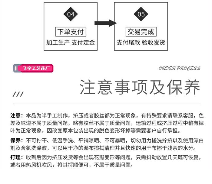 Estimado cliente, nuestra tienda produce y vende al por mayor todo tipo de flores y plantas artificiales. En principio, solo vendemos artículos grandes, pero también aceptamos muestras. Sin embargo, no se admiten devoluciones ni cambios de los productos de muestra. Por ejemplo, si compra solo uno o dos ejemplares de cada tipo, comprar uno o dos de varias variedades se considera una muestra. No se admiten reembolsos. Le rogamos que lo lea detenidamente antes de realizar un pedido. Disculpe las molestias. ¡Gracias por su cooperación!
