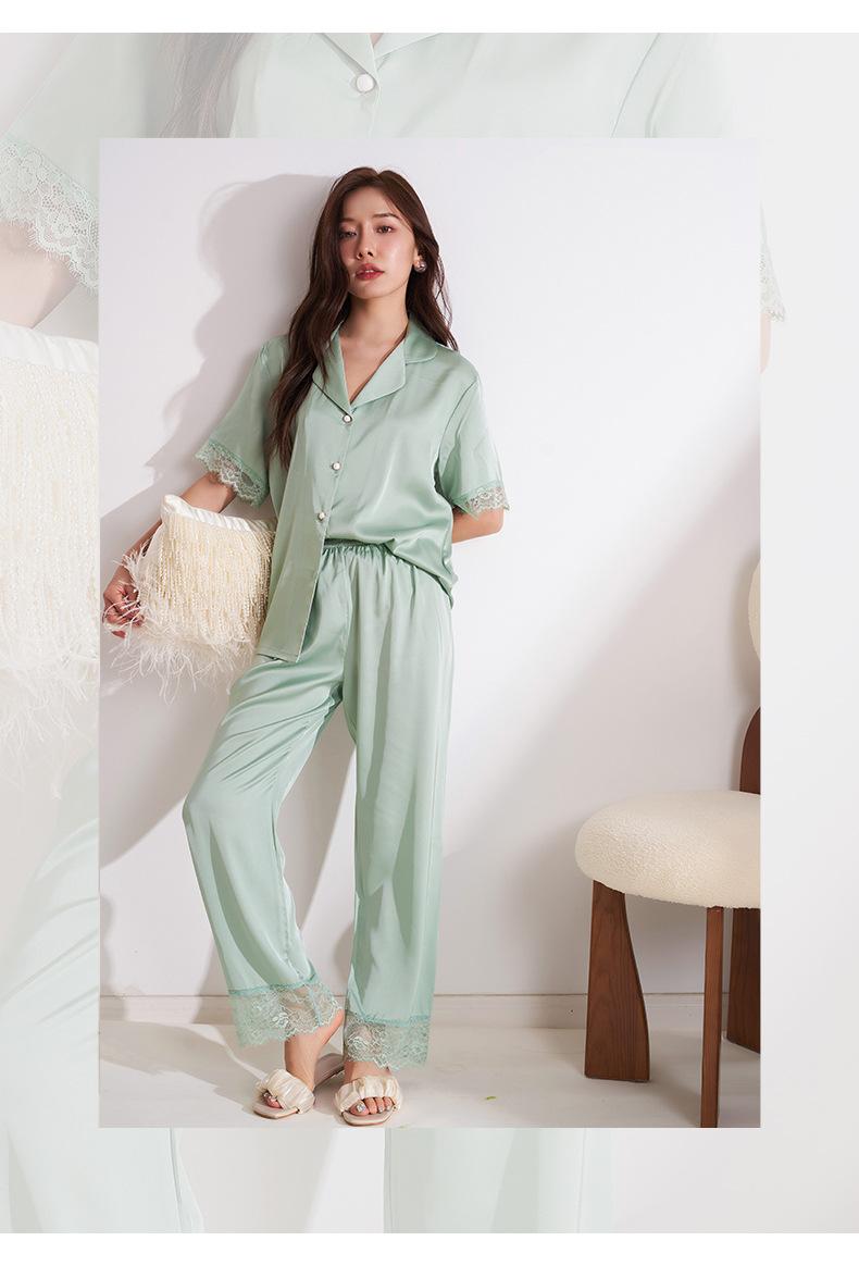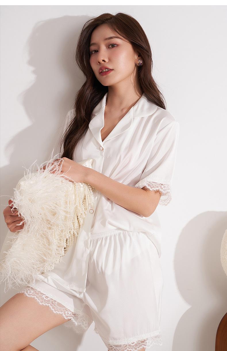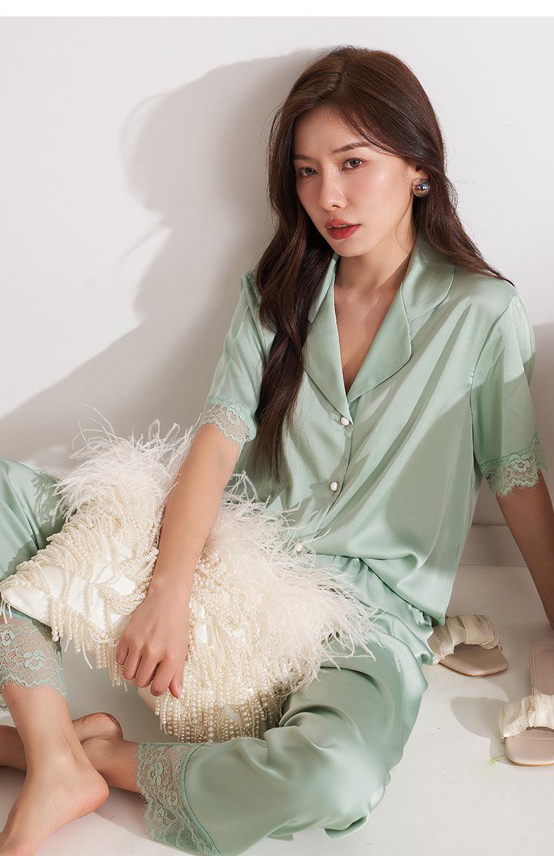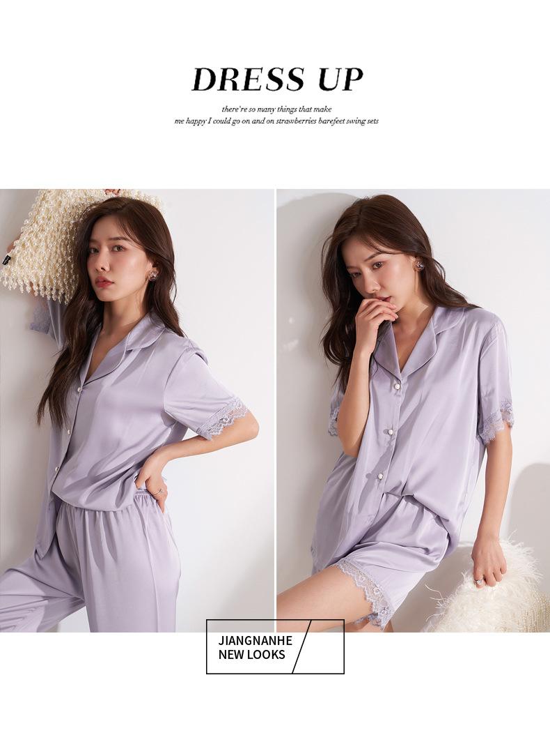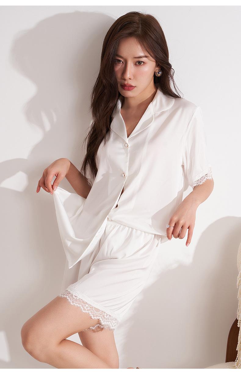 Pijama de seda de hielo 2023 para mujer, de verano, con encaje fino, calado, para usar en casa, con pantalones y pantalones cortos de manga corta, conjunto de tres piezas