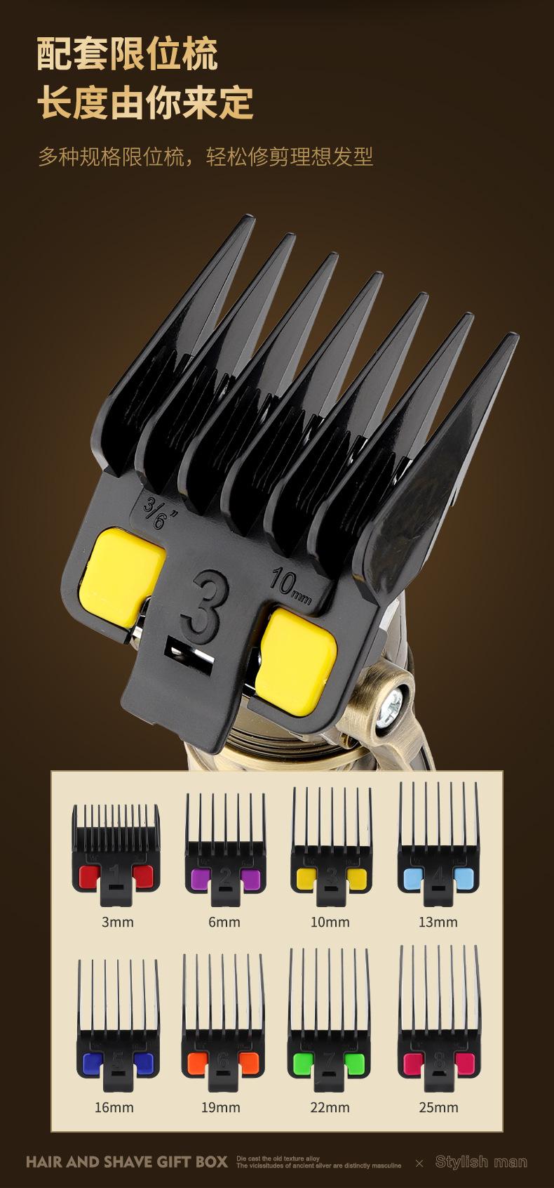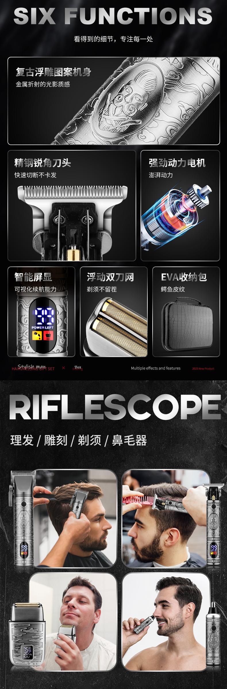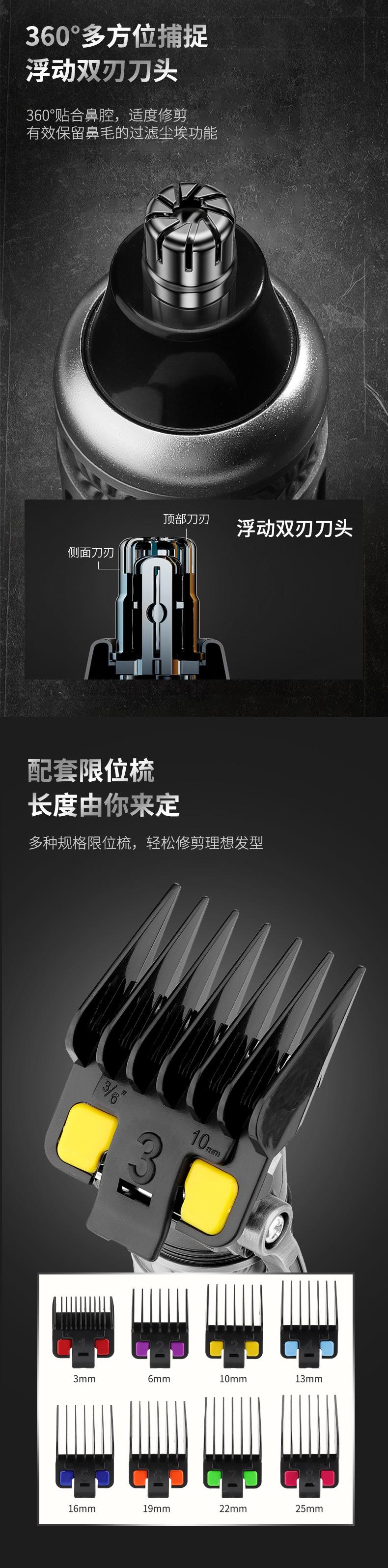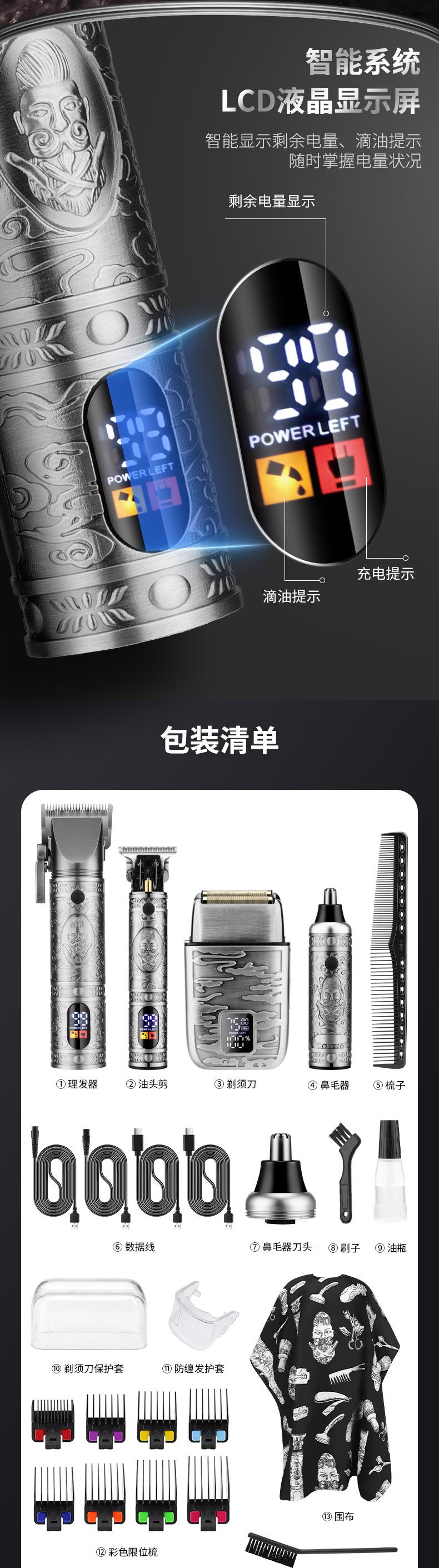 Accesorios incluidos: cortadora de cabello grande + cortadora de cabello grabada + cable de carga USB * 4 + afeitadora de 3 mallas + removedor de vello nasal + cepillo de limpieza + peine guía para cortadora de cabello grande * 8 (3.6.10.13.16.19.22.25 mm) + capa de corte de cabello + peine guía para cortadora de cabello grabada * 4 (1.2.3.4 mm) + cepillo de limpieza + bolsa de almacenamiento EVA.
