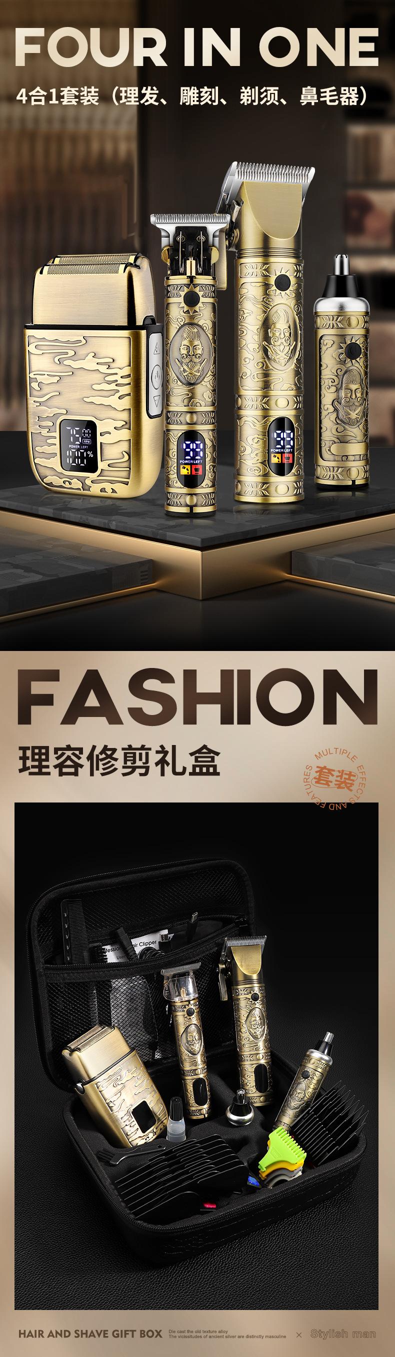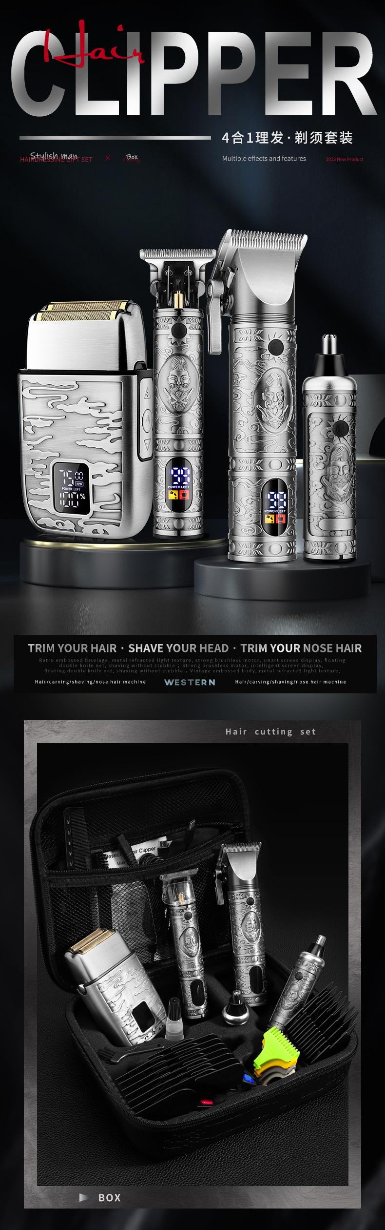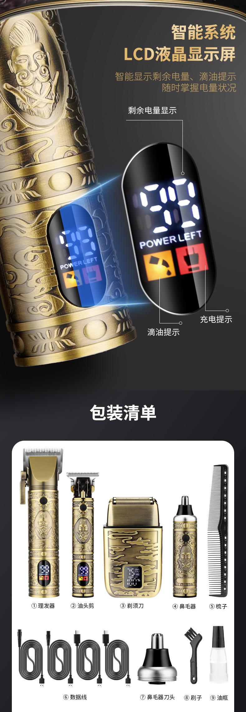 Accesorios incluidos: cortadora de cabello grande + cortadora de cabello grabada + cable de carga USB * 4 + afeitadora de 3 mallas + removedor de vello nasal + cepillo de limpieza + peine guía para cortadora de cabello grande * 8 (3.6.10.13.16.19.22.25 mm) + capa de corte de cabello + peine guía para cortadora de cabello grabada * 4 (1.2.3.4 mm) + cepillo de limpieza + bolsa de almacenamiento EVA.