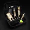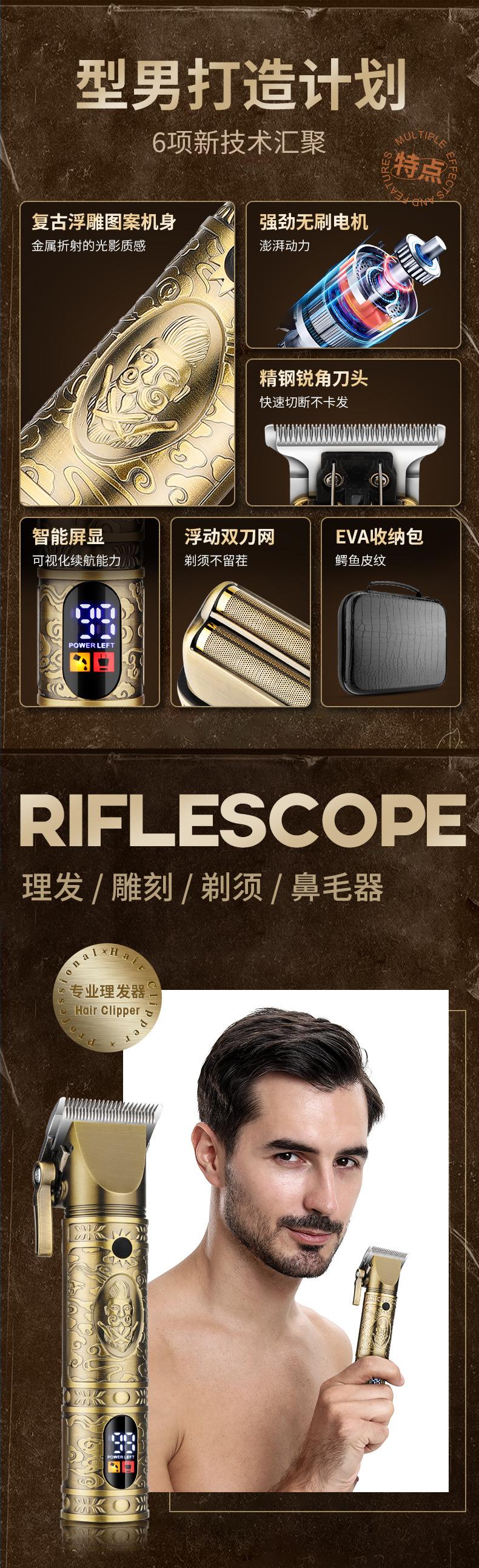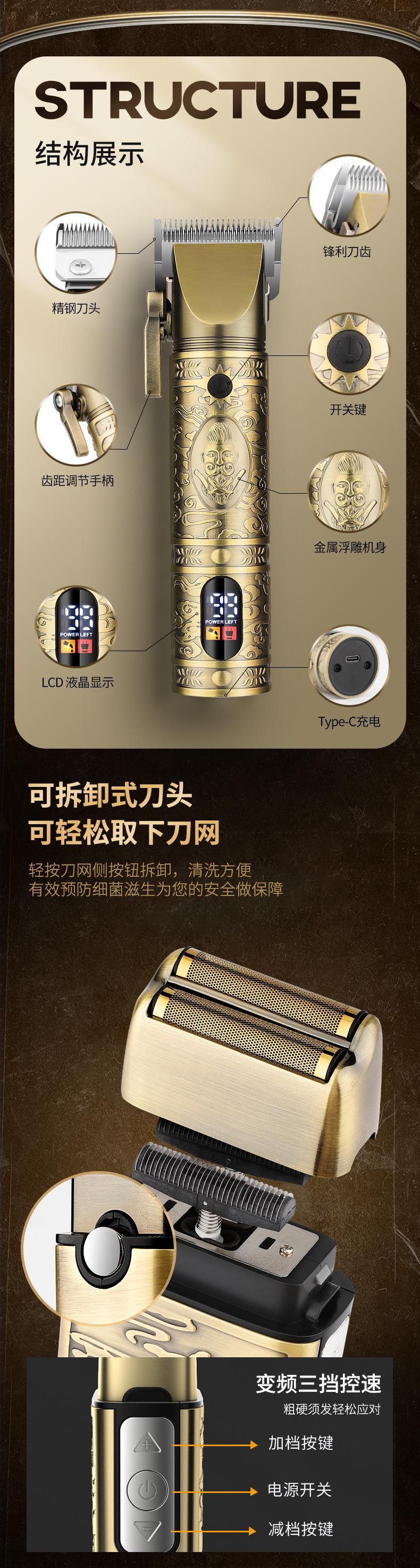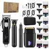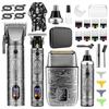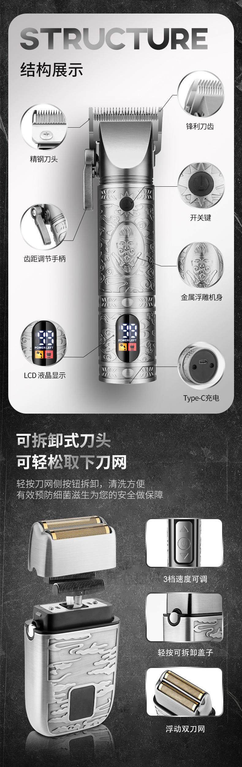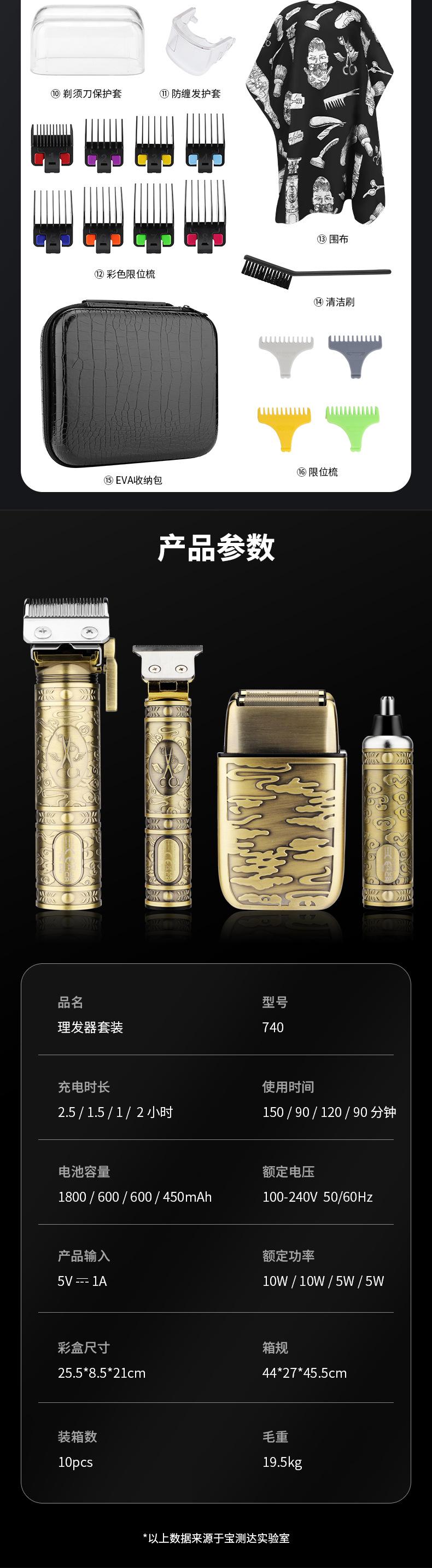 Accesorios incluidos: cortadora de cabello grande + cortadora de cabello grabada + cable de carga USB * 4 + afeitadora de 3 mallas + removedor de vello nasal + cepillo de limpieza + peine guía para cortadora de cabello grande * 8 (3.6.10.13.16.19.22.25 mm) + capa de corte de cabello + peine guía para cortadora de cabello grabada * 4 (1.2.3.4 mm) + cepillo de limpieza + bolsa de almacenamiento EVA.