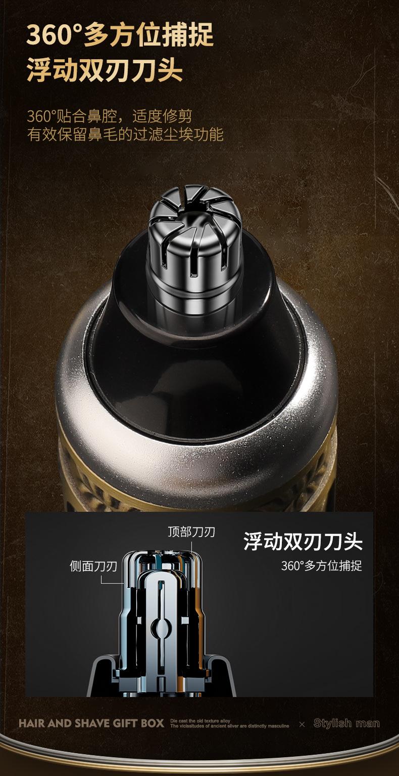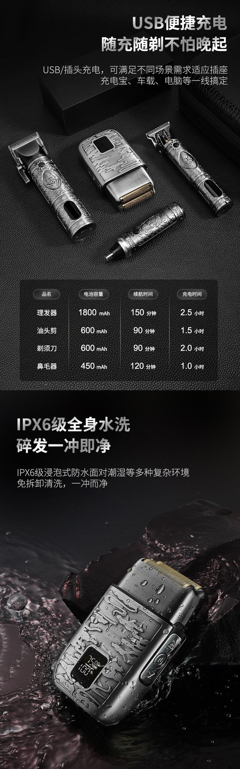 Capacidad de la batería: 1800mAh (cortadora de cabello grande) / 600mAh (cortadora de cabello pequeña) / 600 mah (afeitadora) / 450mAh (removedor de vello nasal);