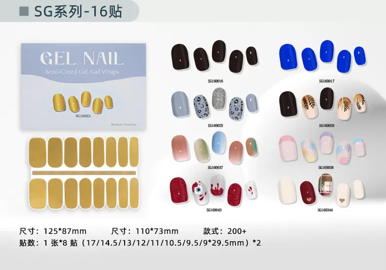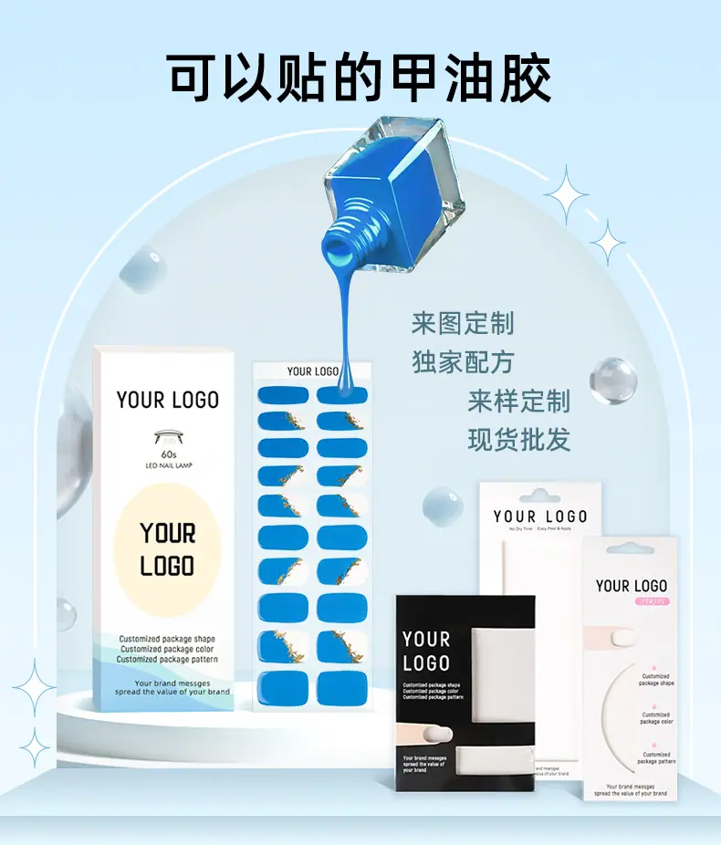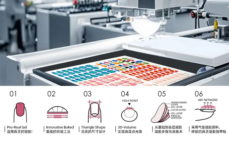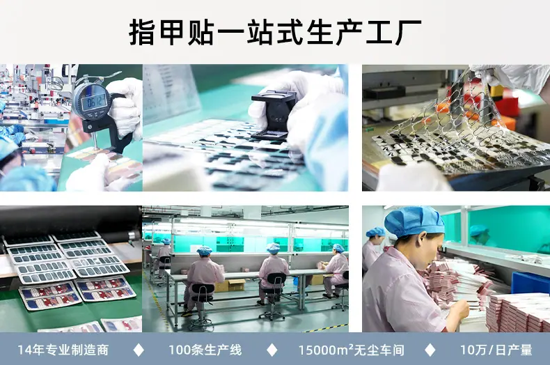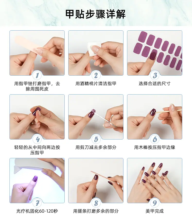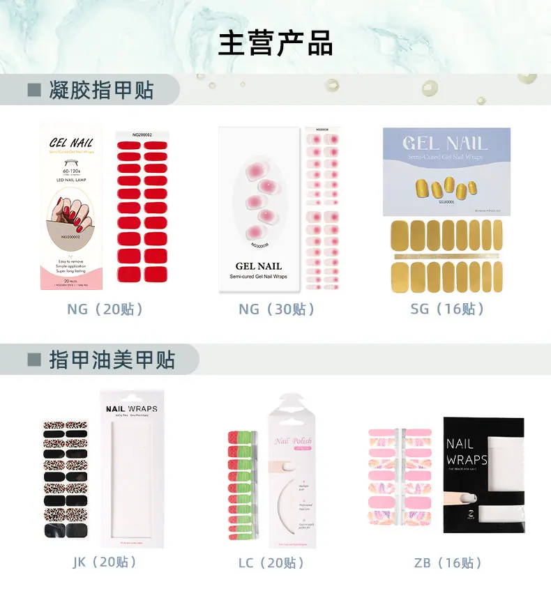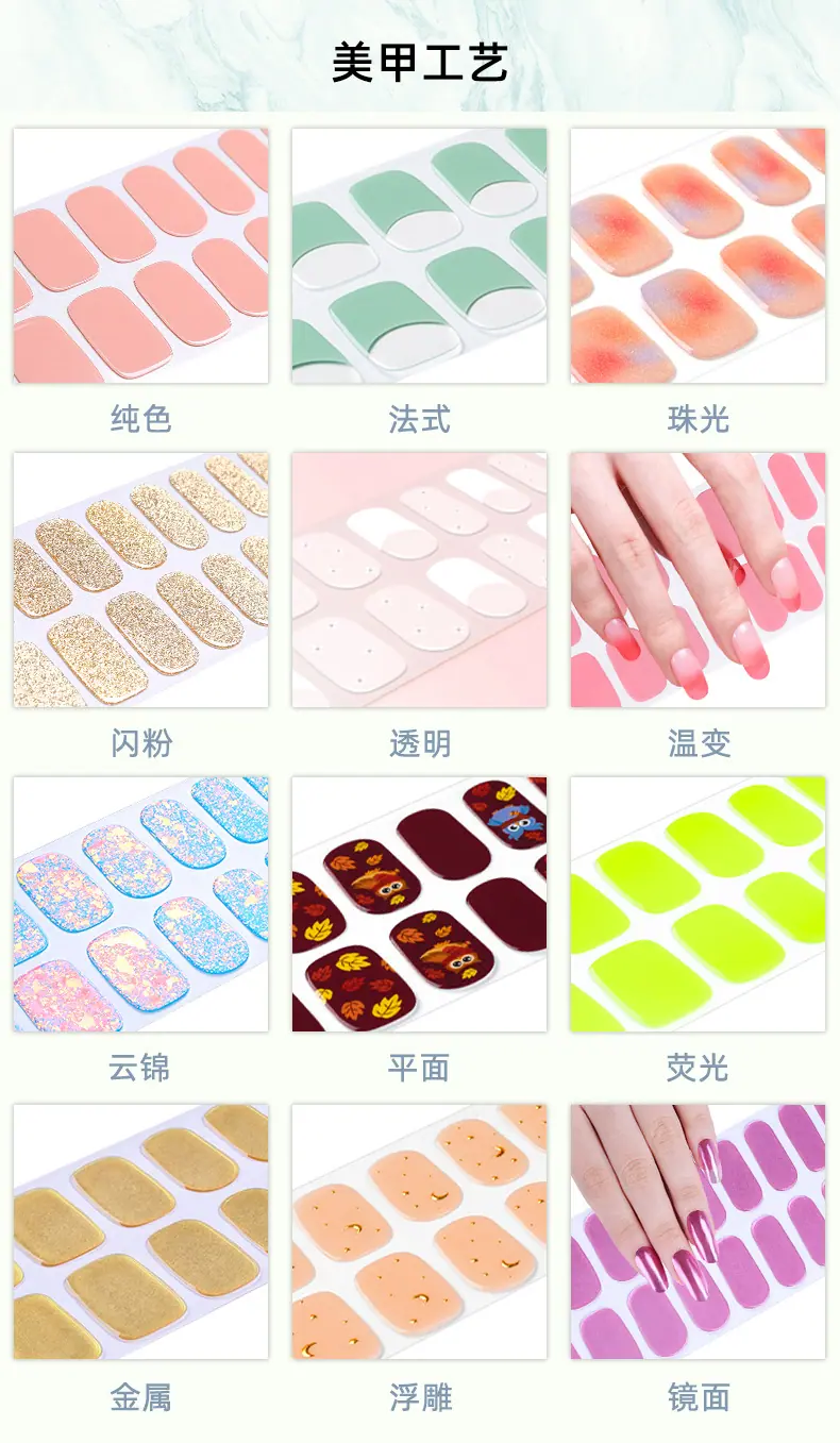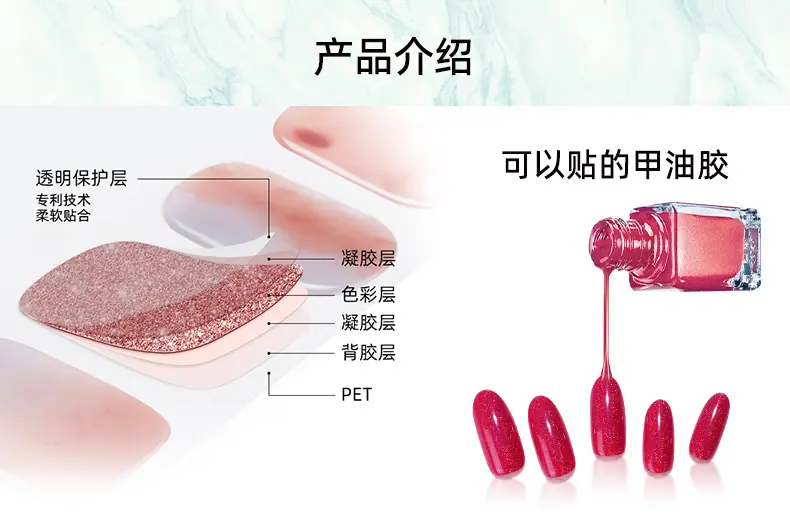 El nail art en gel no es una pegatina de plástico ordinaria para uñas, está hecho de ingredientes de esmalte en gel, es más brillante y más respetuoso con el medio ambiente después de curar bajo una lámpara, terminadoSGS、BSCI、ISO、GMP、FSC y otros tipos de productos para uñas y cosméticosProceso de dar un título
