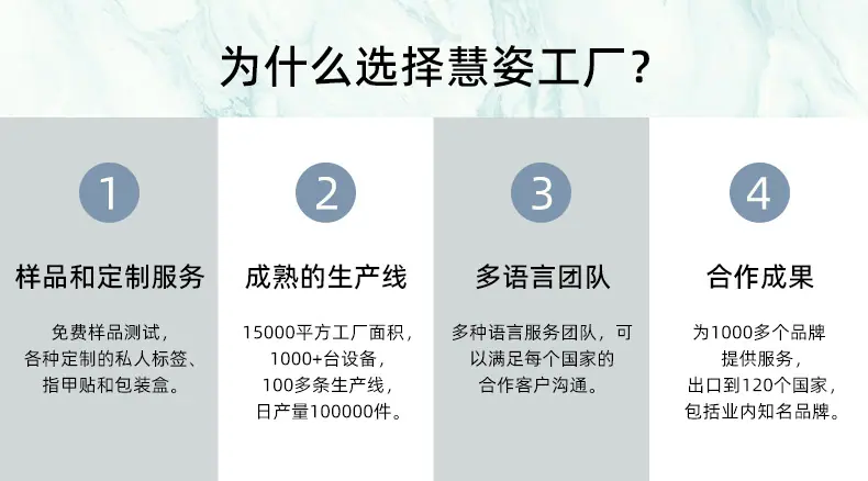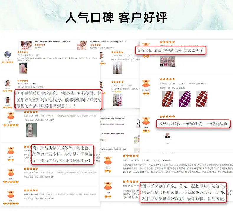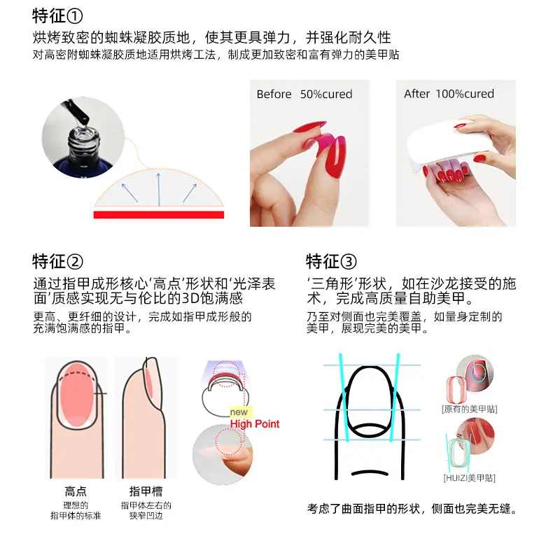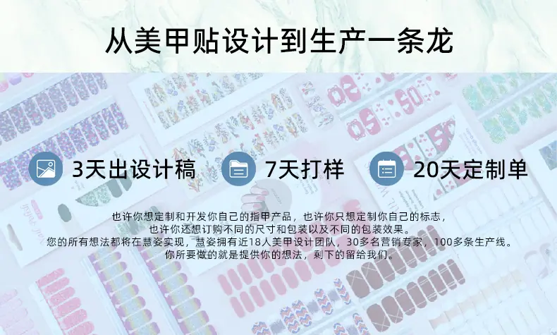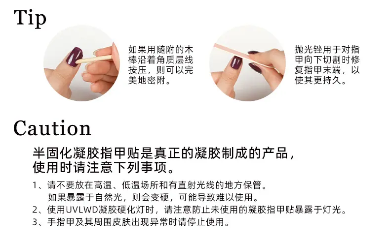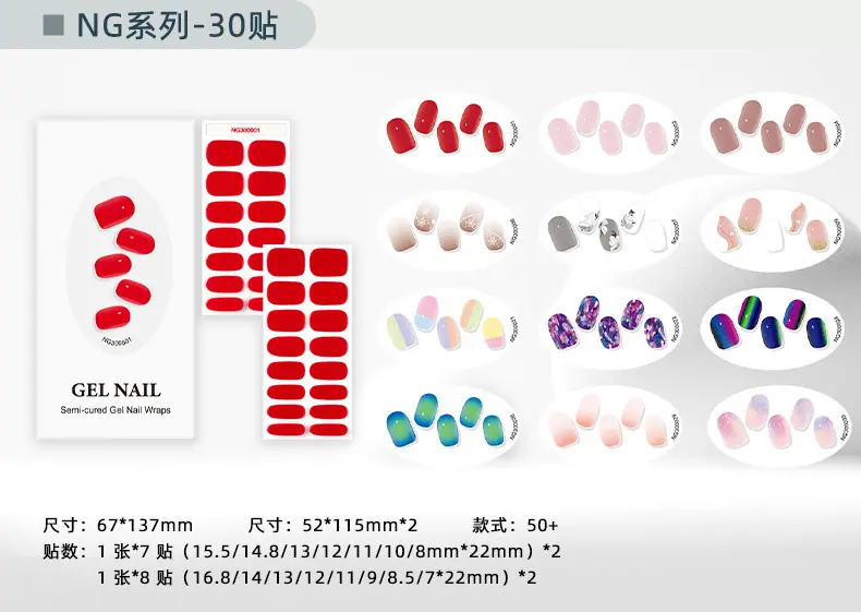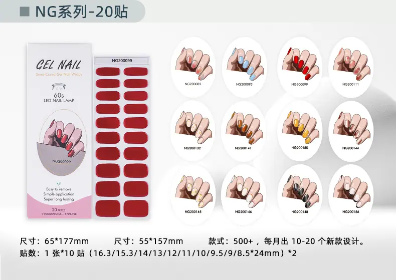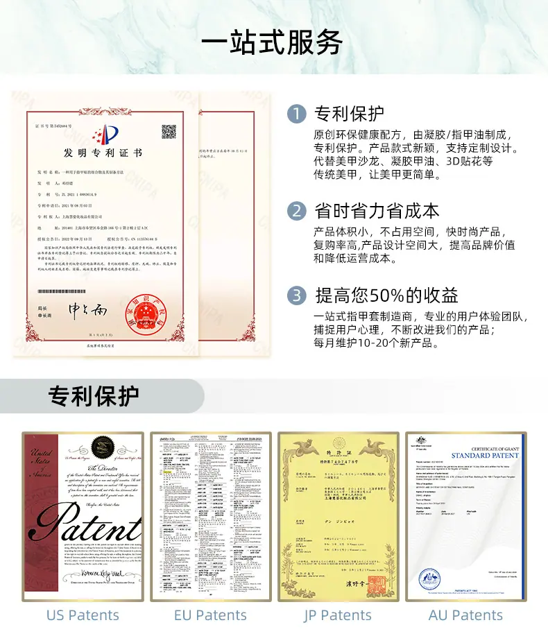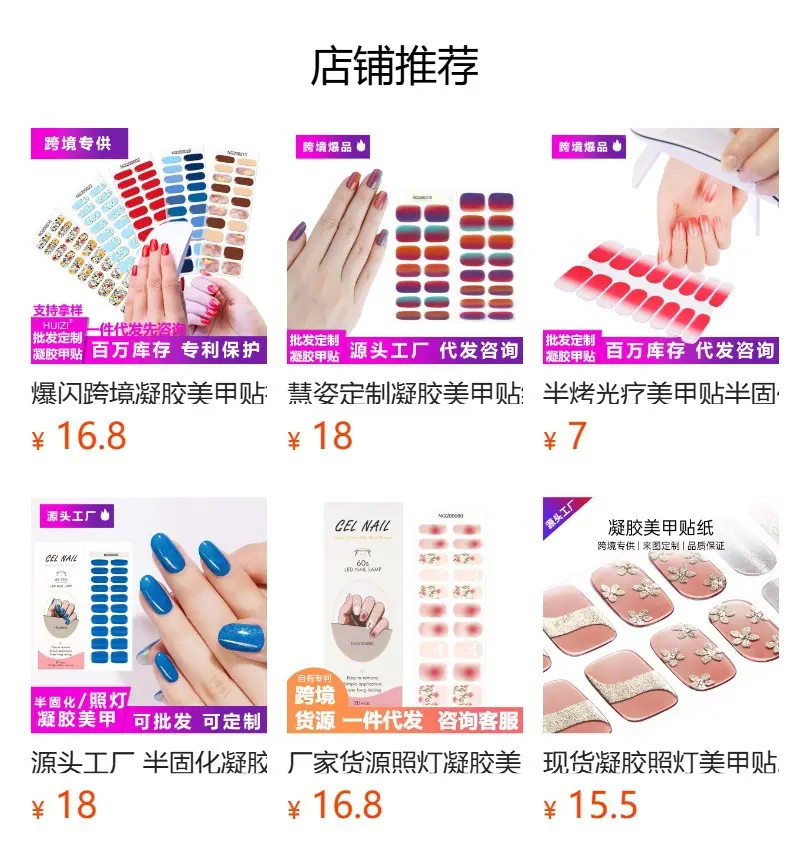 El nail art en gel no es una pegatina de plástico ordinaria para uñas, está hecho de ingredientes de esmalte en gel, es más brillante y más respetuoso con el medio ambiente después de curar bajo una lámpara, terminadoSGS、BSCI、ISO、GMP、FSC y otros tipos de productos para uñas y cosméticosProceso de dar un título