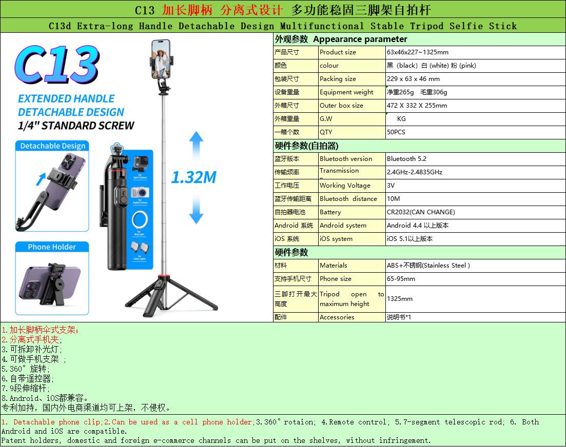 C13 black 1.32 meters stainless steel selfie stick bluetooth remote control, C13D black 1.35 m stainless steel...