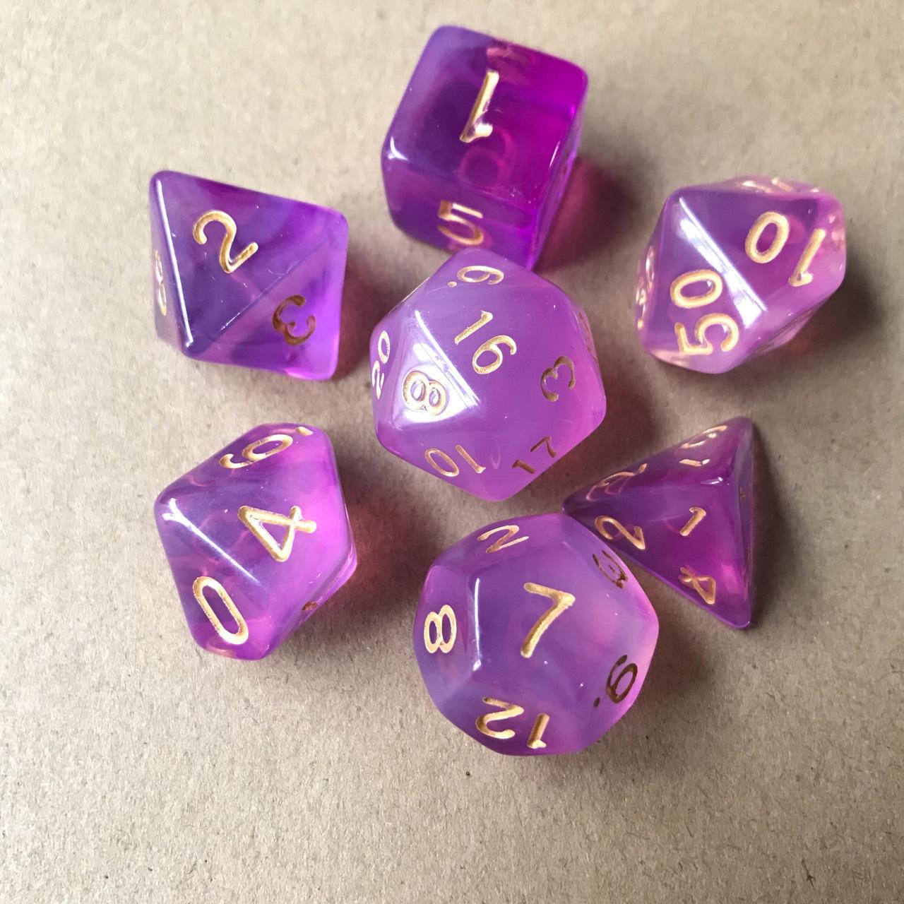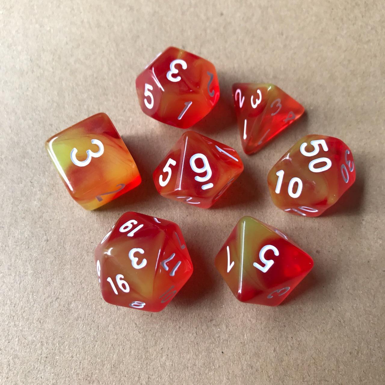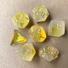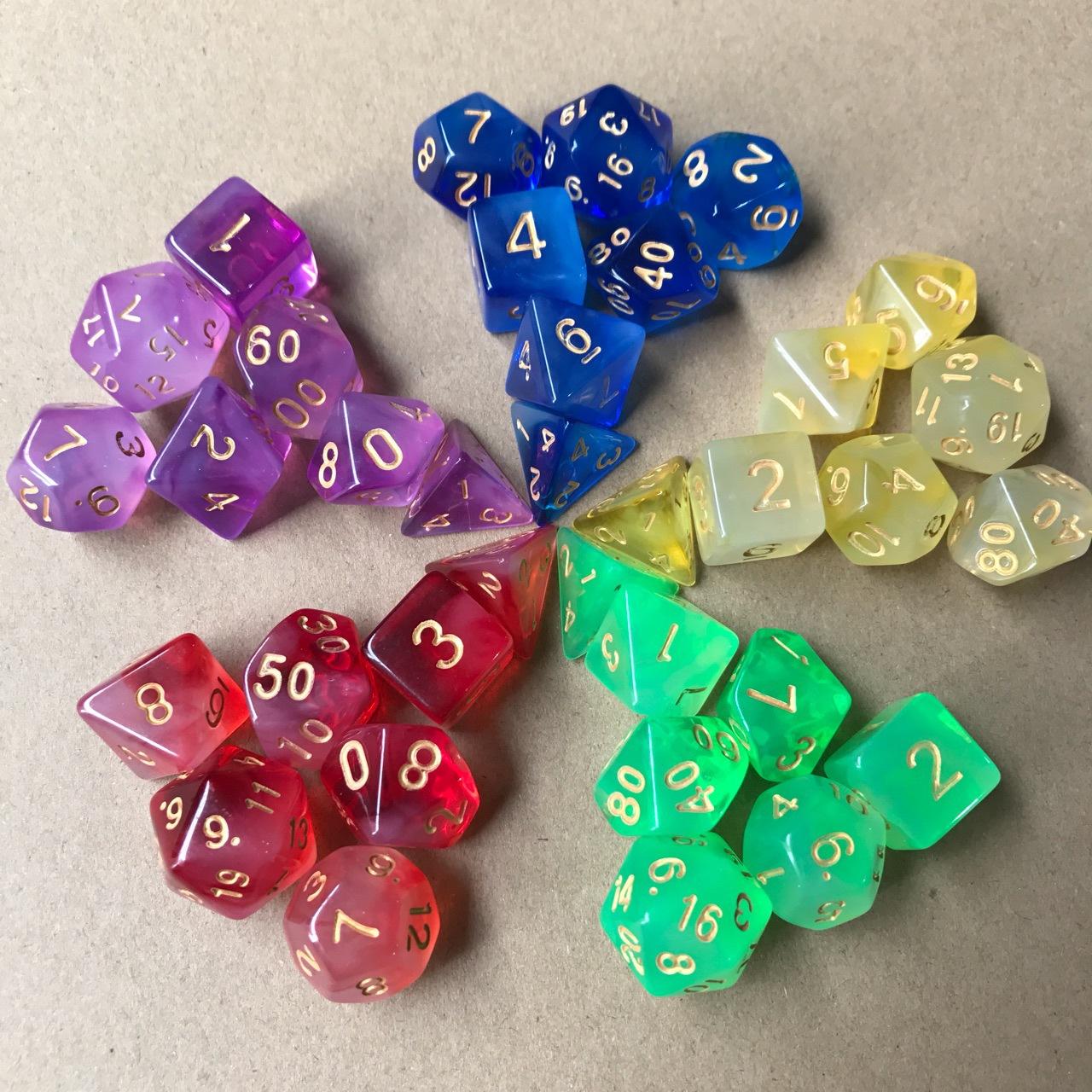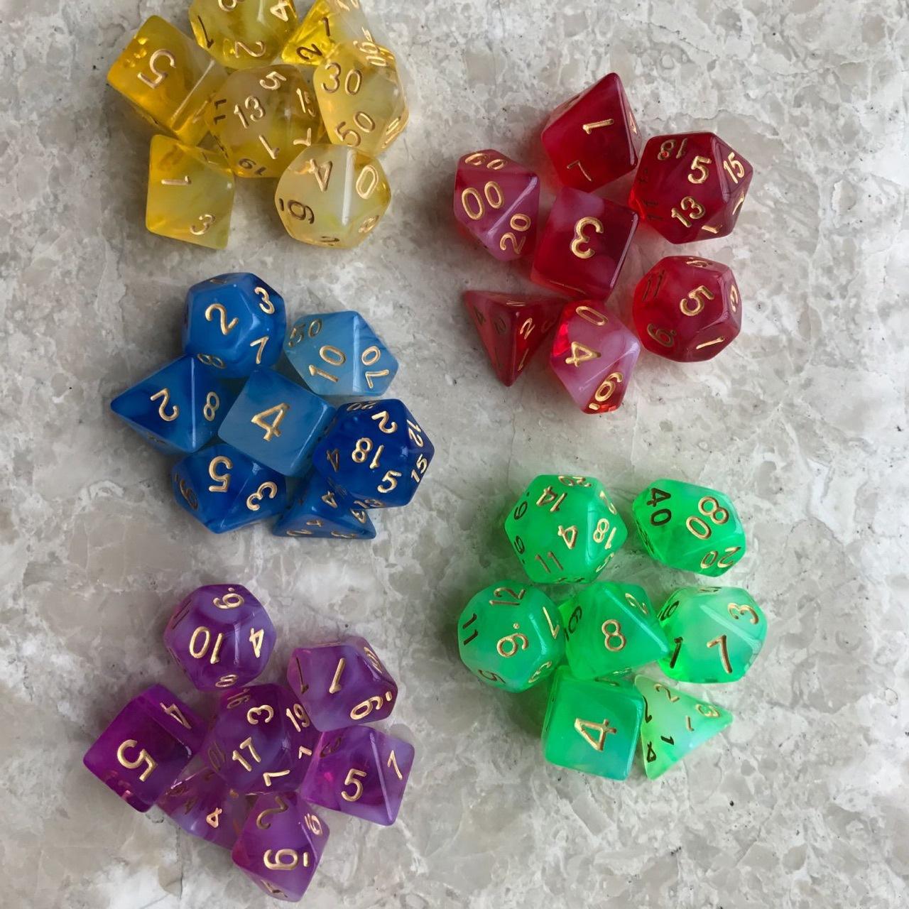 Especificación:Los 7 juegos son: 20 caras, 12 caras, 10 caras 0-9, 100 caras 00-90, 8 caras, 6 caras, 4 caras, 1 pieza cada uno (7 piezas/juego)