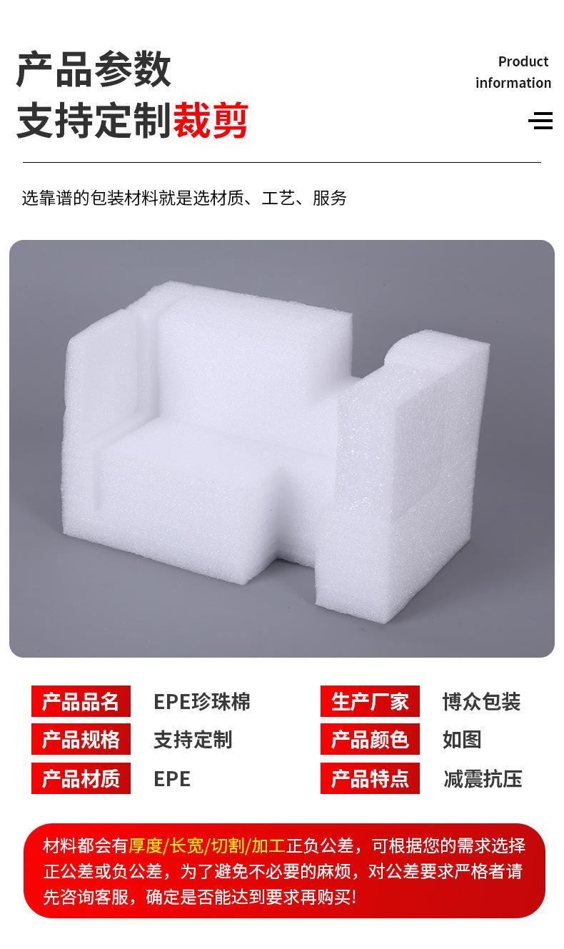 Kunshan Bozhong Packaging Co., Ltd. se encuentra en la calle Shaojing n.° 168, Zona de Desarrollo, ciudad de Kunshan. La empresa produce principalmente láminas y perfiles de algodón perlado EPE. Este nuevo producto se utiliza cada vez más en diversos sectores. Se caracteriza por su ligereza, resistencia a inundaciones, amortiguación, buena resistencia a ácidos y álcalis, etc. Se utiliza principalmente para el embalaje de diversos aparatos electrónicos, equipos electromecánicos de precisión, electrodomésticos, equipos electrónicos de alta sensibilidad, cosméticos, instrumentos ópticos, productos de vidrio, autopartes, calzado y diversas almohadillas para equipaje. Se pueden personalizar diversos estilos según las necesidades del cliente. No dude en contactarnos para negociar.