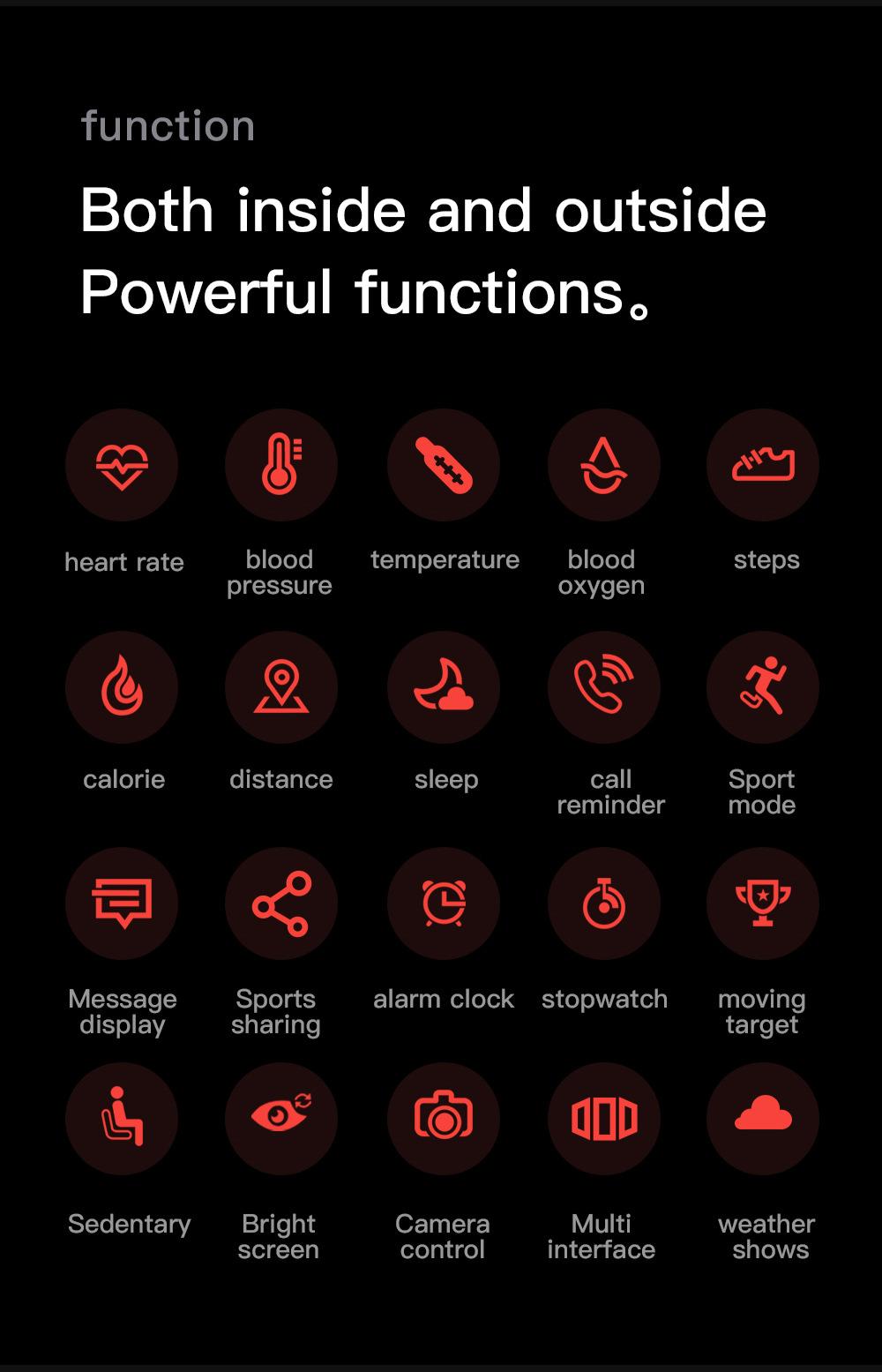 Waterproof, Step counting, Heart rate monitoring, Blood pressure measurement, Social Entertainment, Measure bo...