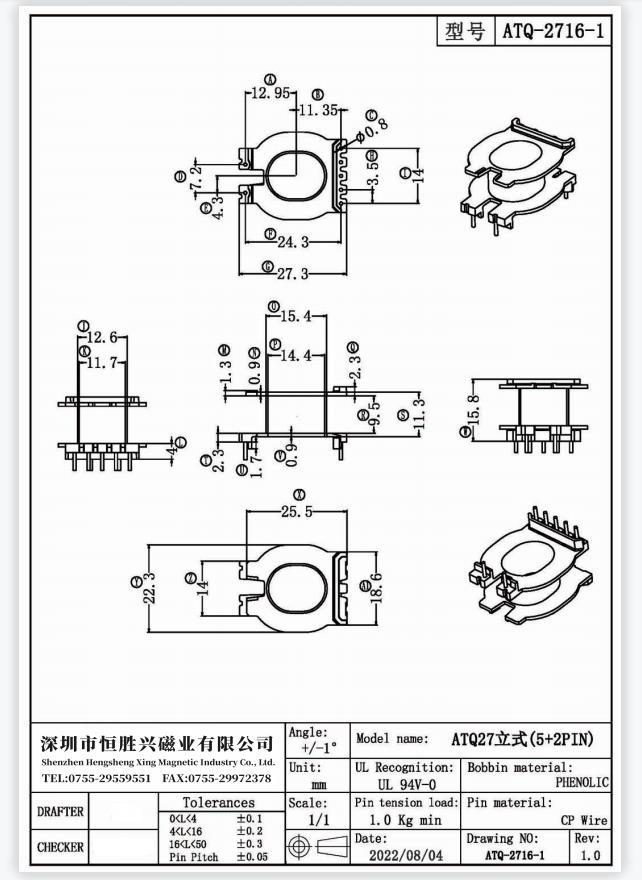 Hengshengxing fábrica mayoreo transformador de alta frecuencia ATQ2716-1 vertical 5+2 esqueleto