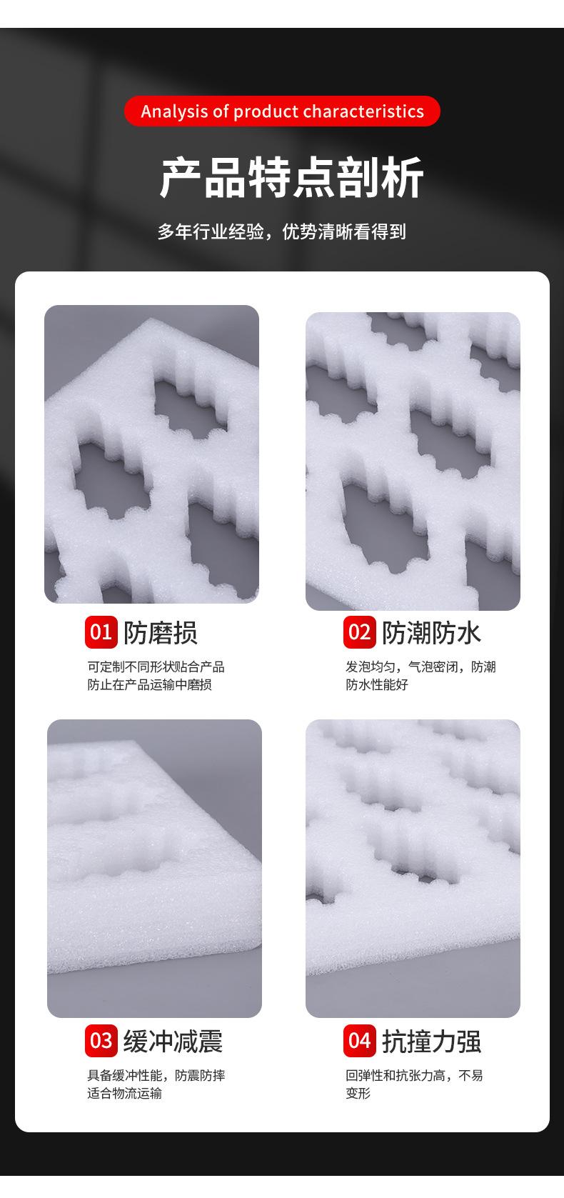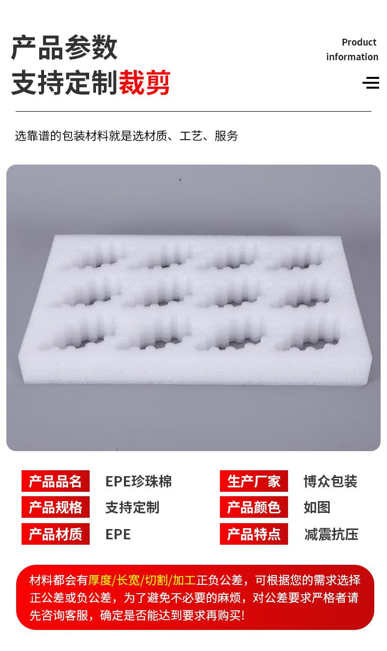 Kunshan Bozhong Packaging Co., Ltd. se encuentra en la calle Shaojing n.° 168, Zona de Desarrollo, ciudad de Kunshan. La empresa produce principalmente láminas y perfiles de algodón perlado EPE. Este nuevo producto se utiliza cada vez más en diversos sectores. Se caracteriza por su ligereza, resistencia a inundaciones, amortiguación, buena resistencia a ácidos y álcalis, etc. Se utiliza principalmente para el embalaje de diversos aparatos electrónicos, equipos electromecánicos de precisión, electrodomésticos, equipos electrónicos de alta sensibilidad, cosméticos, instrumentos ópticos, productos de vidrio, autopartes, calzado y diversas almohadillas para equipaje. Se pueden personalizar diversos estilos según las necesidades del cliente. No dude en contactarnos para negociar.