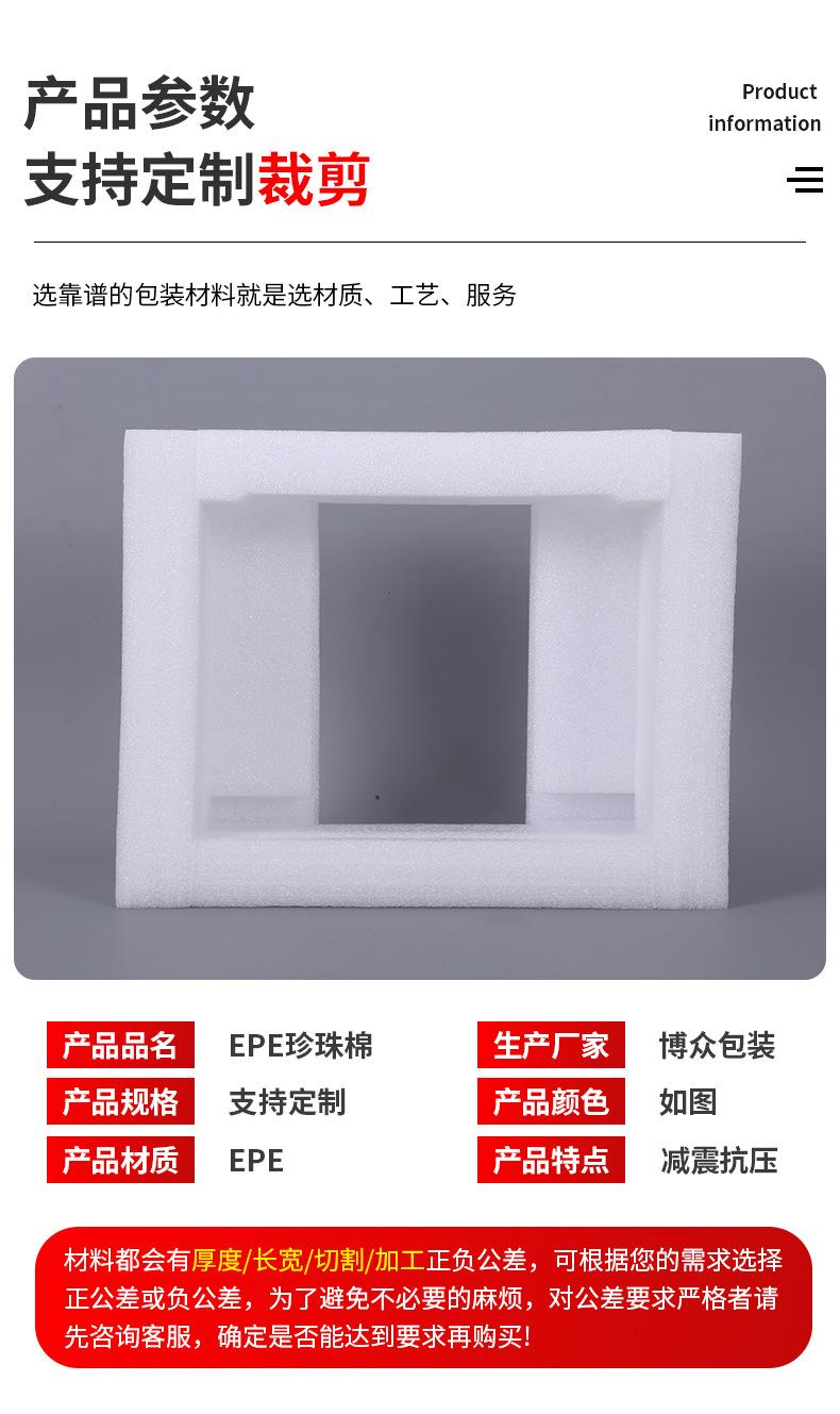 Kunshan Bozhong Packaging Co., Ltd. se encuentra en la calle Shaojing n.° 168, Zona de Desarrollo, ciudad de Kunshan. La empresa produce principalmente láminas y perfiles de algodón perlado EPE. Este nuevo producto se utiliza cada vez más en diversos sectores. Se caracteriza por su ligereza, resistencia a inundaciones, amortiguación, buena resistencia a ácidos y álcalis, etc. Se utiliza principalmente para el embalaje de diversos aparatos electrónicos, equipos electromecánicos de precisión, electrodomésticos, equipos electrónicos de alta sensibilidad, cosméticos, instrumentos ópticos, productos de vidrio, autopartes, calzado y diversas almohadillas para equipaje. Se pueden personalizar diversos estilos según las necesidades del cliente. No dude en contactarnos para negociar.