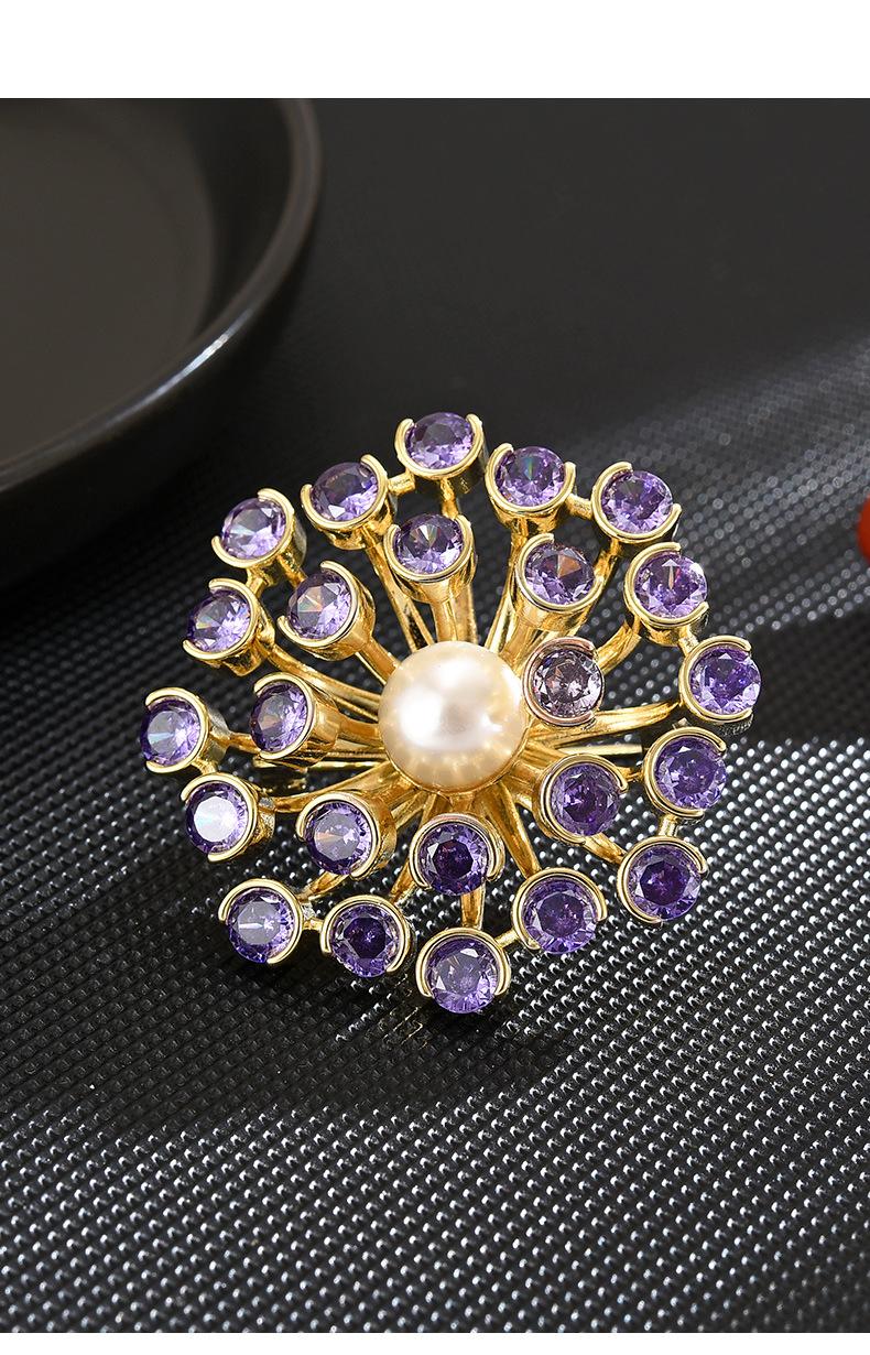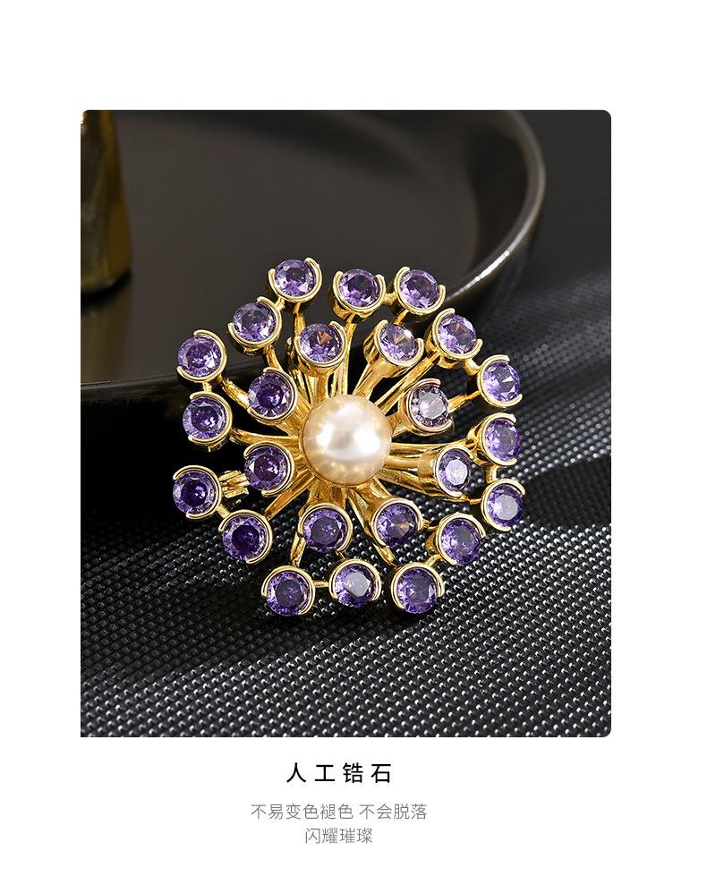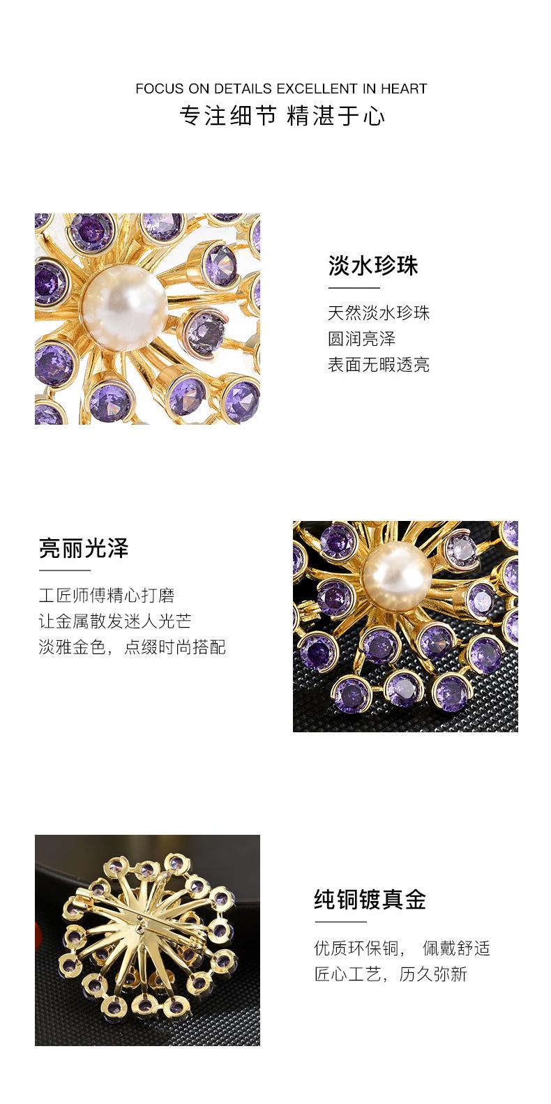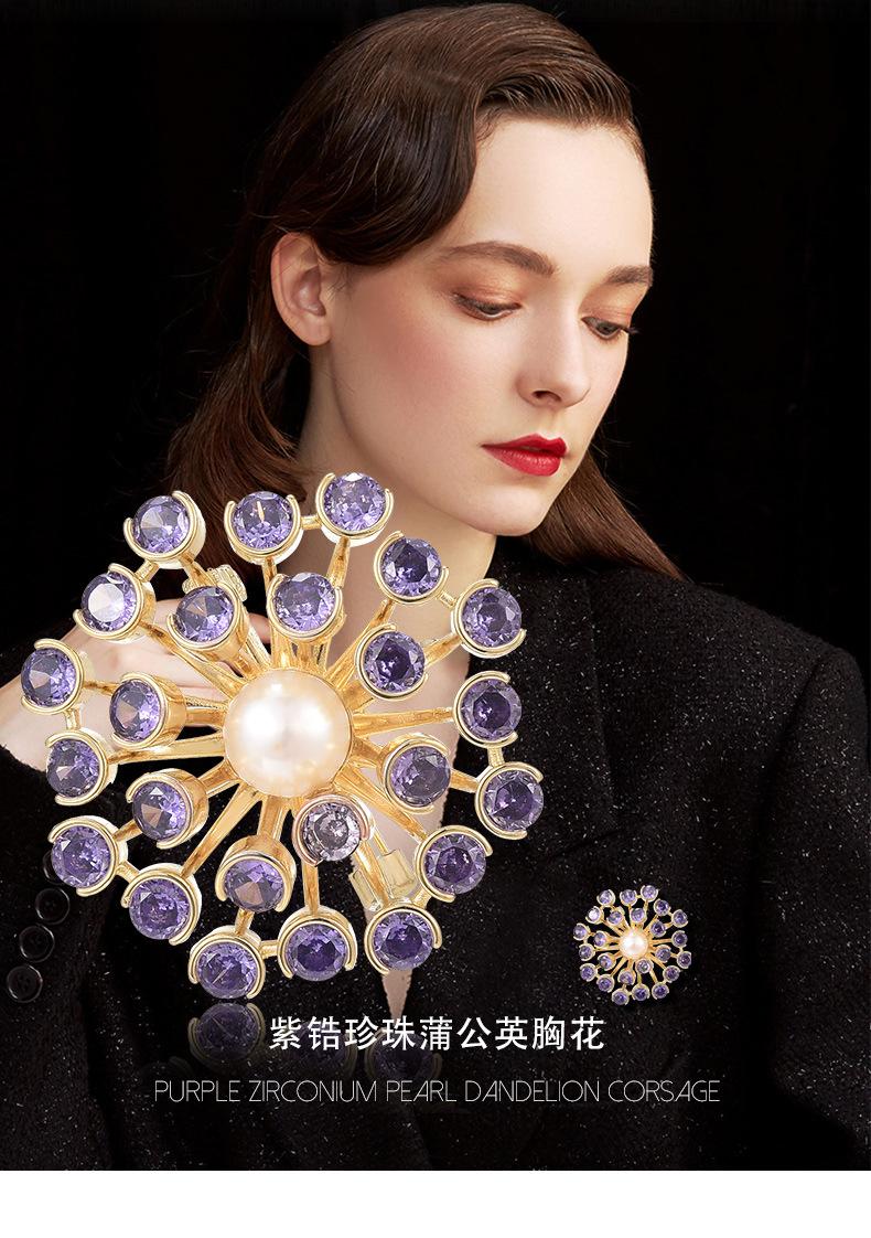 Broche europeo y americano de circonio púrpura diente de león perla abrigo pin de solapa personalizado accesorios femeninos exquisitos lujo pedrería hebilla de pin femenina