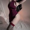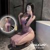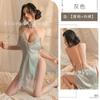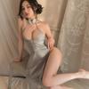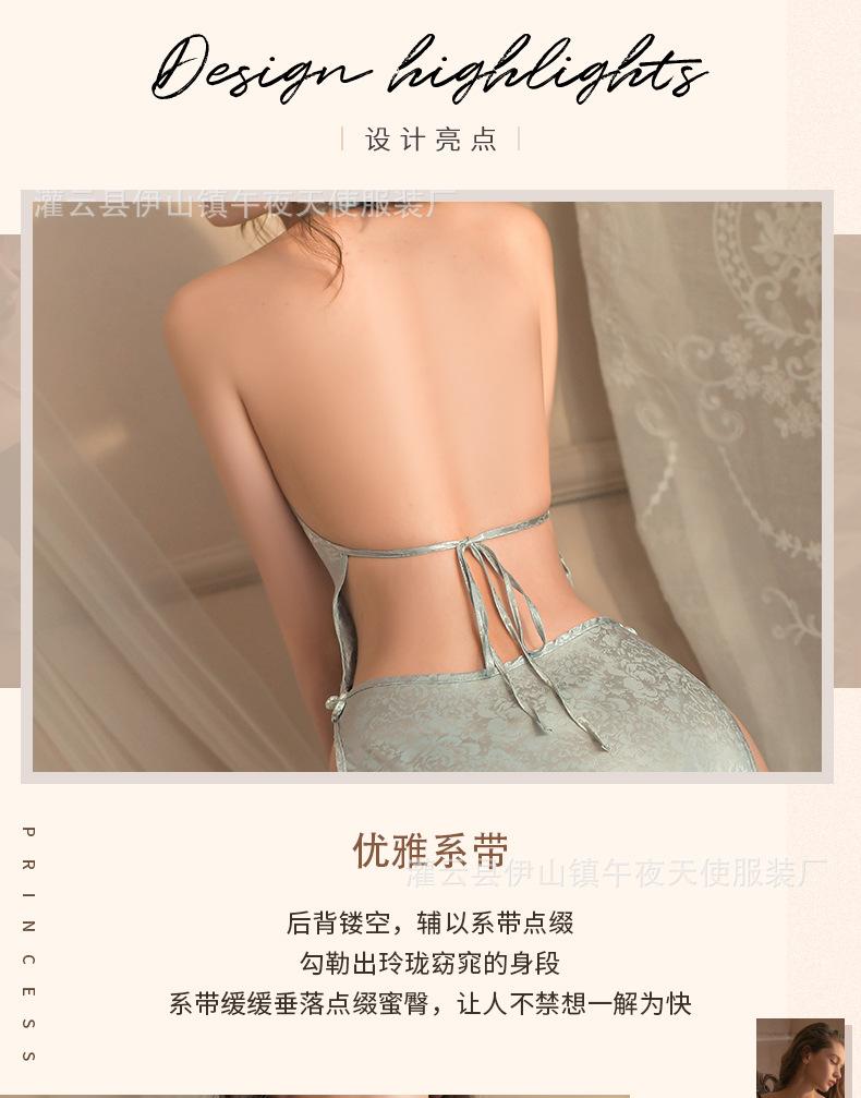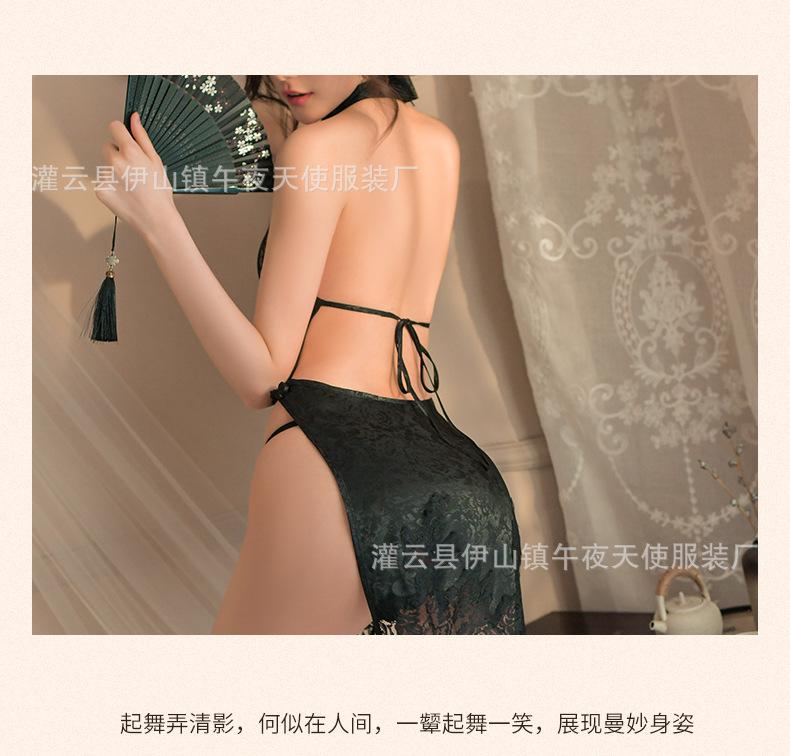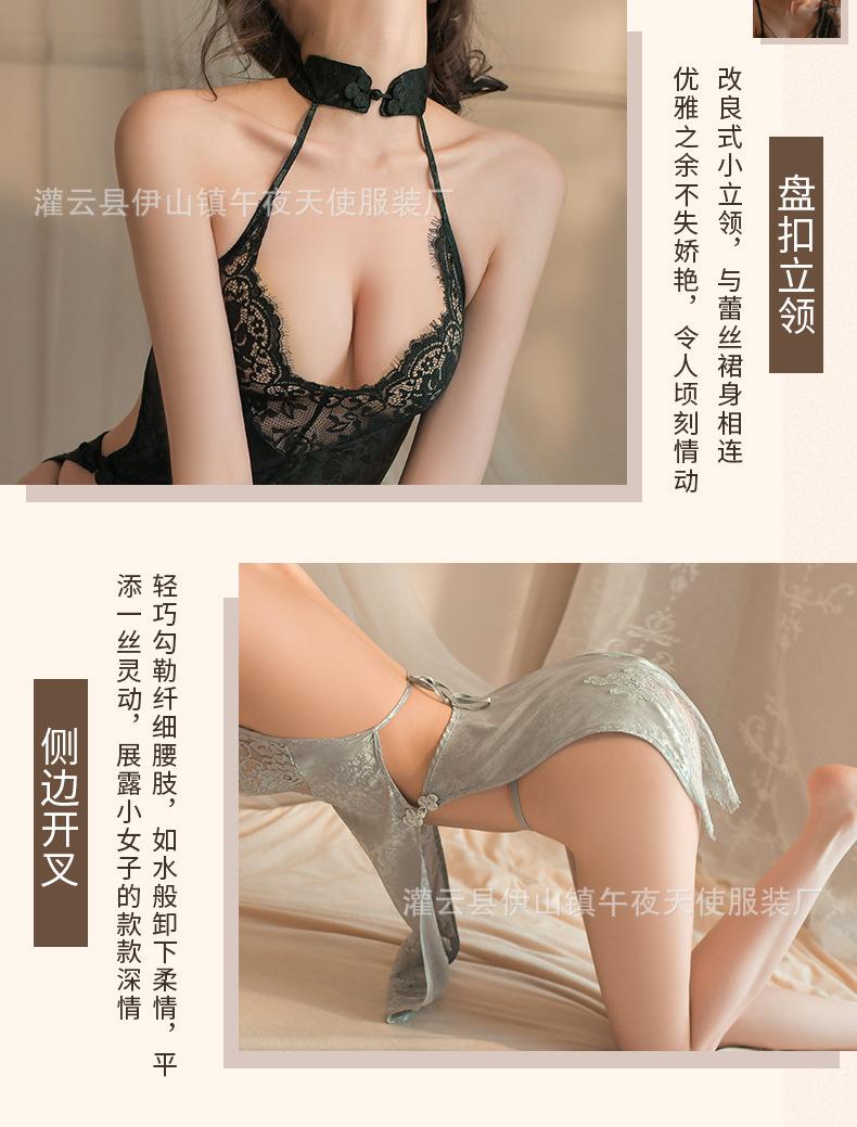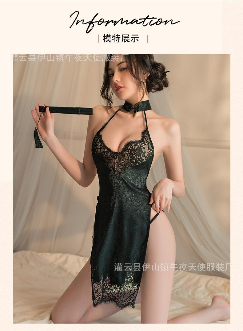Lencería Sexy Cuello Halter Encaje Transparente Cintura Alta Falda con Abertura Uniforme Cheongsam Traje No Desmontable para Mujer 9694