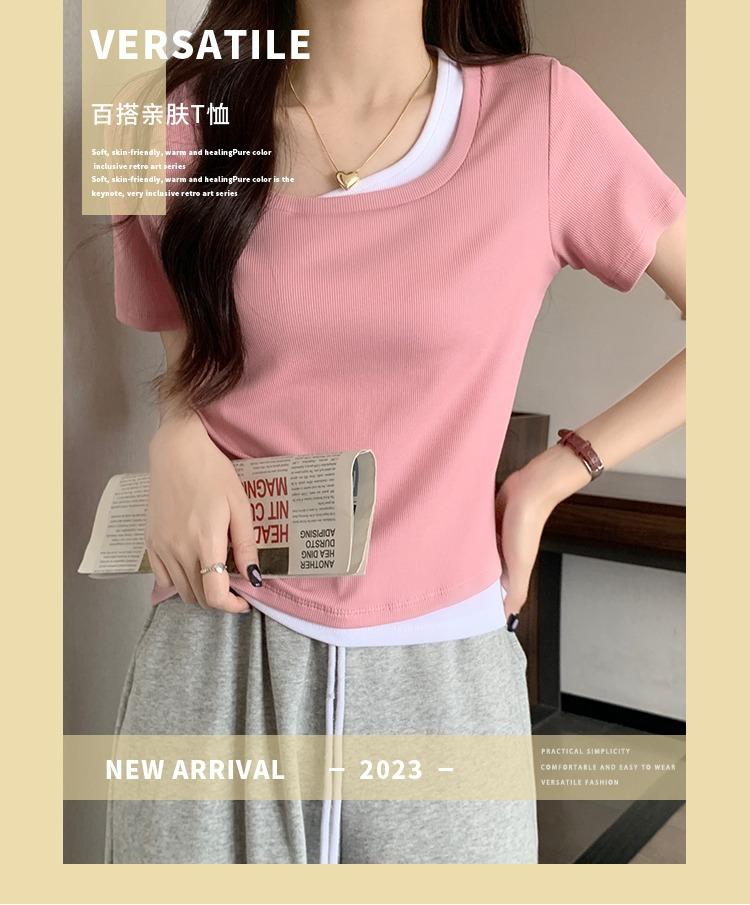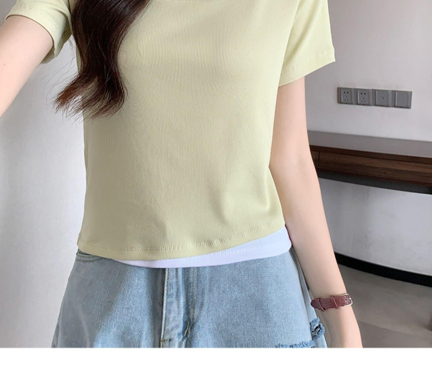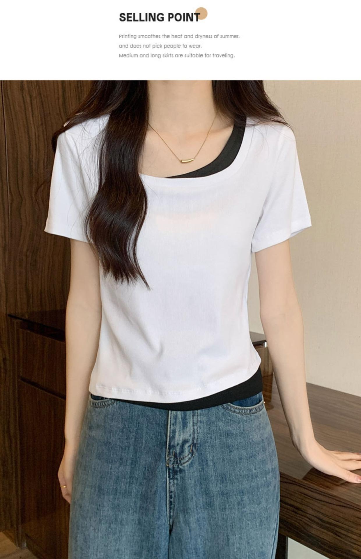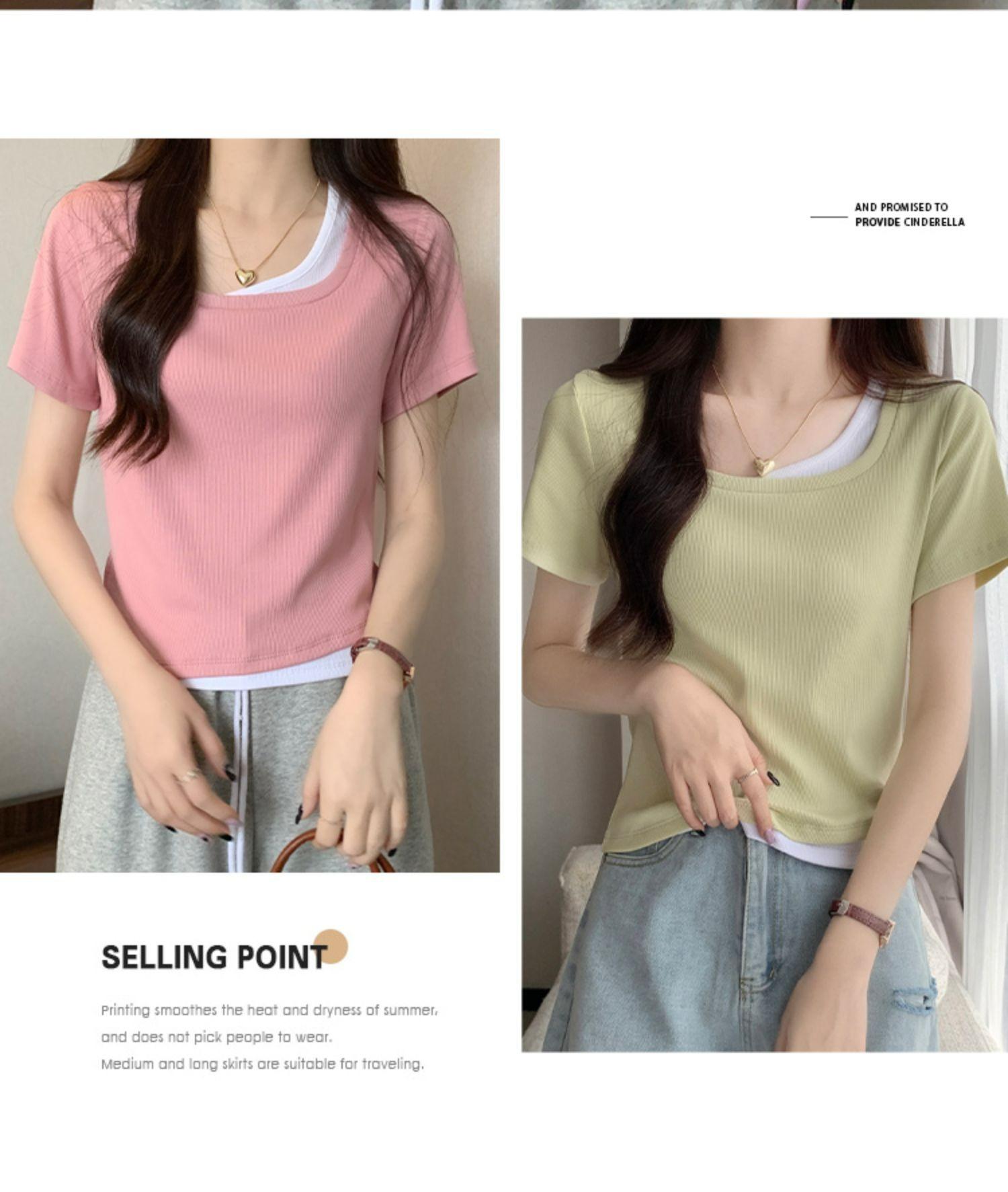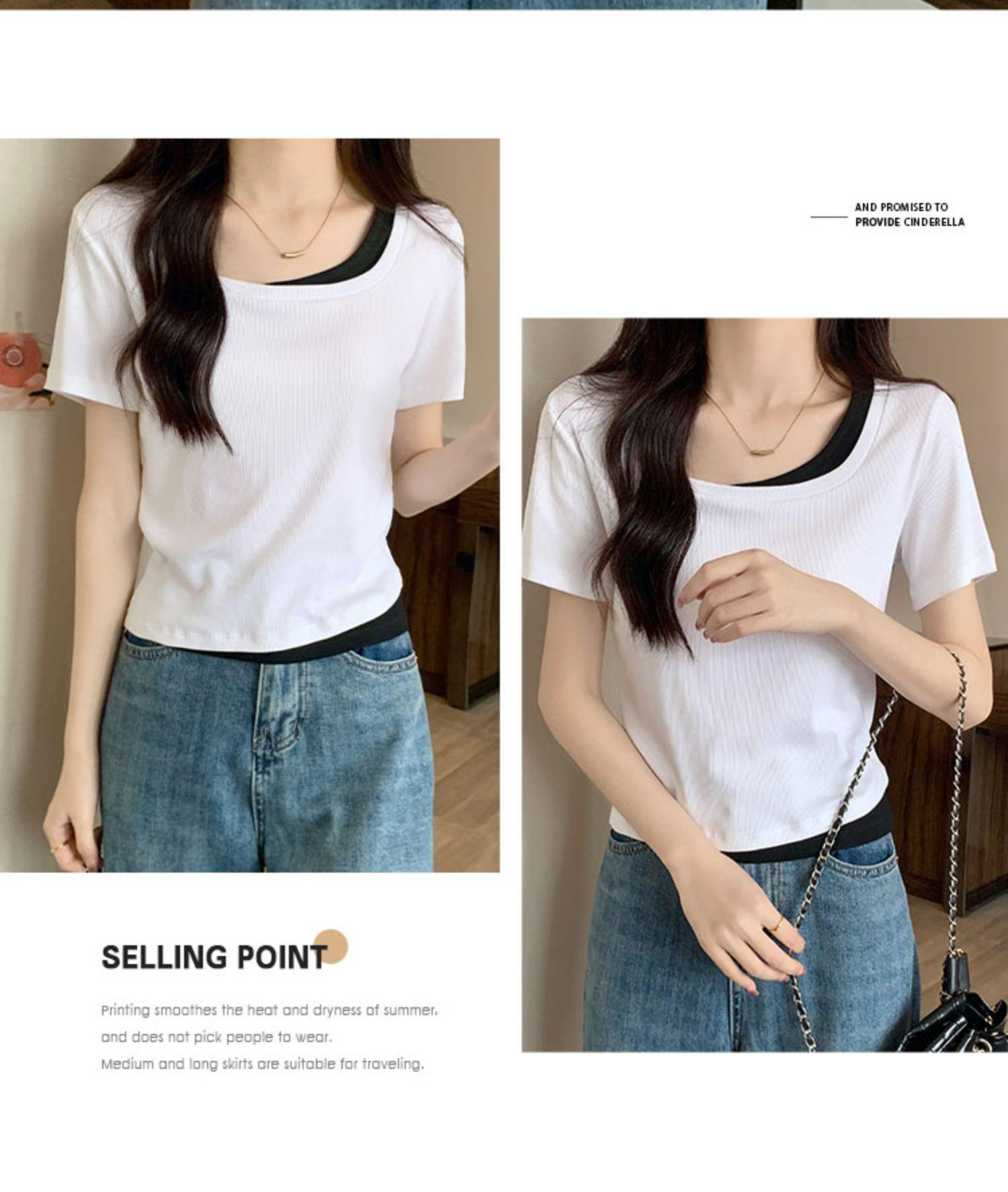 Diseño Delgado Clavícula Hombro Derecho Camiseta Falsa de Dos Piezas para Mujer Manga Corta Verano 2025 Estilo Súper Hot Chic Sexy Top
