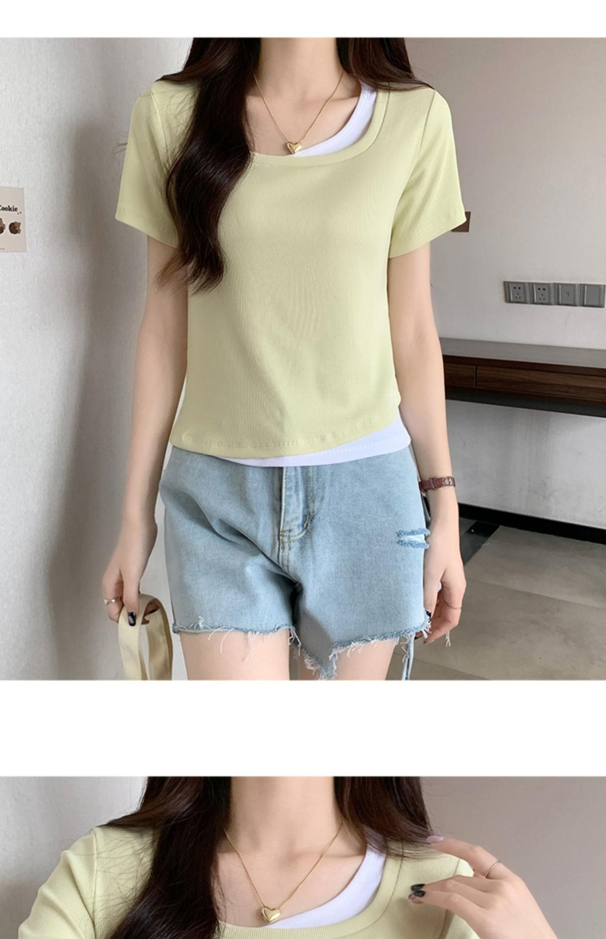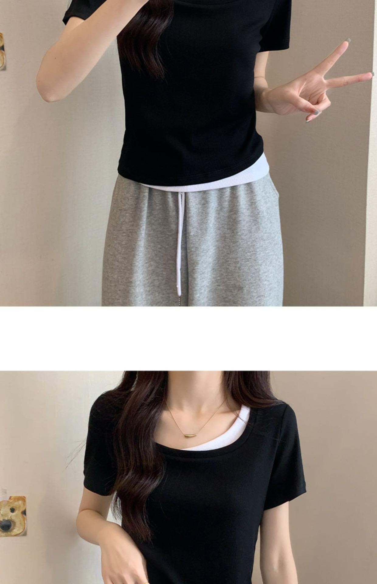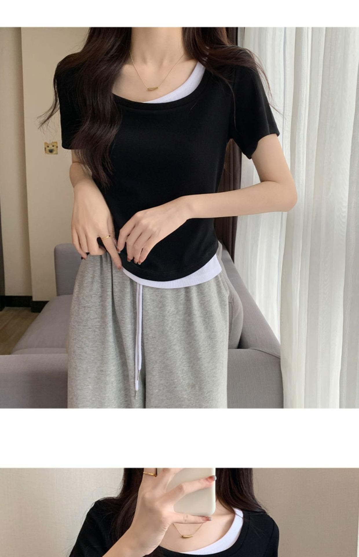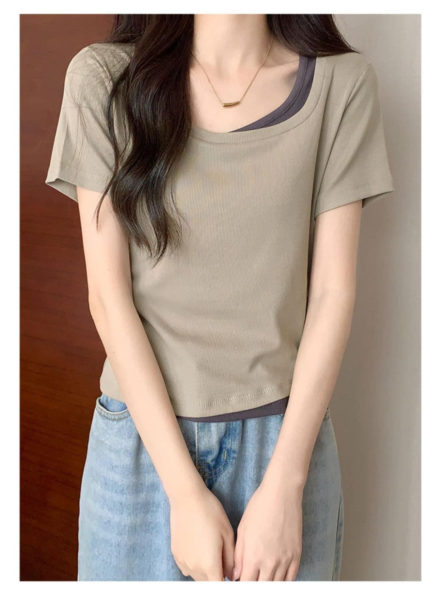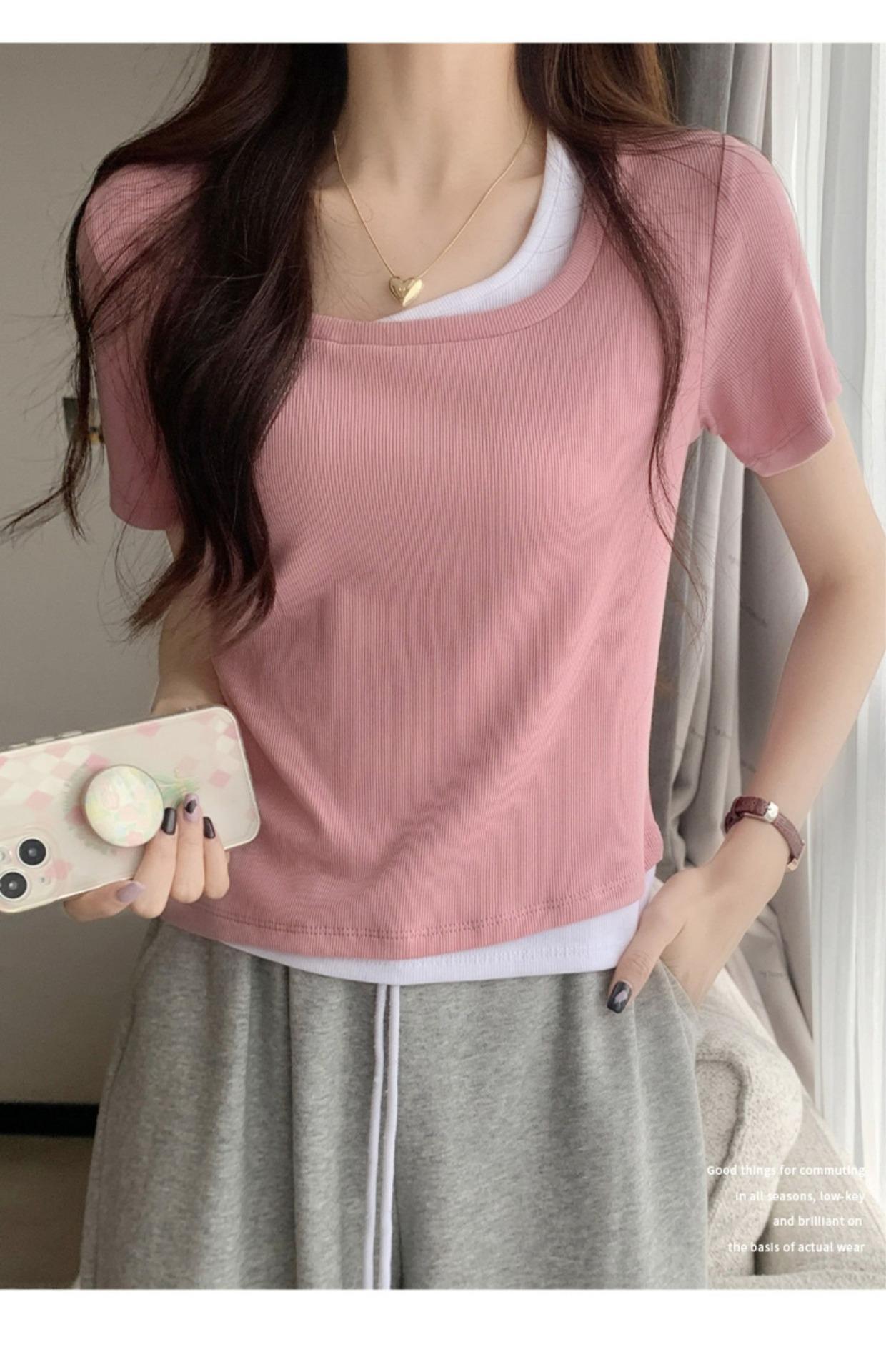 Diseño Delgado Clavícula Hombro Derecho Camiseta Falsa de Dos Piezas para Mujer Manga Corta Verano 2025 Estilo Súper Hot Chic Sexy Top