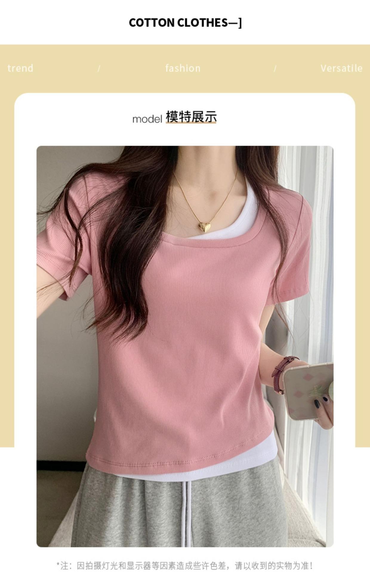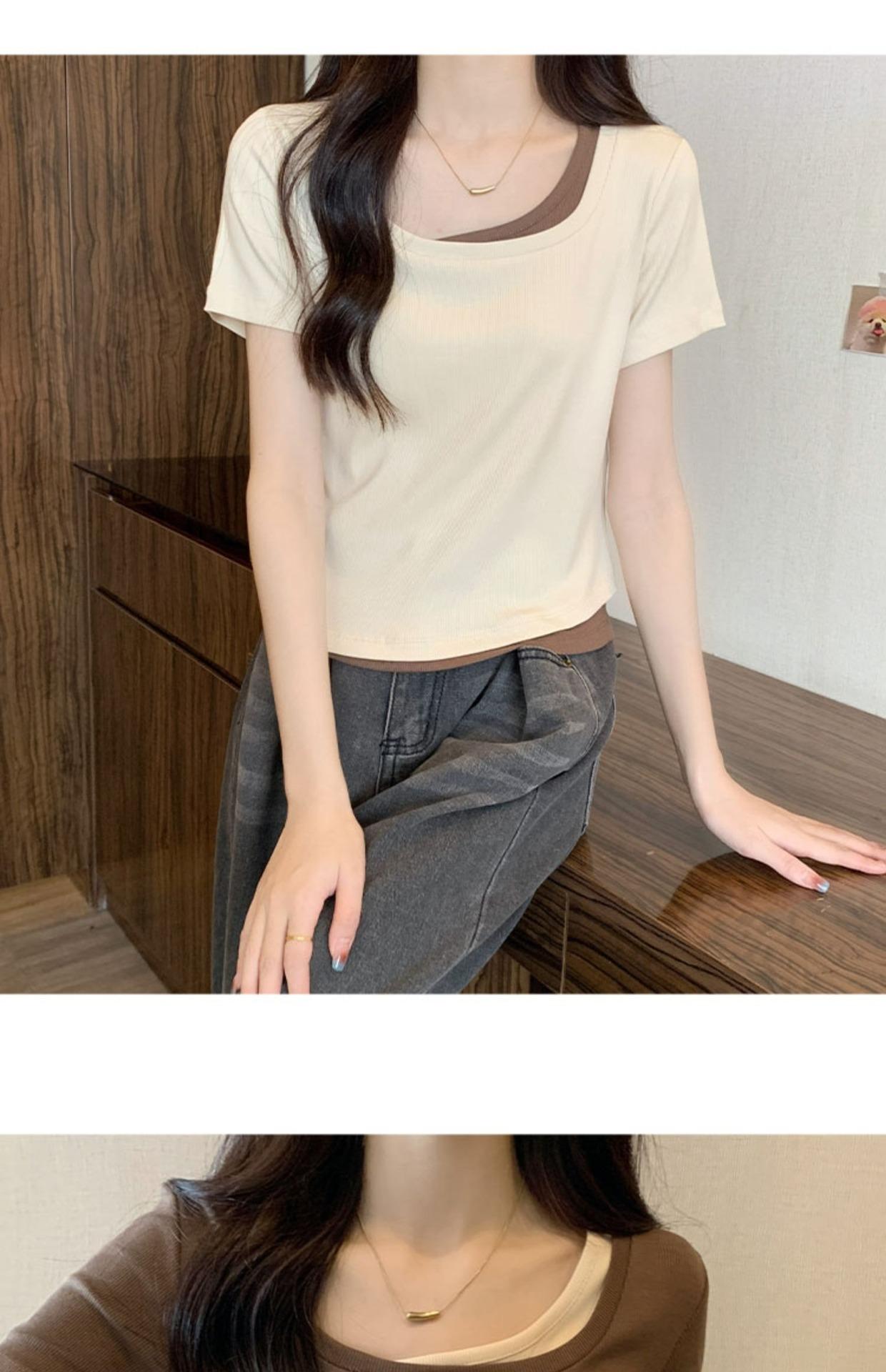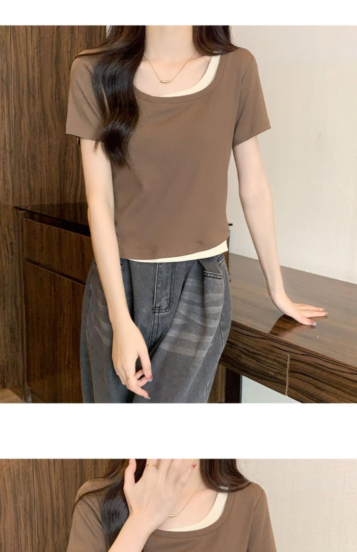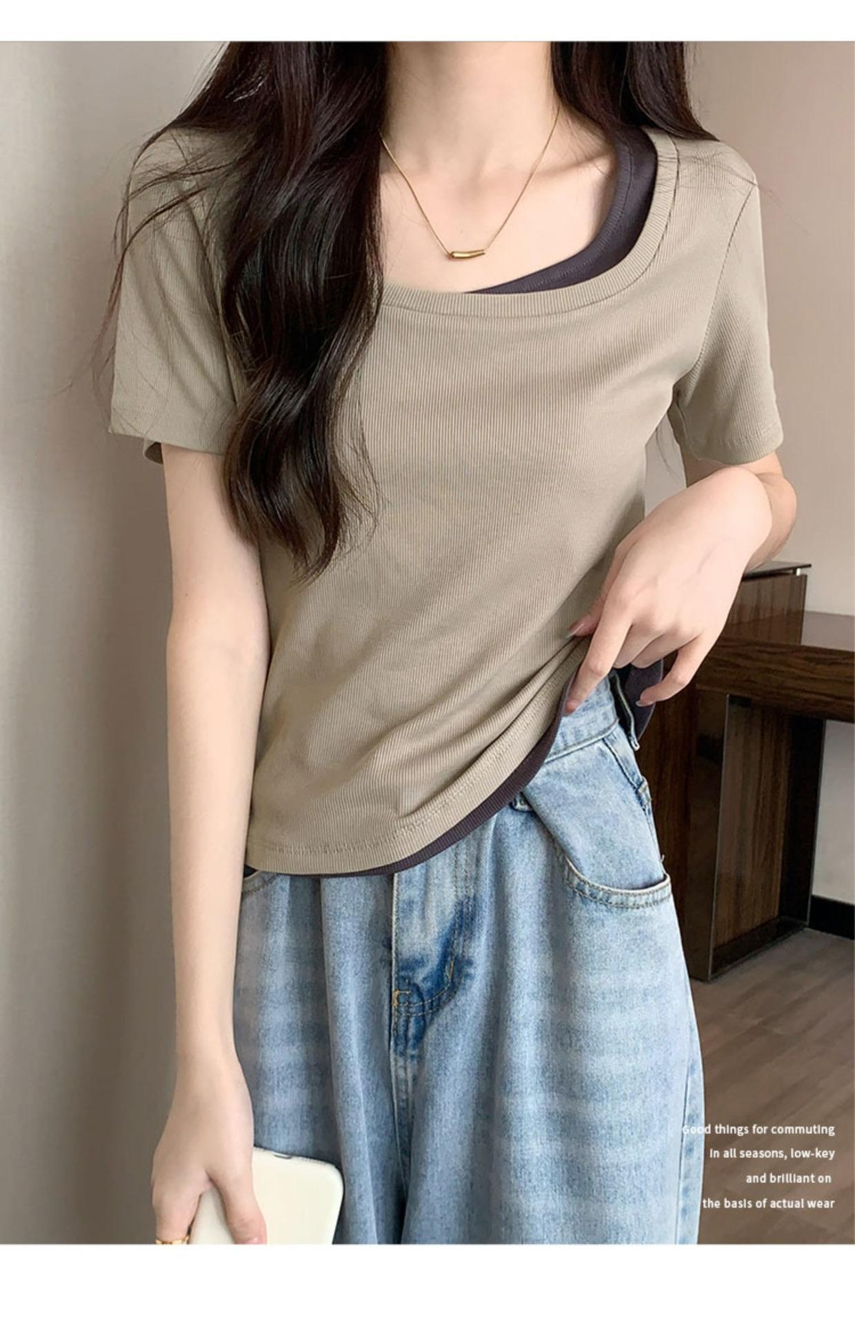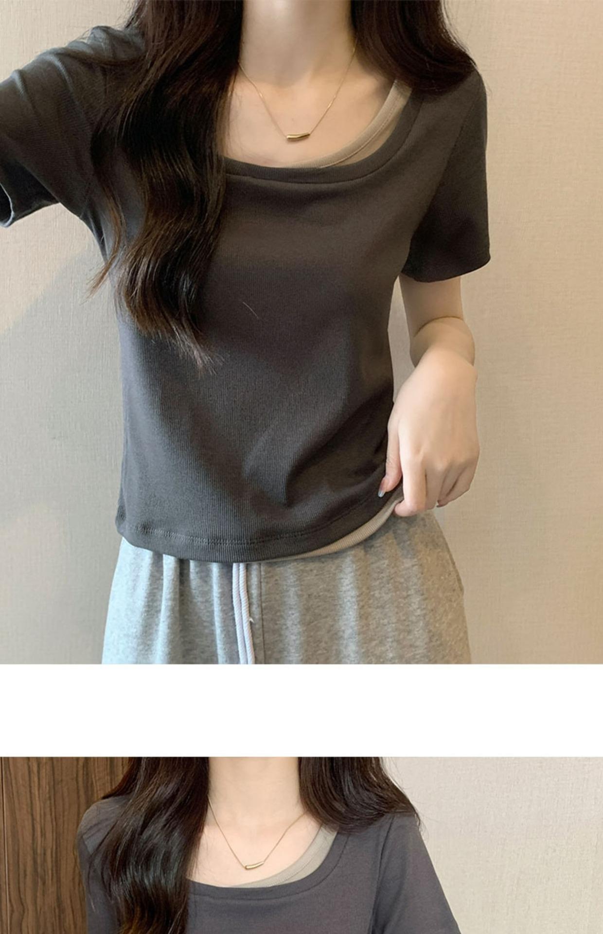 Diseño Delgado Clavícula Hombro Derecho Camiseta Falsa de Dos Piezas para Mujer Manga Corta Verano 2025 Estilo Súper Hot Chic Sexy Top