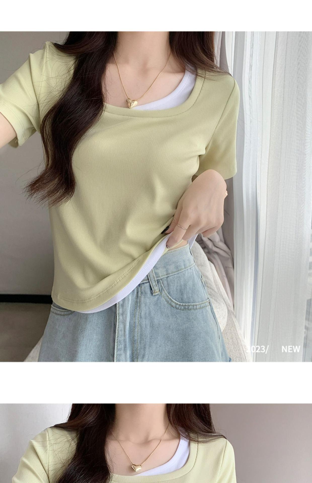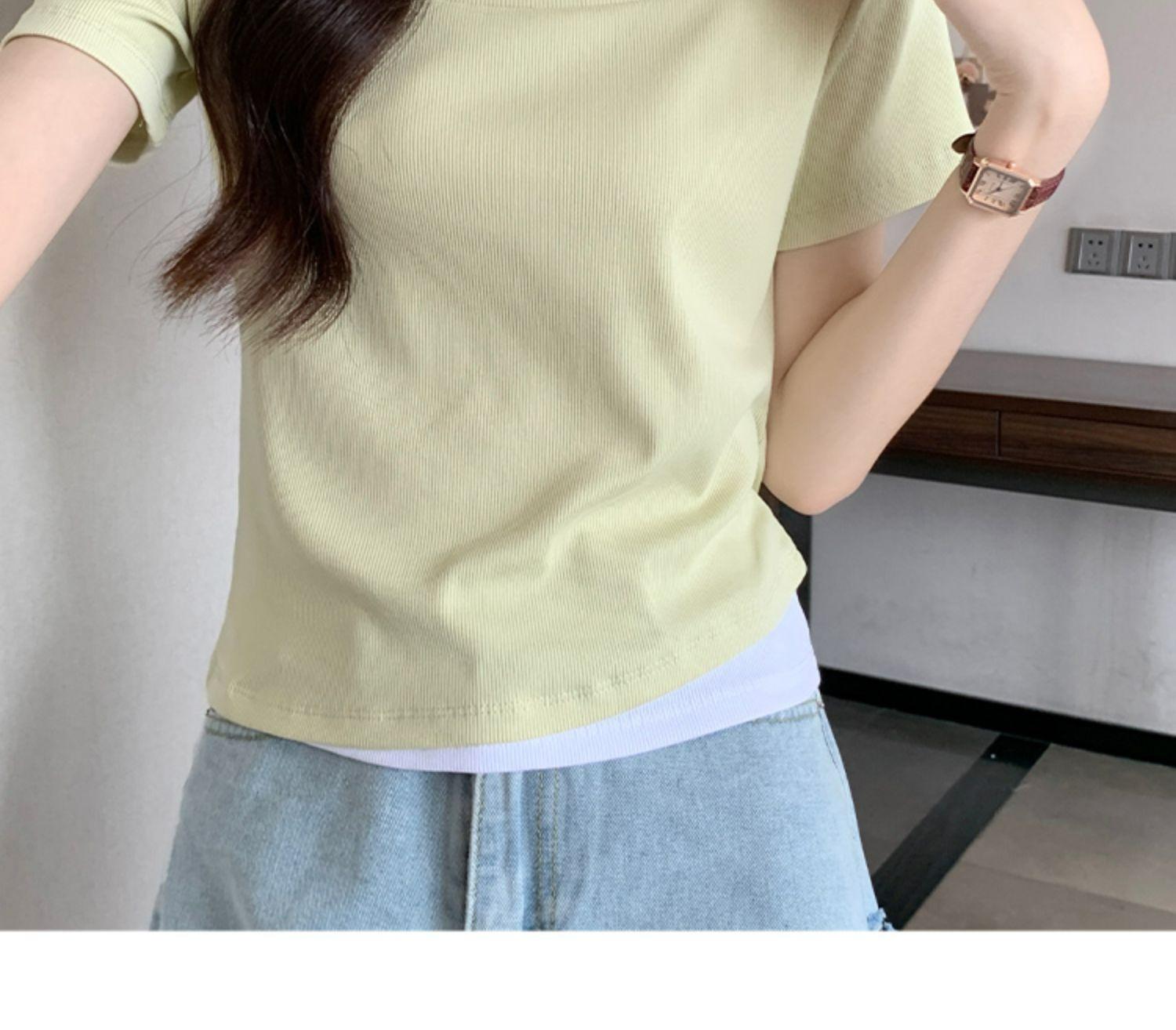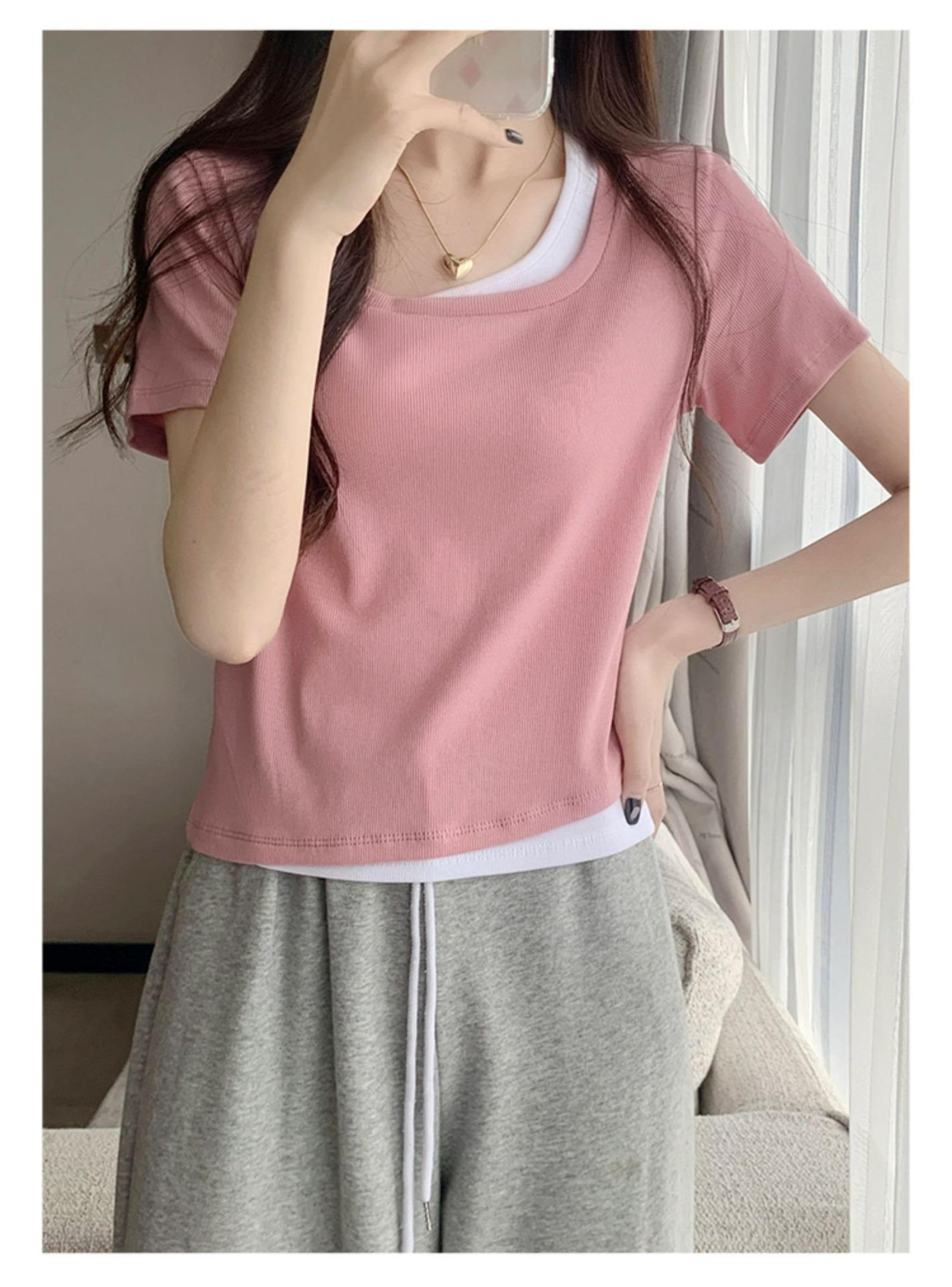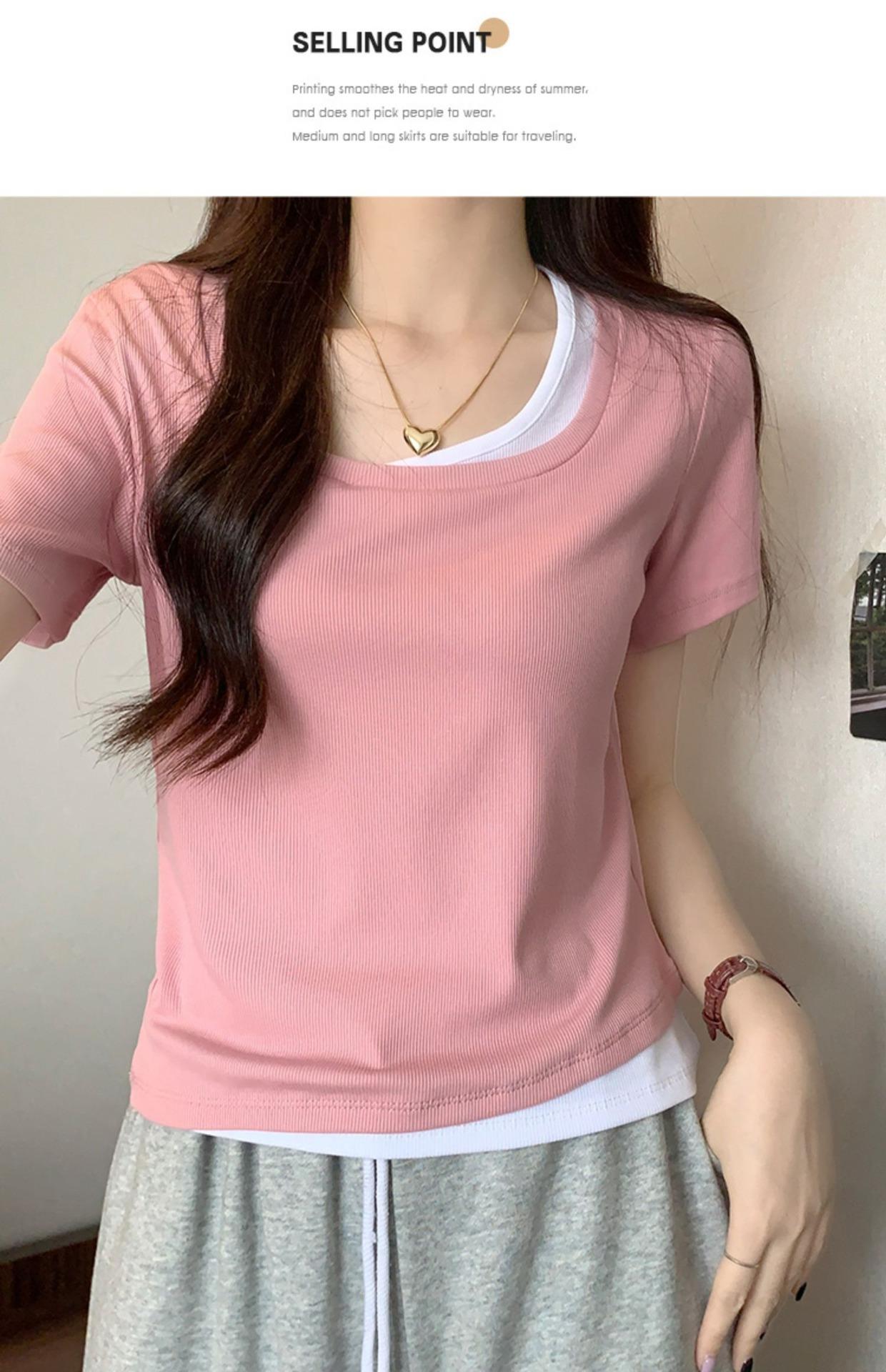 Diseño Delgado Clavícula Hombro Derecho Camiseta Falsa de Dos Piezas para Mujer Manga Corta Verano 2025 Estilo Súper Hot Chic Sexy Top