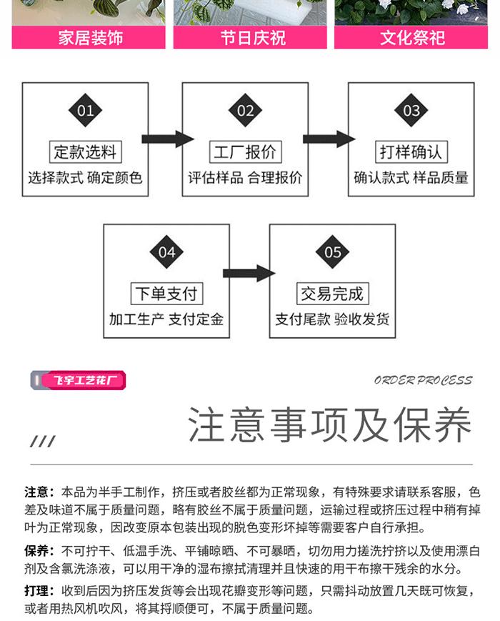 Estimado cliente, nuestra tienda produce y vende al por mayor todo tipo de flores y plantas artificiales. En principio, solo vendemos artículos grandes, pero también aceptamos muestras. Sin embargo, no se admiten devoluciones ni cambios de los productos de muestra. Por ejemplo, si compra solo uno o dos ejemplares de cada tipo, comprar uno o dos de varias variedades se considera una muestra. No se admiten reembolsos. Le rogamos que lo lea detenidamente antes de realizar un pedido. Disculpe las molestias. ¡Gracias por su cooperación!