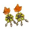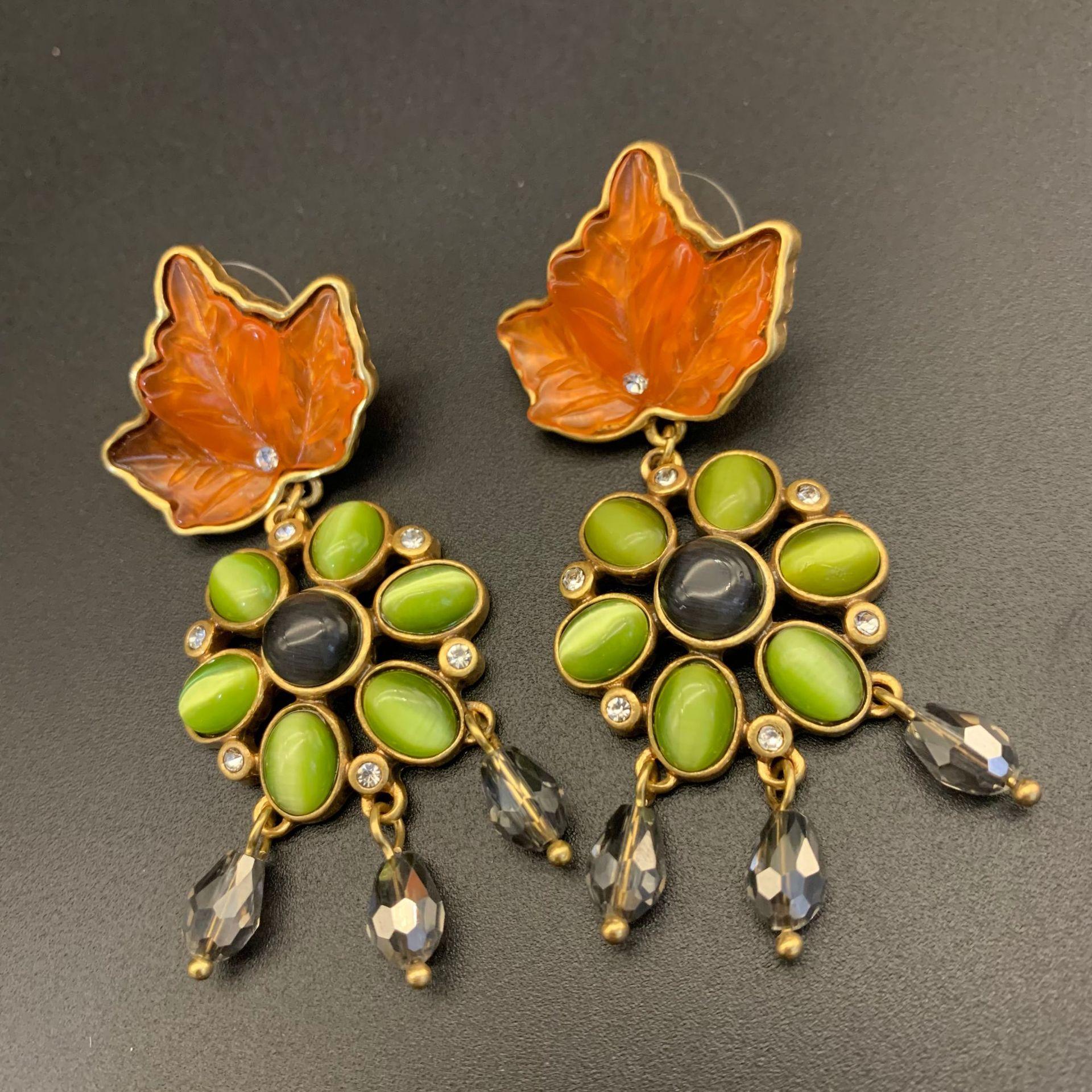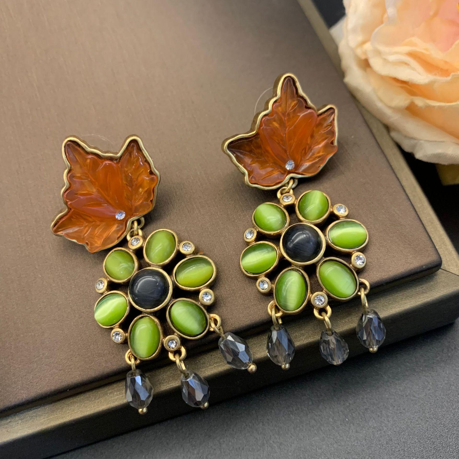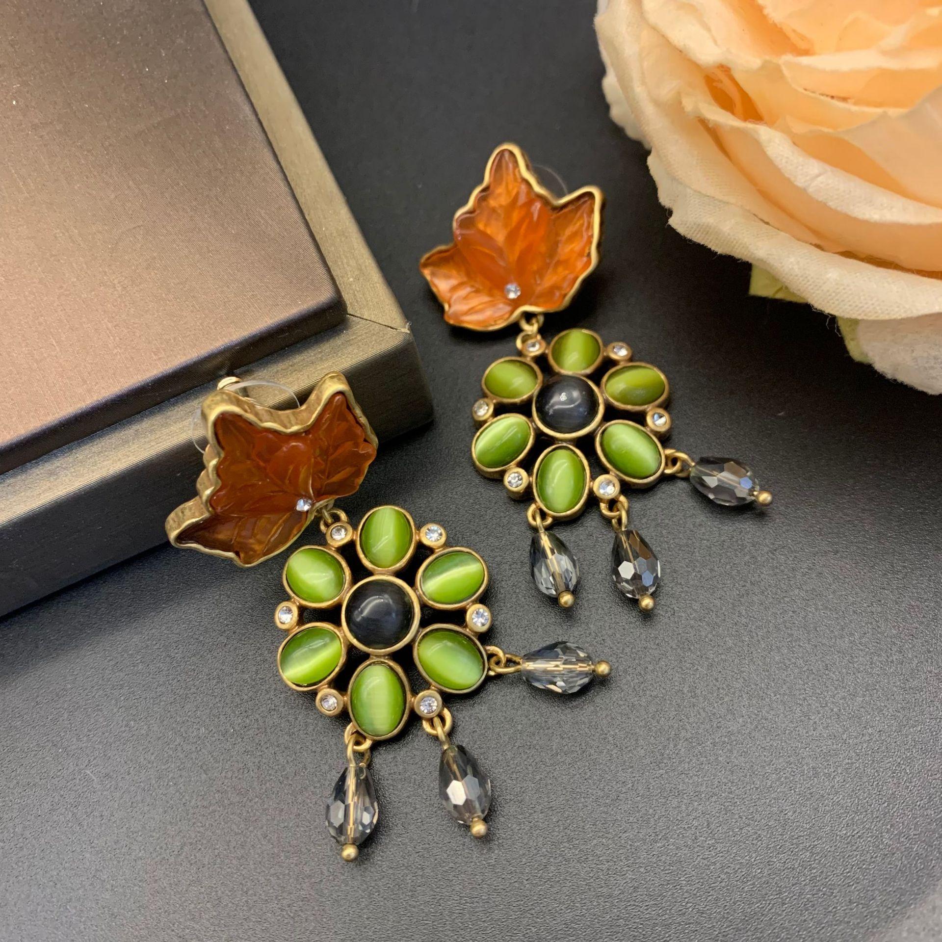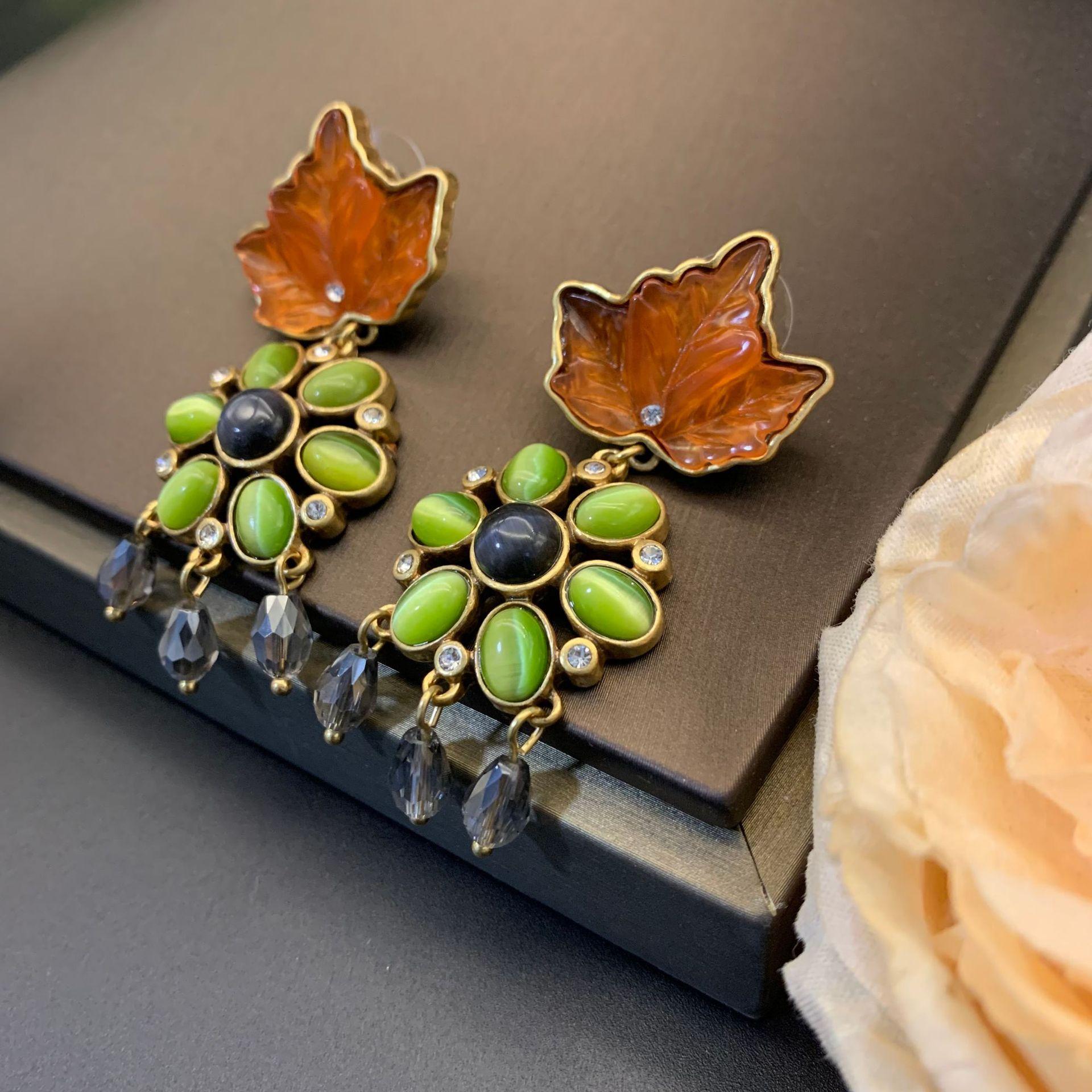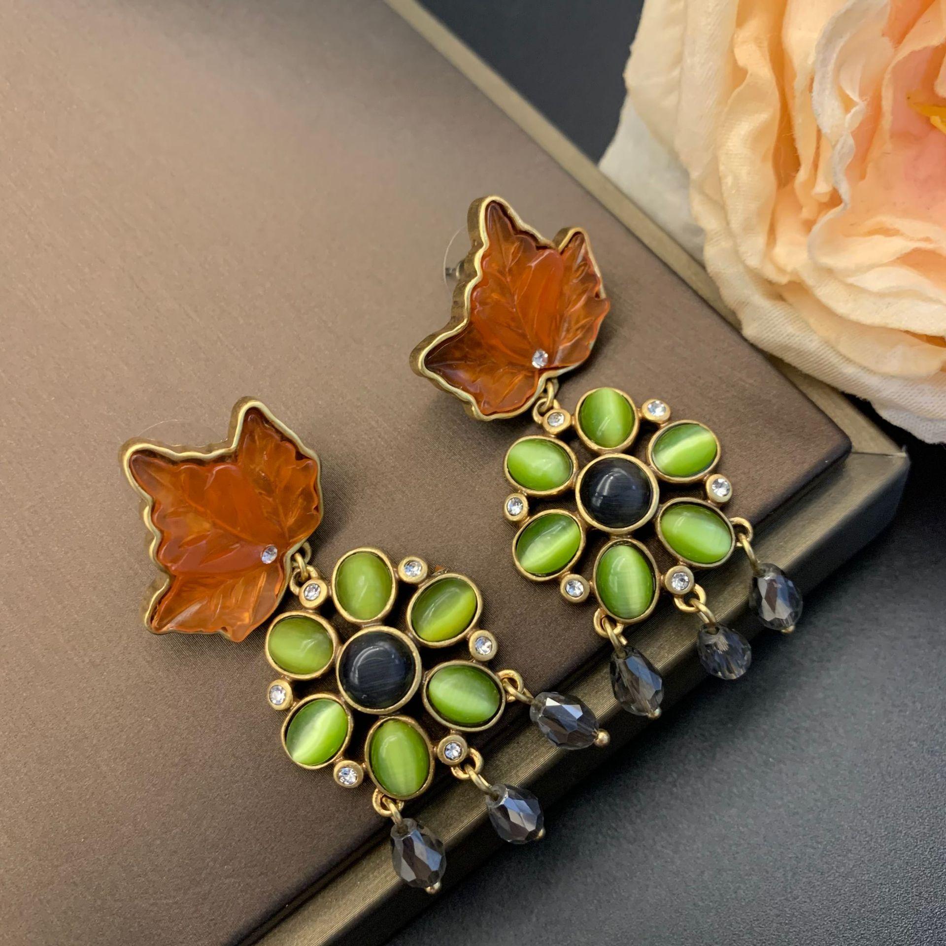 [Finales de otoño sin rastro] Pendientes largos de flores retro vintage con entrada de nicho, conjunto antiguo de lujo de estilo medio, pendientes de piedra de ojo de gato