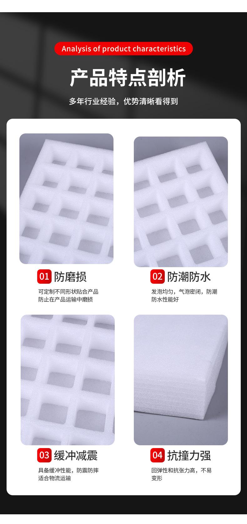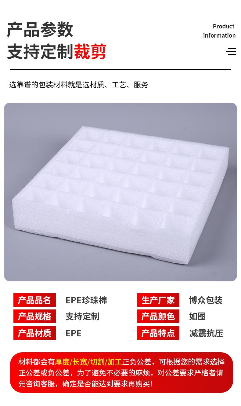 Kunshan Bozhong Packaging Co., Ltd. se encuentra en la calle Shaojing n.° 168, Zona de Desarrollo, ciudad de Kunshan. La empresa produce principalmente láminas y perfiles de algodón perlado EPE. Este nuevo producto se utiliza cada vez más en diversos sectores. Se caracteriza por su ligereza, resistencia a inundaciones, amortiguación, buena resistencia a ácidos y álcalis, etc. Se utiliza principalmente para el embalaje de diversos aparatos electrónicos, equipos electromecánicos de precisión, electrodomésticos, equipos electrónicos de alta sensibilidad, cosméticos, instrumentos ópticos, productos de vidrio, autopartes, calzado y diversas almohadillas para equipaje. Se pueden personalizar diversos estilos según las necesidades del cliente. No dude en contactarnos para negociar.