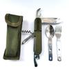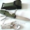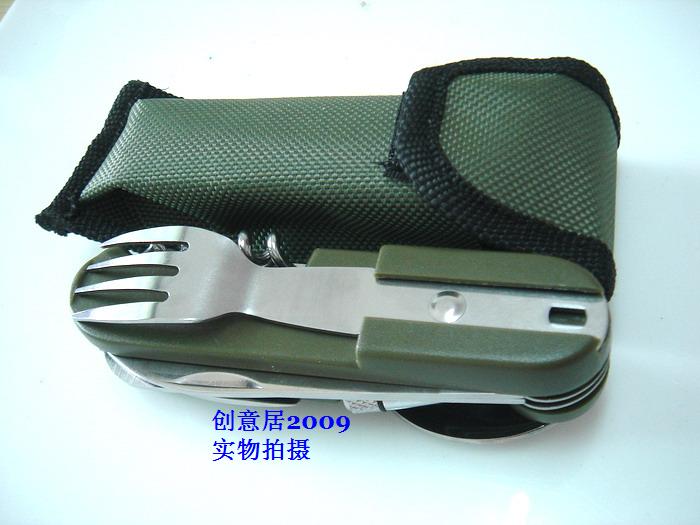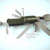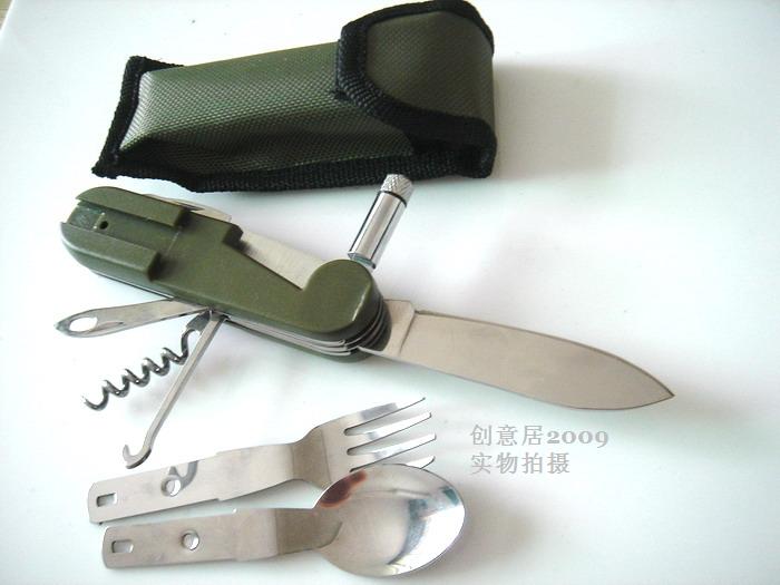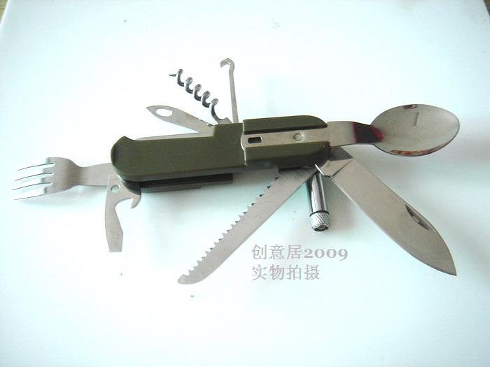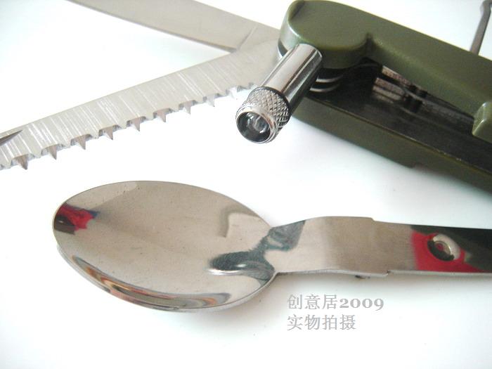 1. Funciones principales:Cuchillo principal de 7.5 cm; abridor de botellas; destornillador de cabeza plana; sacacorchos; aguja de coser grande (para coser redes de pesca, etc.); linterna LED; tenedor de cena; cuchara grande.