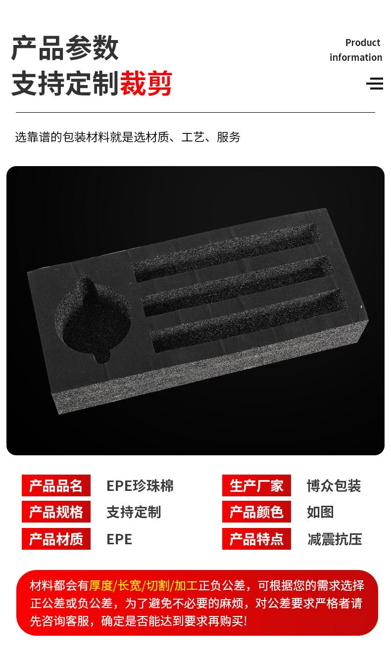 Kunshan Bozhong Packaging Co., Ltd. se encuentra en la calle Shaojing n.° 168, Zona de Desarrollo, ciudad de Kunshan. La empresa produce principalmente láminas y perfiles de algodón perlado EPE. Este nuevo producto se utiliza cada vez más en diversos sectores. Se caracteriza por su ligereza, resistencia a inundaciones, amortiguación, buena resistencia a ácidos y álcalis, etc. Se utiliza principalmente para el embalaje de diversos aparatos electrónicos, equipos electromecánicos de precisión, electrodomésticos, equipos electrónicos de alta sensibilidad, cosméticos, instrumentos ópticos, productos de vidrio, autopartes, calzado y diversas almohadillas para equipaje. Se pueden personalizar diversos estilos según las necesidades del cliente. No dude en contactarnos para negociar.