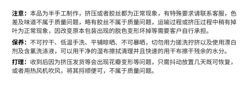 Estimado cliente, nuestra tienda produce y vende al por mayor todo tipo de flores y plantas artificiales. En principio, solo vendemos artículos grandes, pero también aceptamos muestras. Sin embargo, no se admiten devoluciones ni cambios de los productos de muestra. Por ejemplo, si compra solo uno o dos ejemplares de cada tipo, comprar uno o dos de varias variedades se considera una muestra. No se admiten reembolsos. Le rogamos que lo lea detenidamente antes de realizar un pedido. Disculpe las molestias. ¡Gracias por su cooperación!