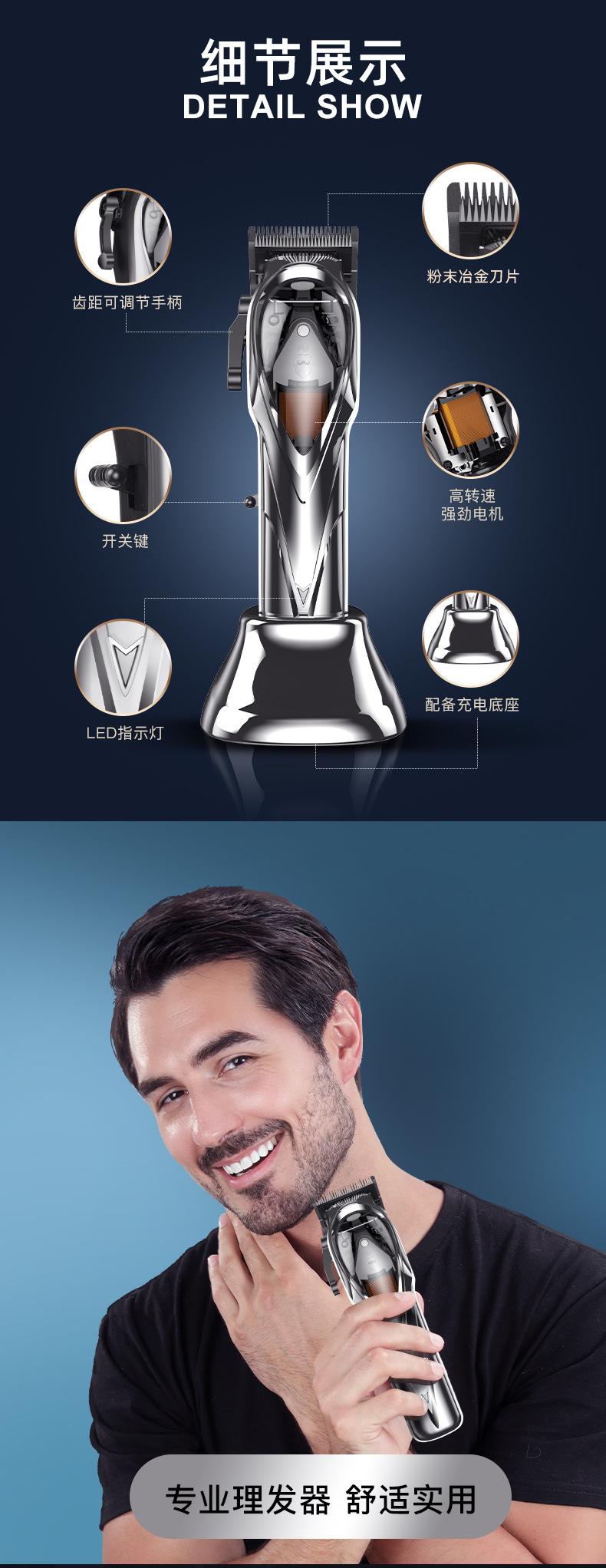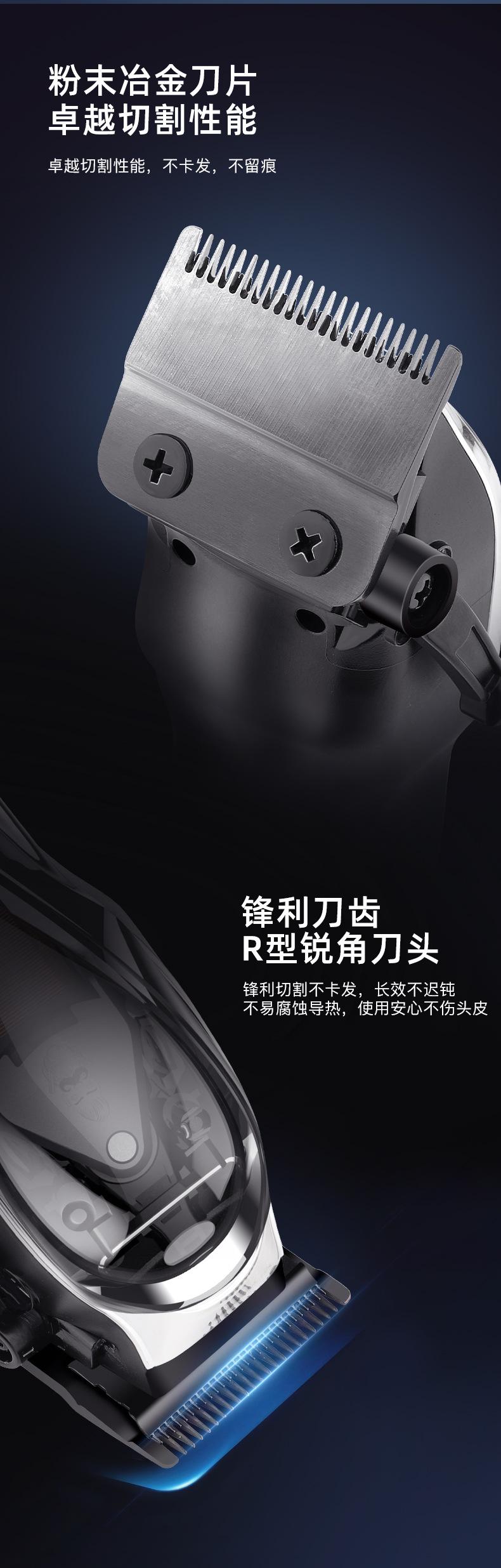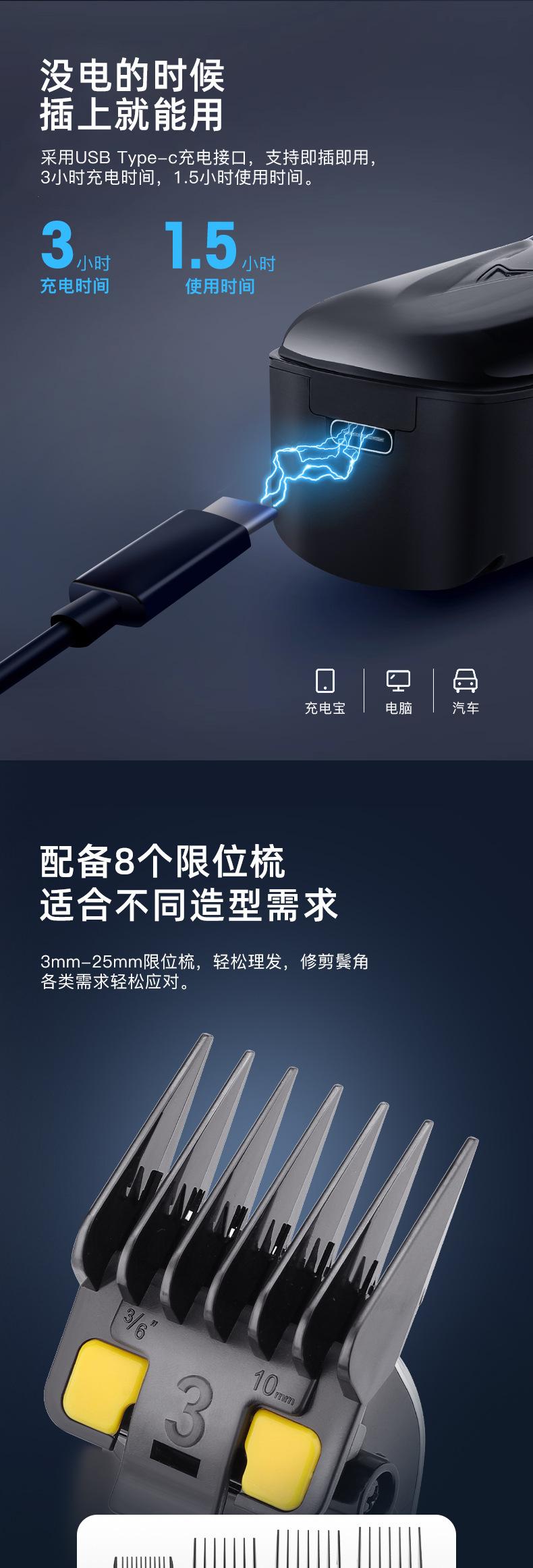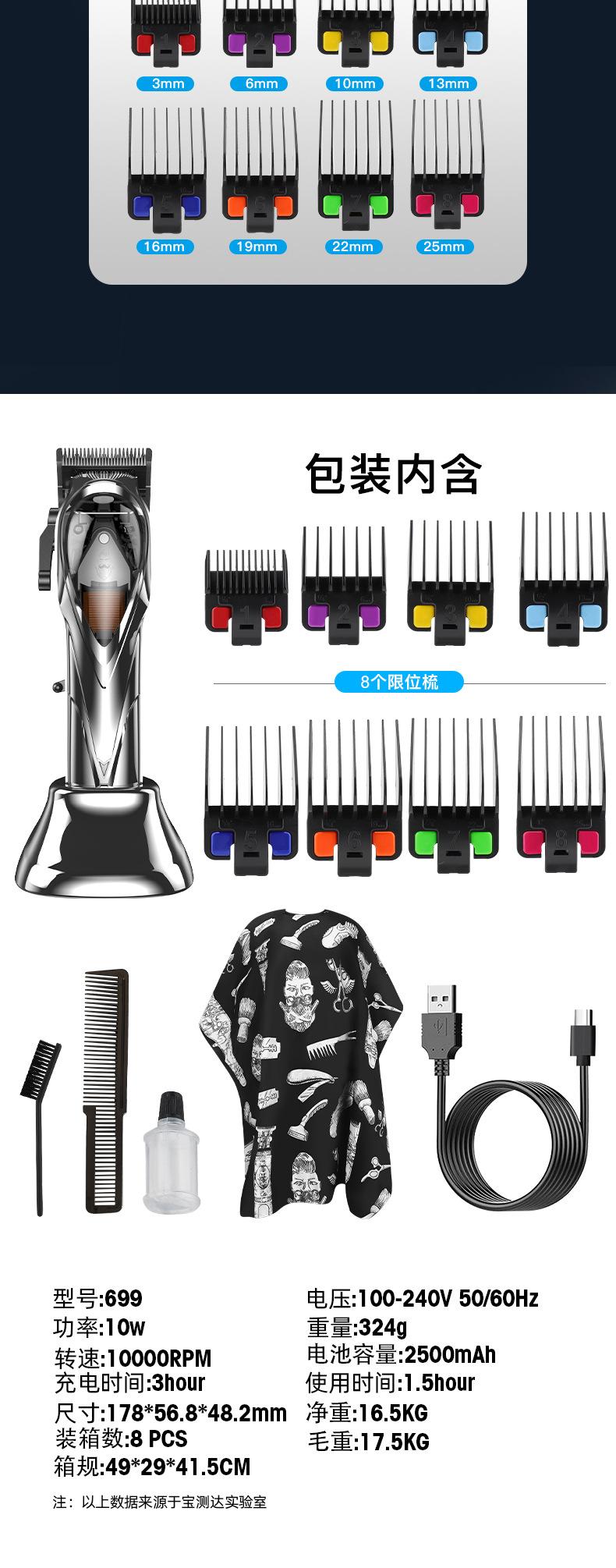 Accesorios del producto: host + cable de carga USB + base de carga + peine guía * 8 (1.5 3 4.5 6 10 13 19 25mm) + cepillo de limpieza + manual en inglés + peine + paño + aceite lubricante de 3 ml;