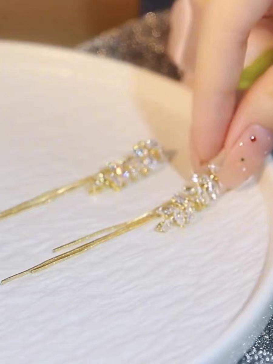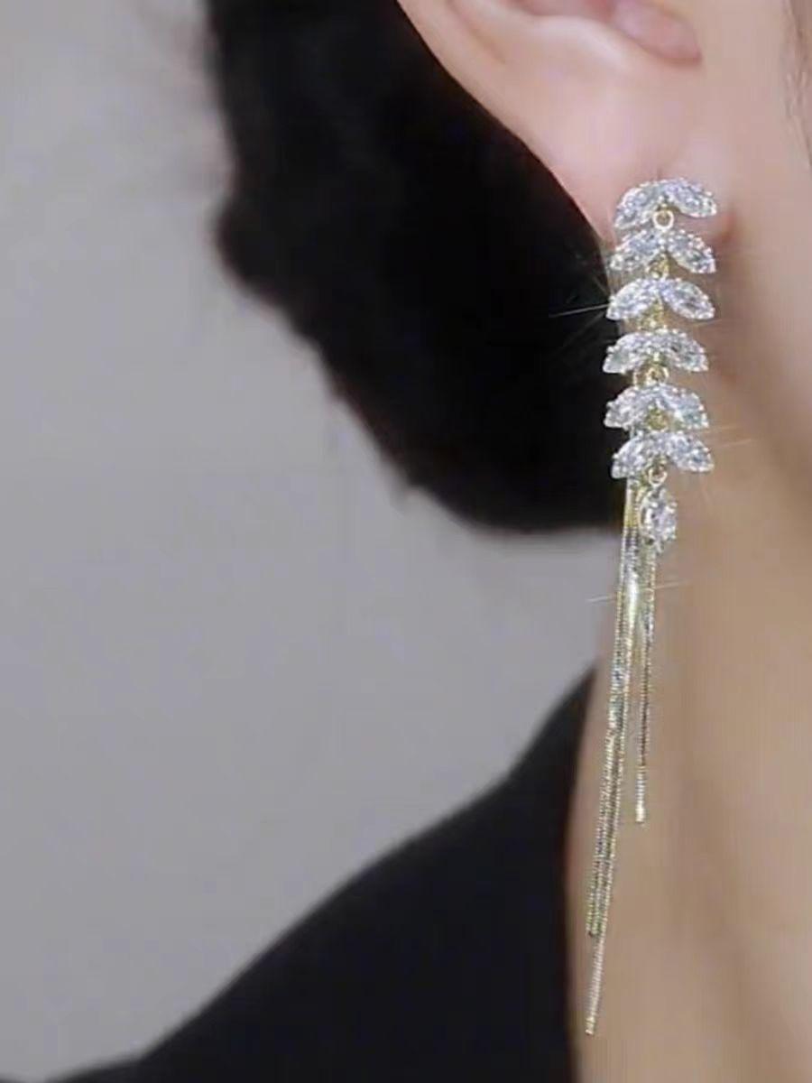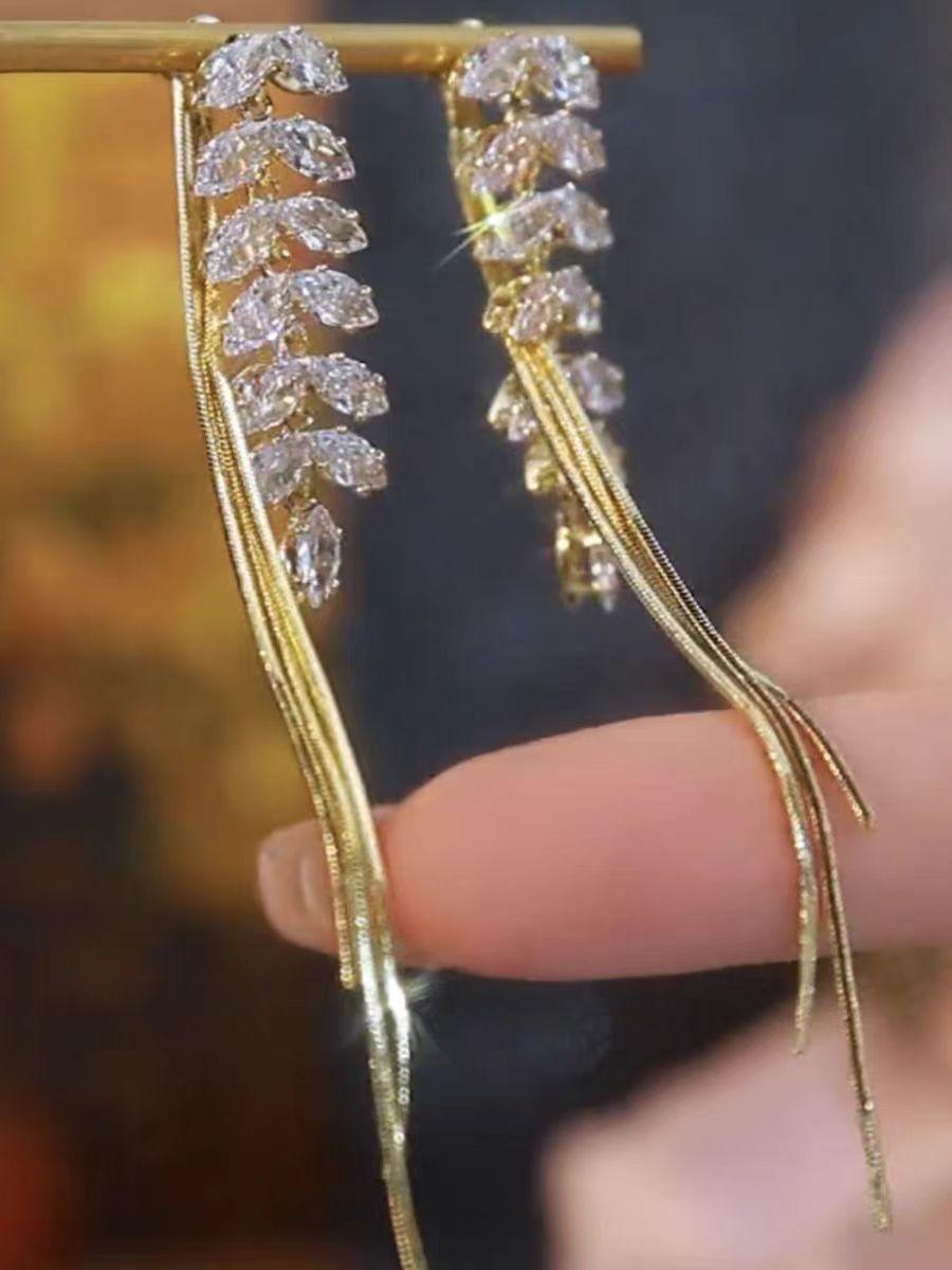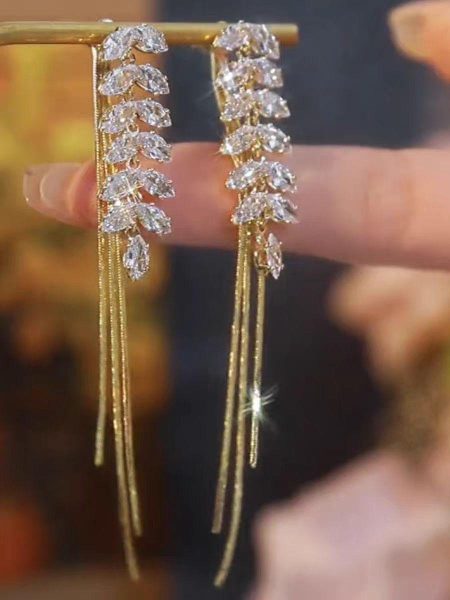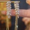 Nuevos aretes de borla de trigo 2023, aretes simples de lujo ligero con líneas de oreja largas de circón de hoja, aretes elegantes de alta gama