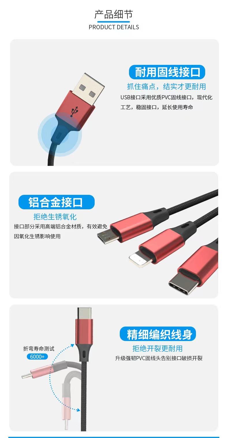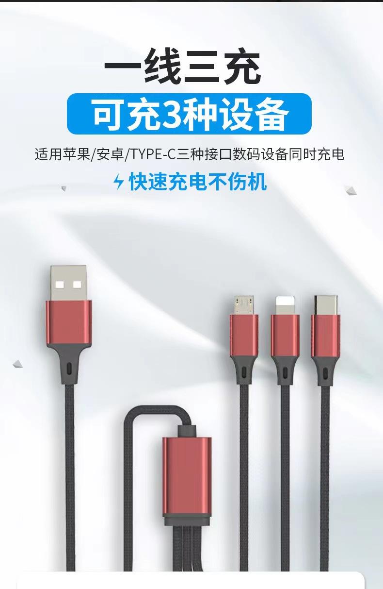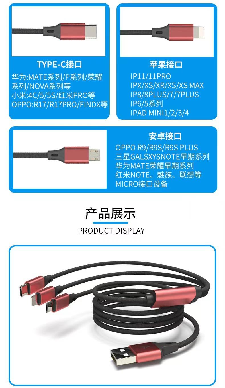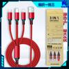 Cable de datos de uno a tres, trenzado de nailon, carga rápida, cable de carga tres en uno para Apple Android, cable tipo C