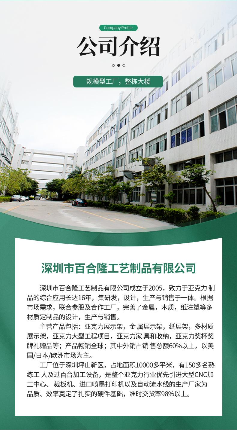 Shenzhen Baihelong Craft Products Co., Ltd. se fundó en 2005. Lleva 15 años especializada en el diseño, la producción y la venta de productos acrílicos. Sus expositores de metal, acrílico y papel, cajas de almacenamiento, artículos para el hogar, trofeos y medallas se venden en todo el mundo.