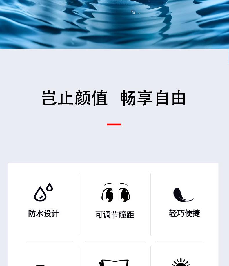 【Características】Gafas de natación de ocio de montura media; diseño de ajuste 3D, sin presión en los ojos, sin fugas de agua, cómodas de llevar; lentes HD, visión clara, protección UV y protección UV400, lentes galvanizadas para prevenir el deslumbramiento; tecnología antivaho mejorada para antivaho más duradero; puente nasal integrado, TPU super tenacidad